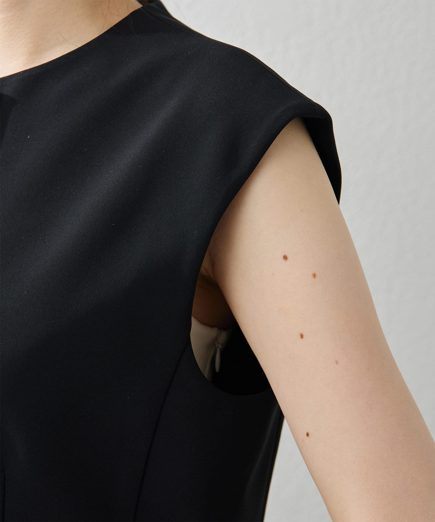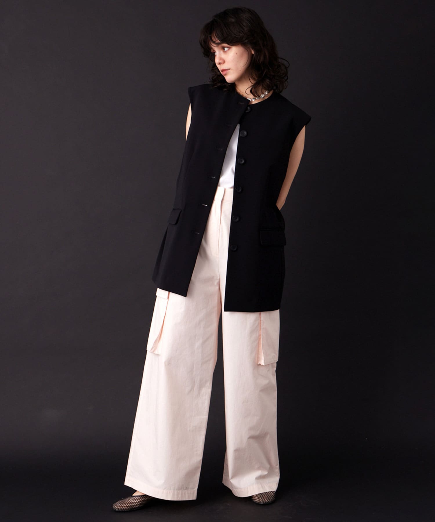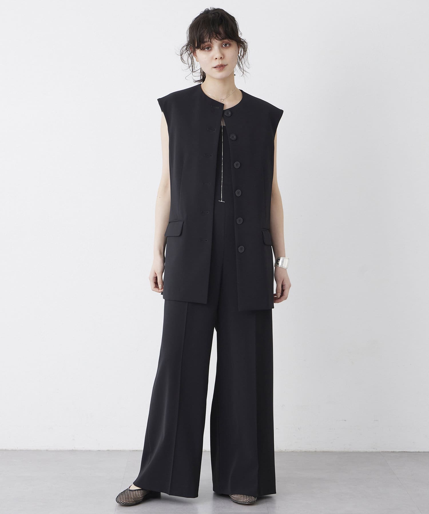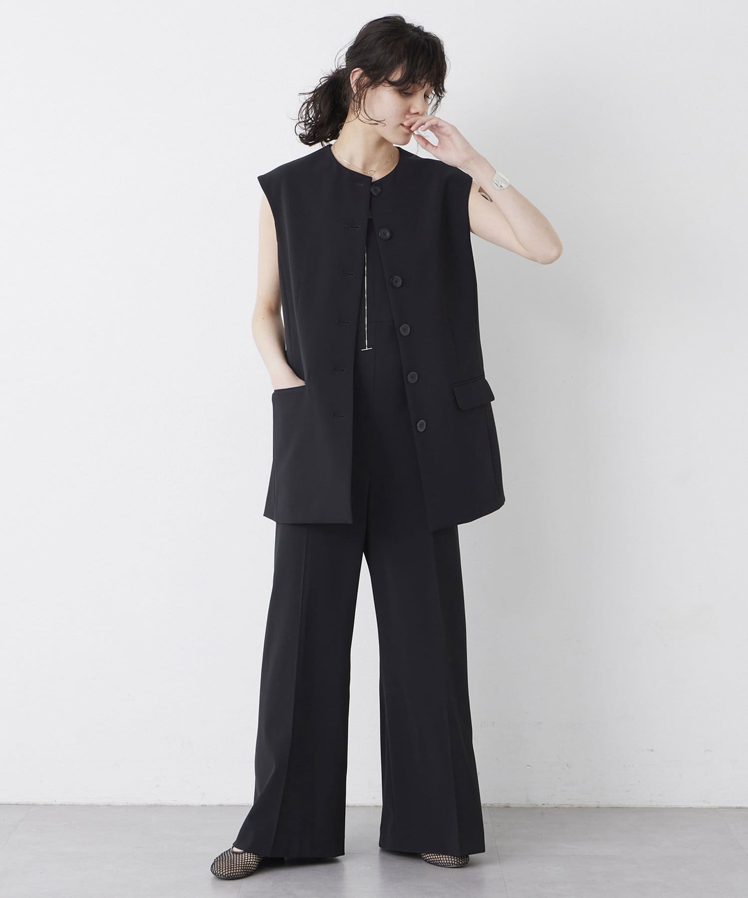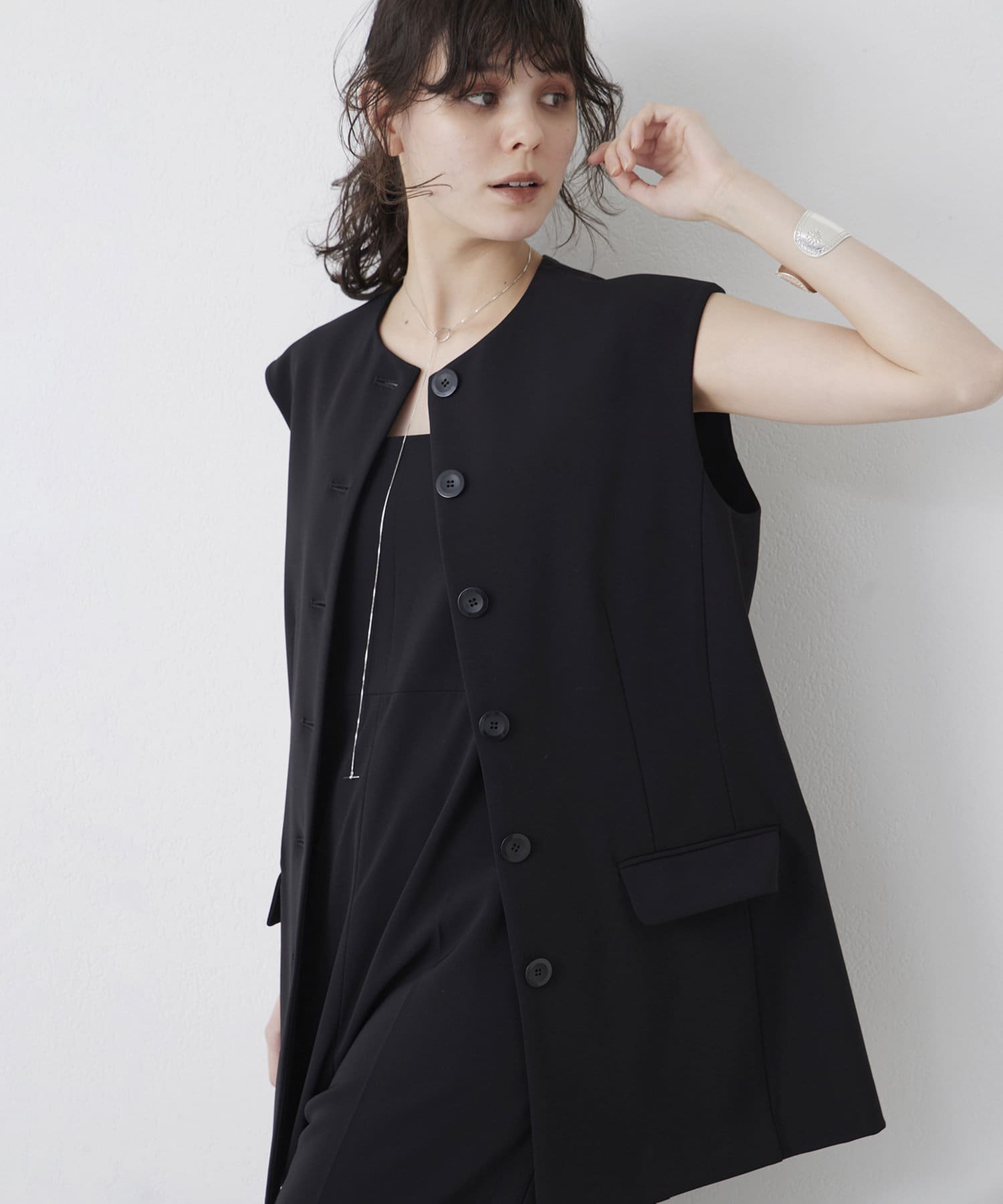 ■ウエストをシェイプさせた細身のデザインや、クルーネック、同色の釦など、ややモードでシックな印象に。