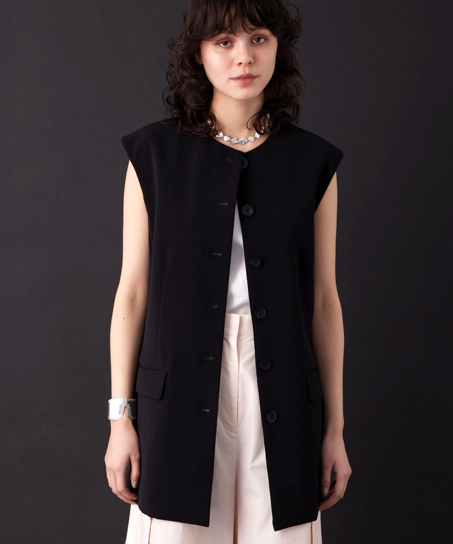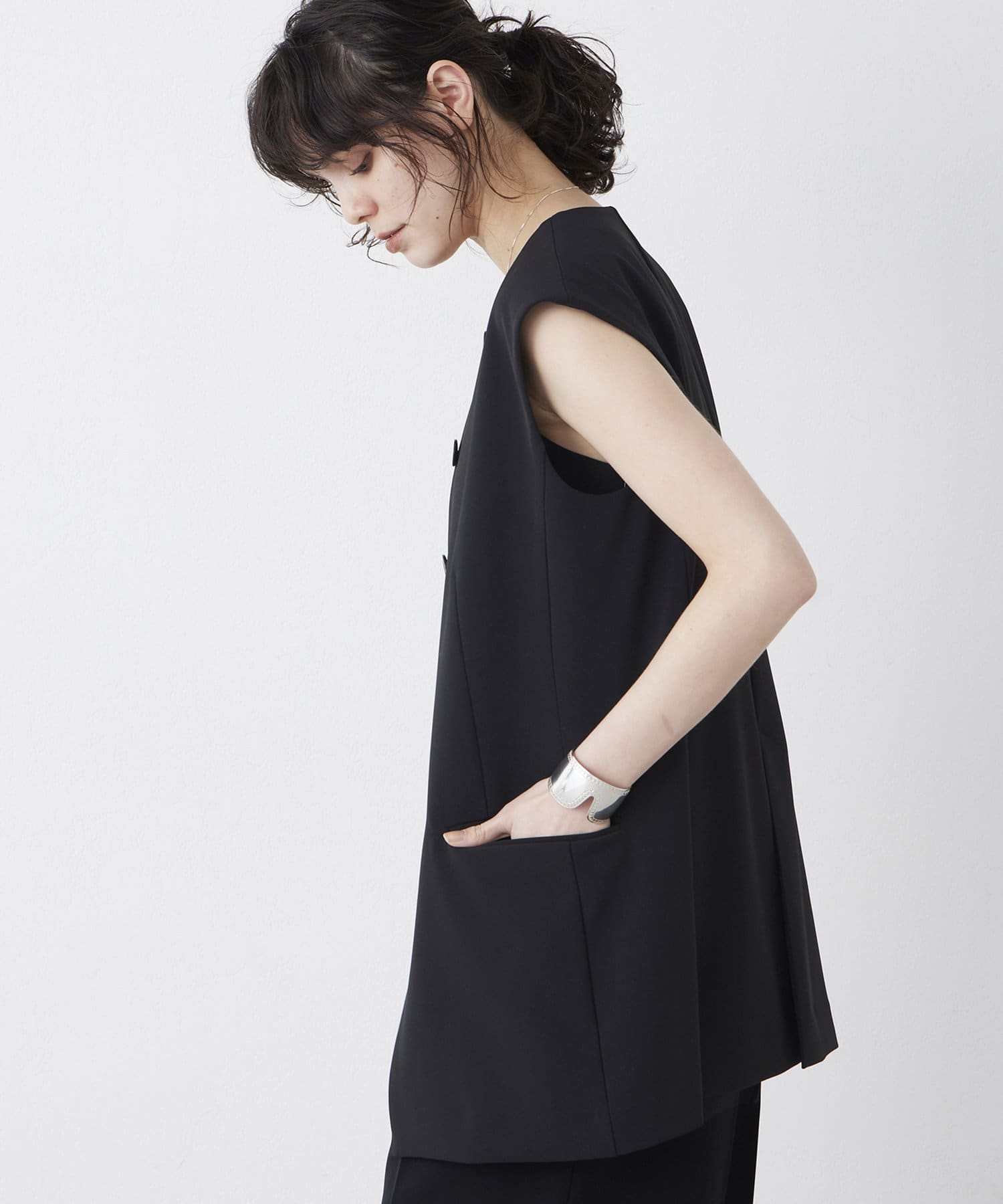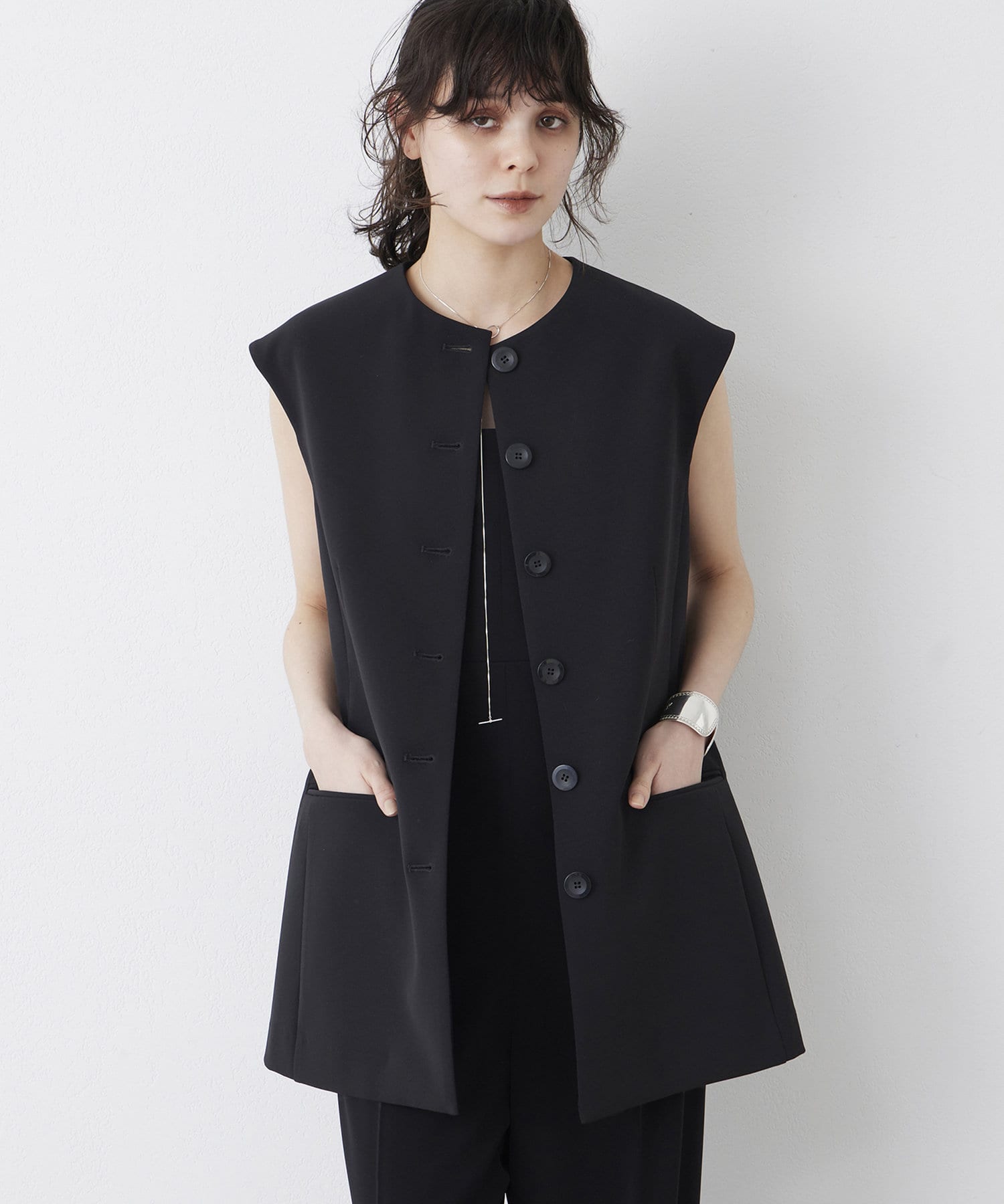 ■膨らみのあるダブルクロス素材を使用したクルーネックジレ。