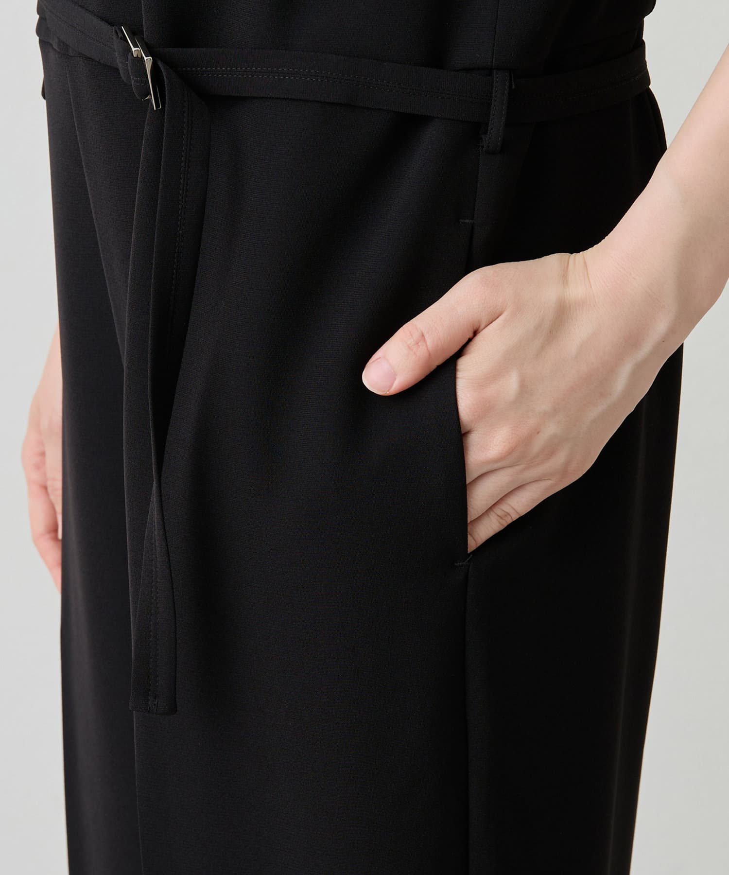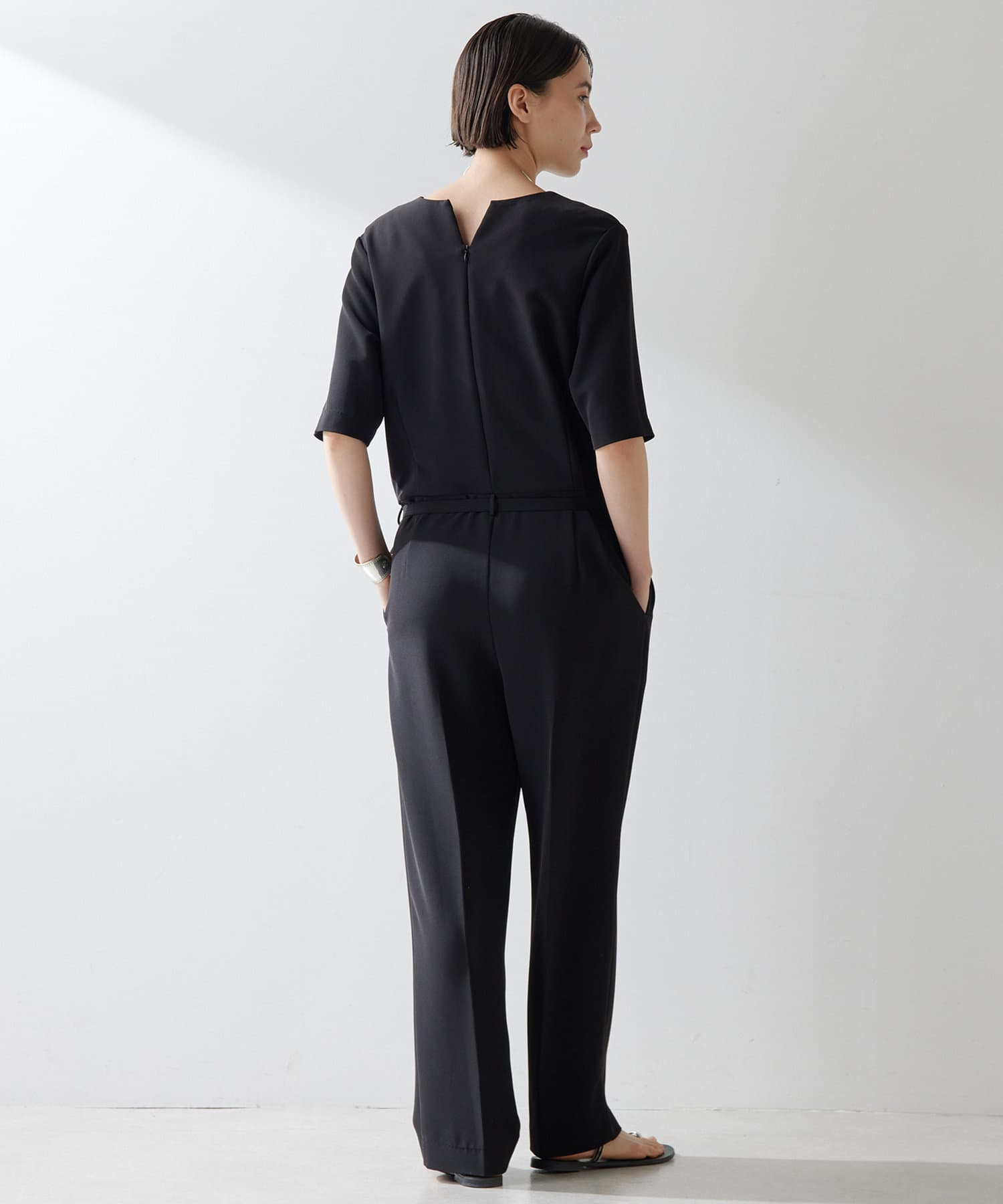 5部丈のお袖、Vネック、落ち感のある生地、センタープレスのパンツ部分と求めている要素ばかりでしたので、思い切って試着無しでネット購入してしまいました。結果、後悔無しのいいお買い物になり、本当に嬉しいです。ベルトループのついている低めで付属のベルトをするのも、おしゃれでいいのですが、私は骨格ストレートなので、ベルトループに通さず、ウエストもしくは若干ウエストより上の位置でベルトをすると更にスッキリ見えます。生地が黒なので、ベルト位置を変えても、悪目立ちはしませんでした。年齢を問わず、スッキリ、そしてハンサムに着れるオールインワンだと思います!※パンツの裾はお直しはせず、4センチヒールを履くと丁度いい感じでした。