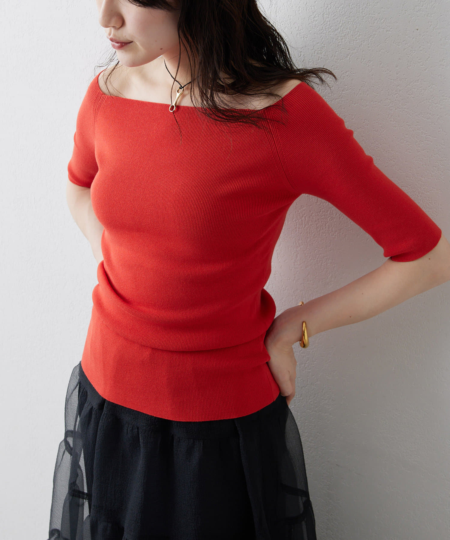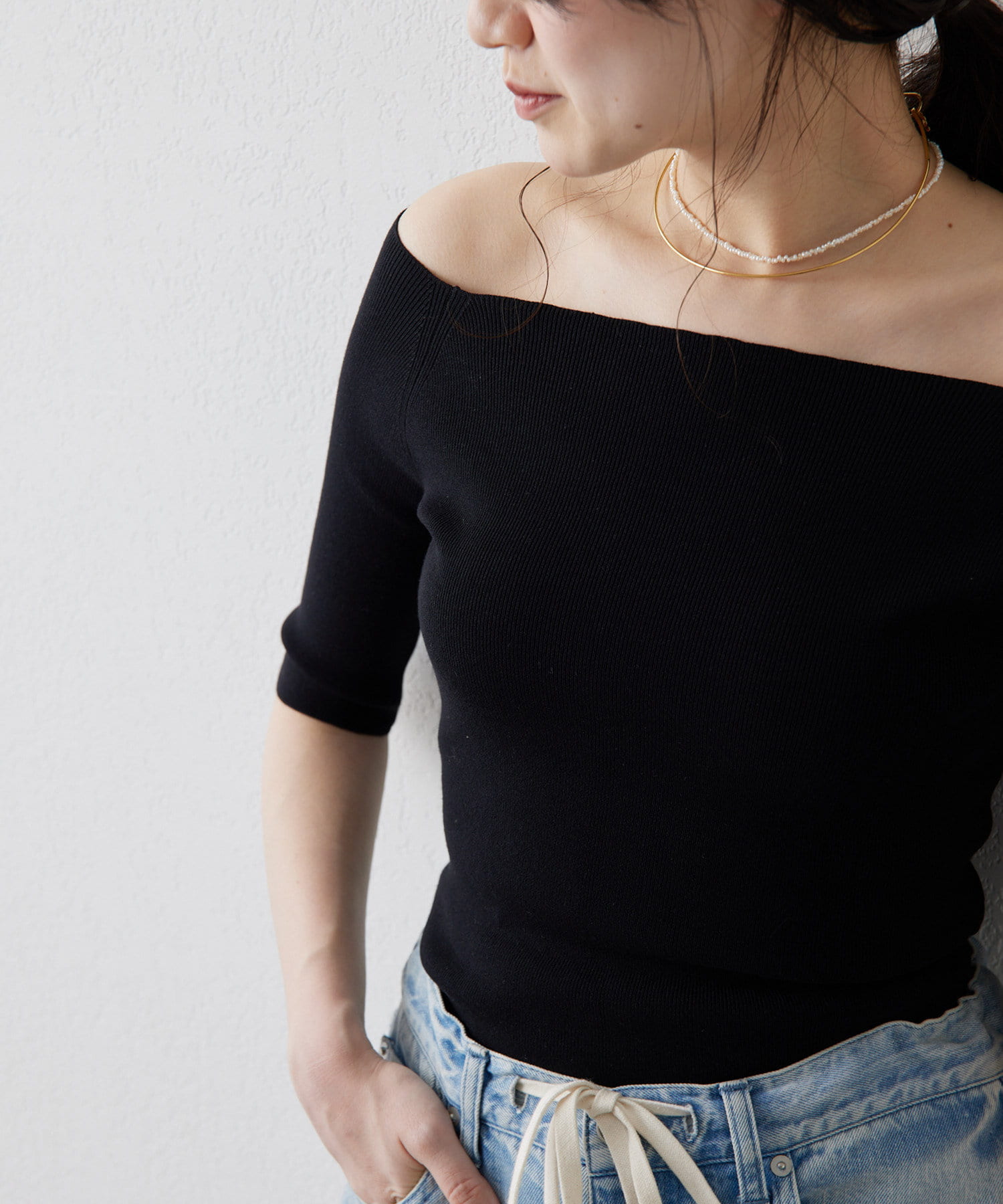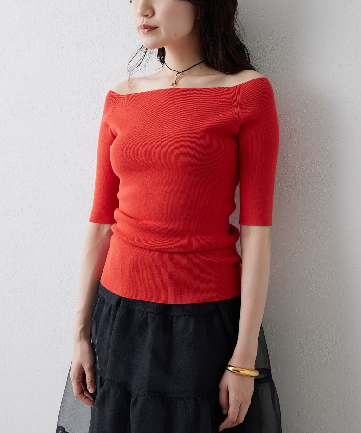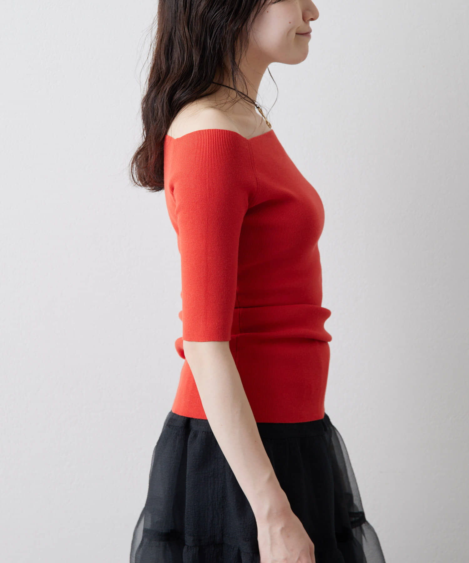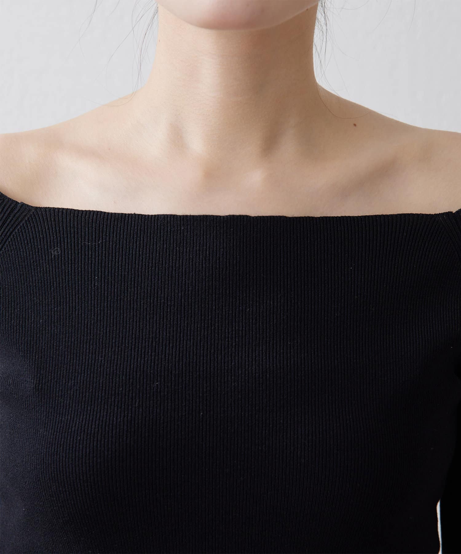 ■ボートネックとしてもオフショルダーとしても楽しめる2way仕様もポイント。