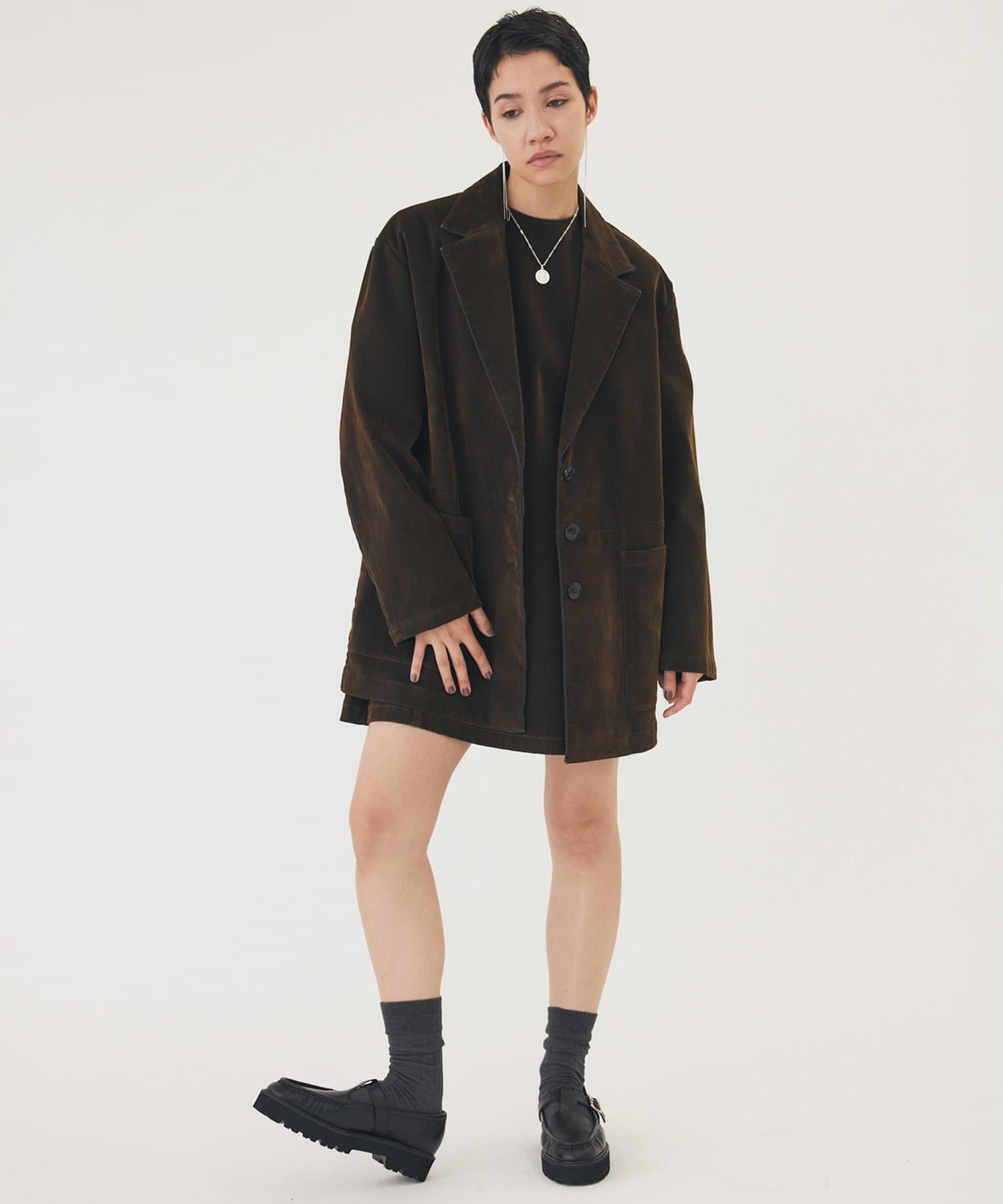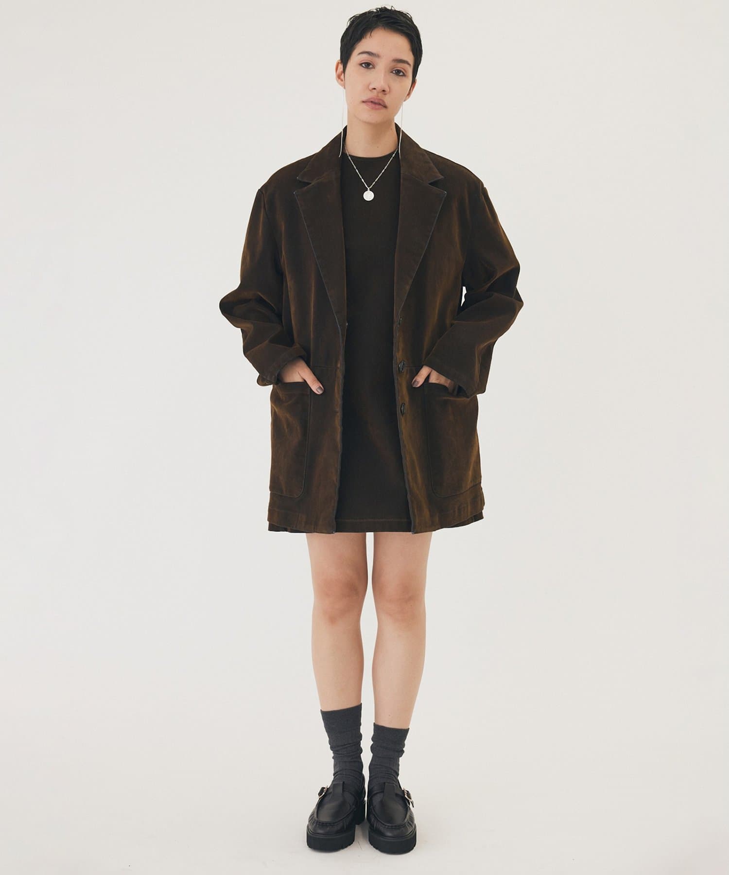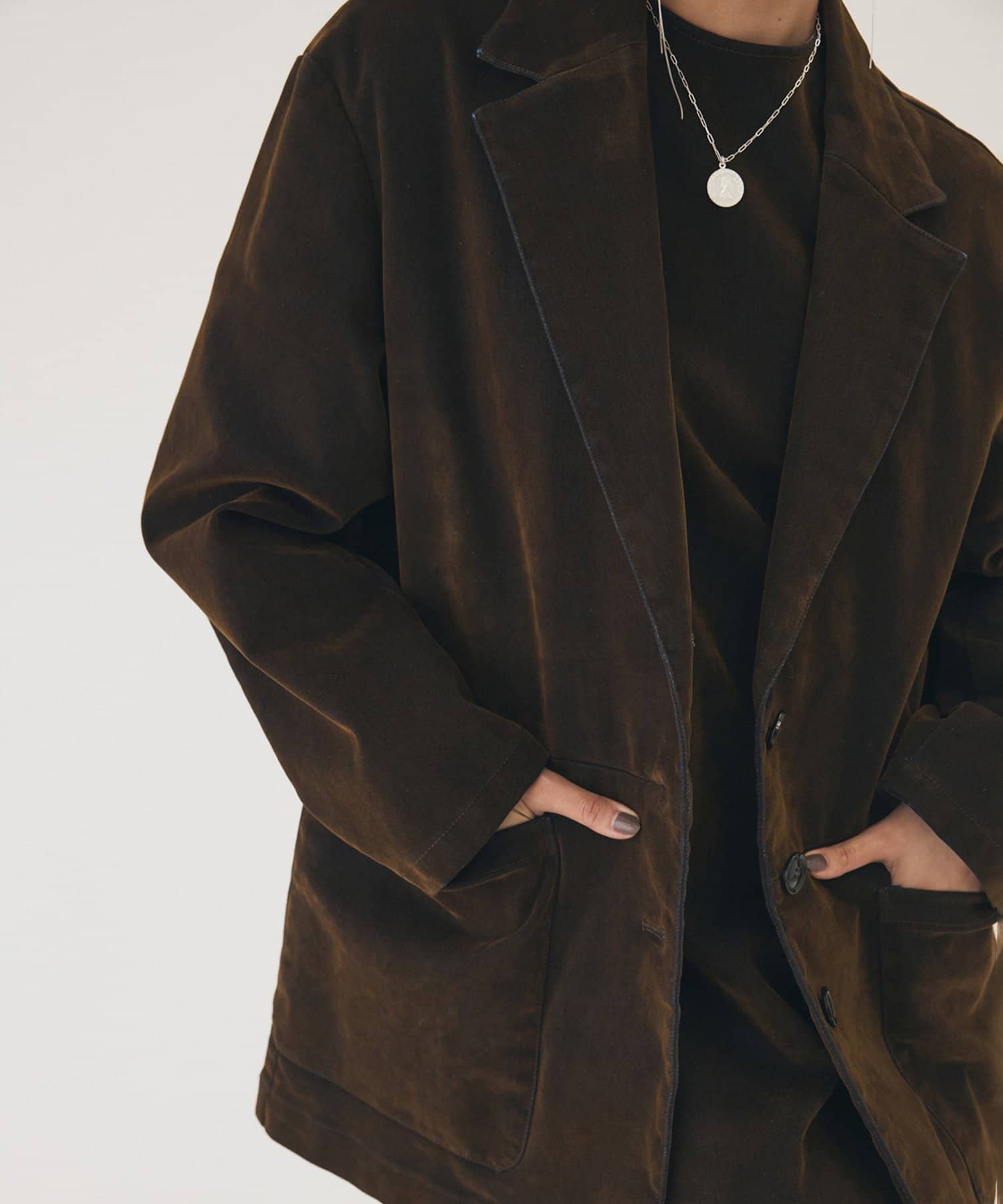 ■肩幅を広めにしたボックスシルエットでメンズライクな雰囲気に仕上げたデザイン。