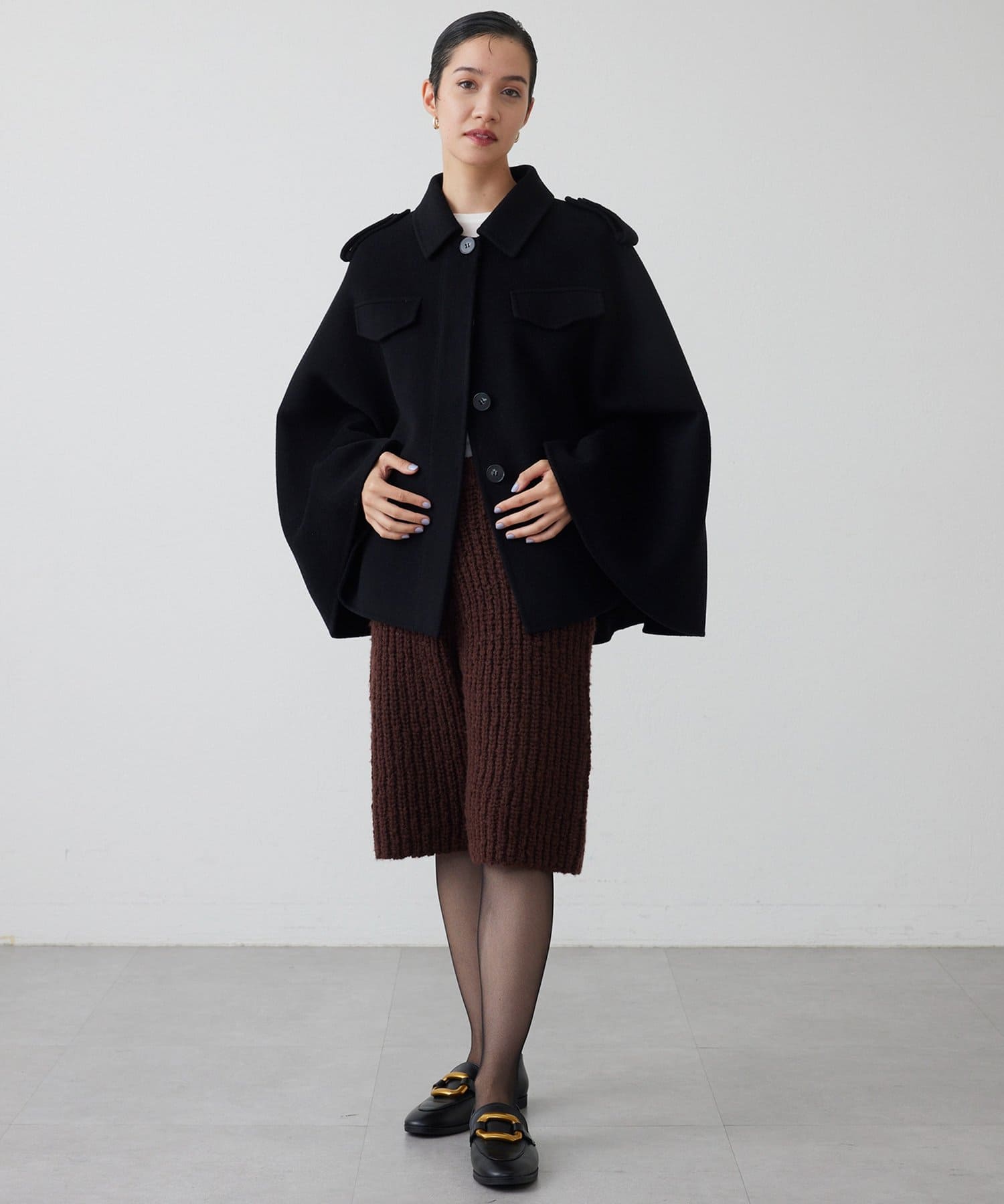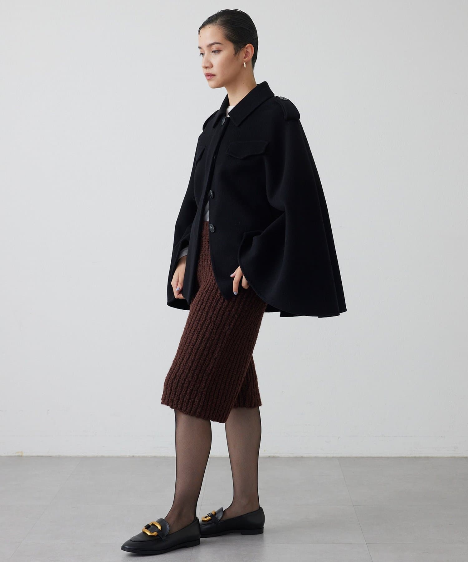 ■膝が隠れる丈感でカジュアルになりすぎず、ブーツやローファー、パンプスなど様々なシューズを合わせやすい一着。