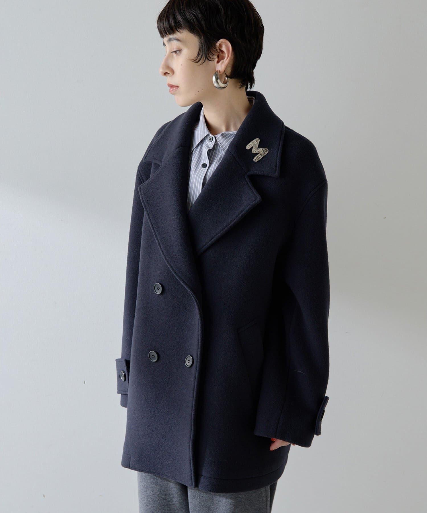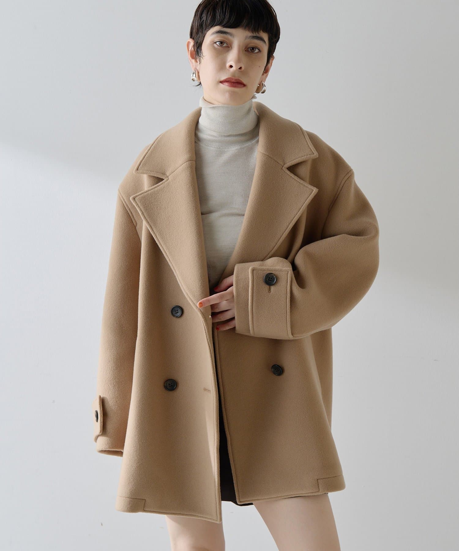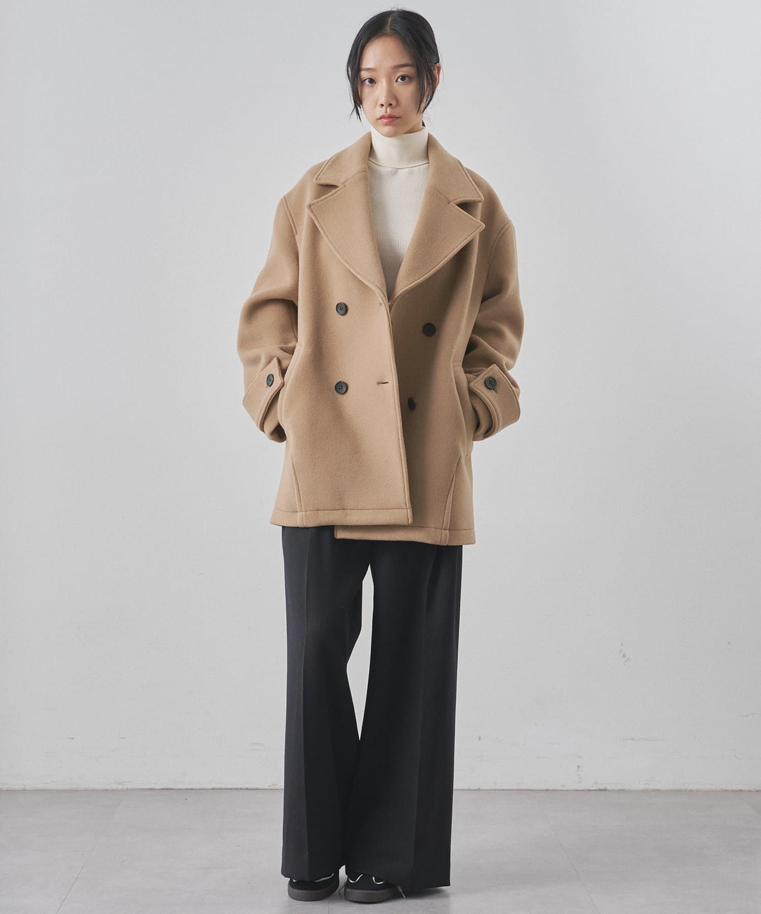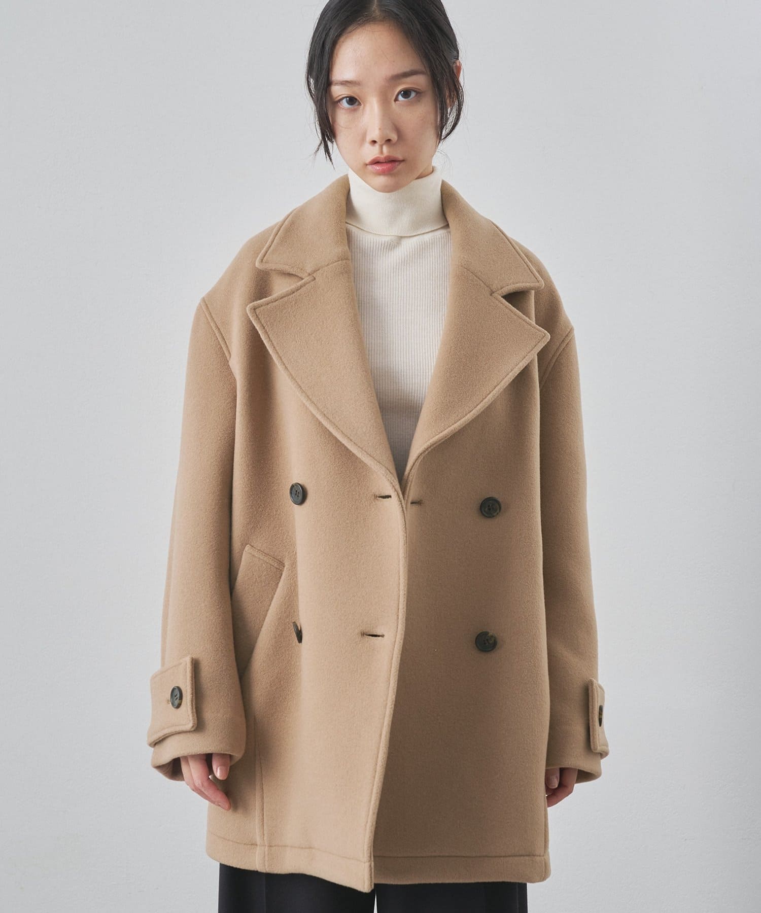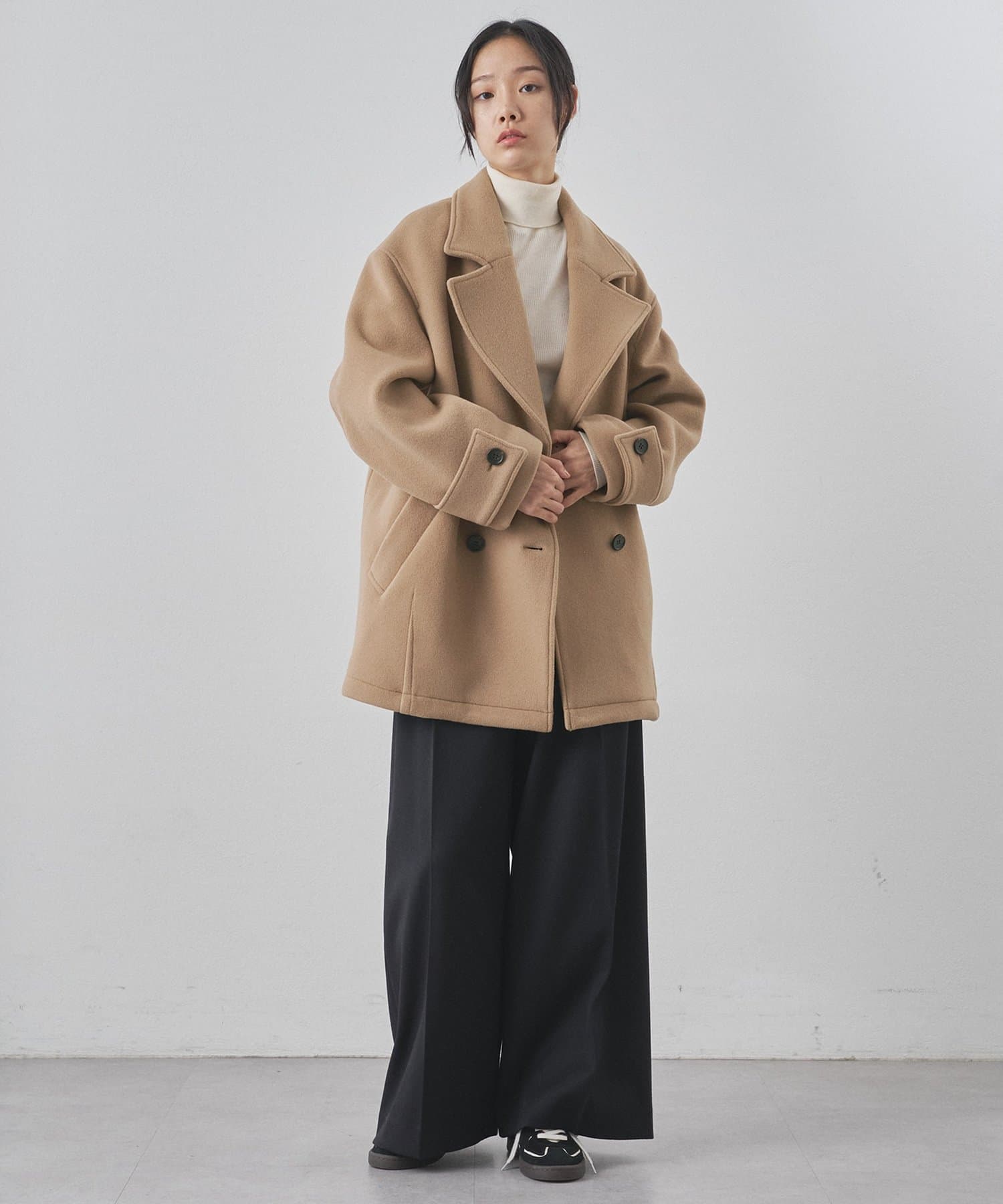 ■ミドル丈で仕上げたオーバーサイズのPコート。
