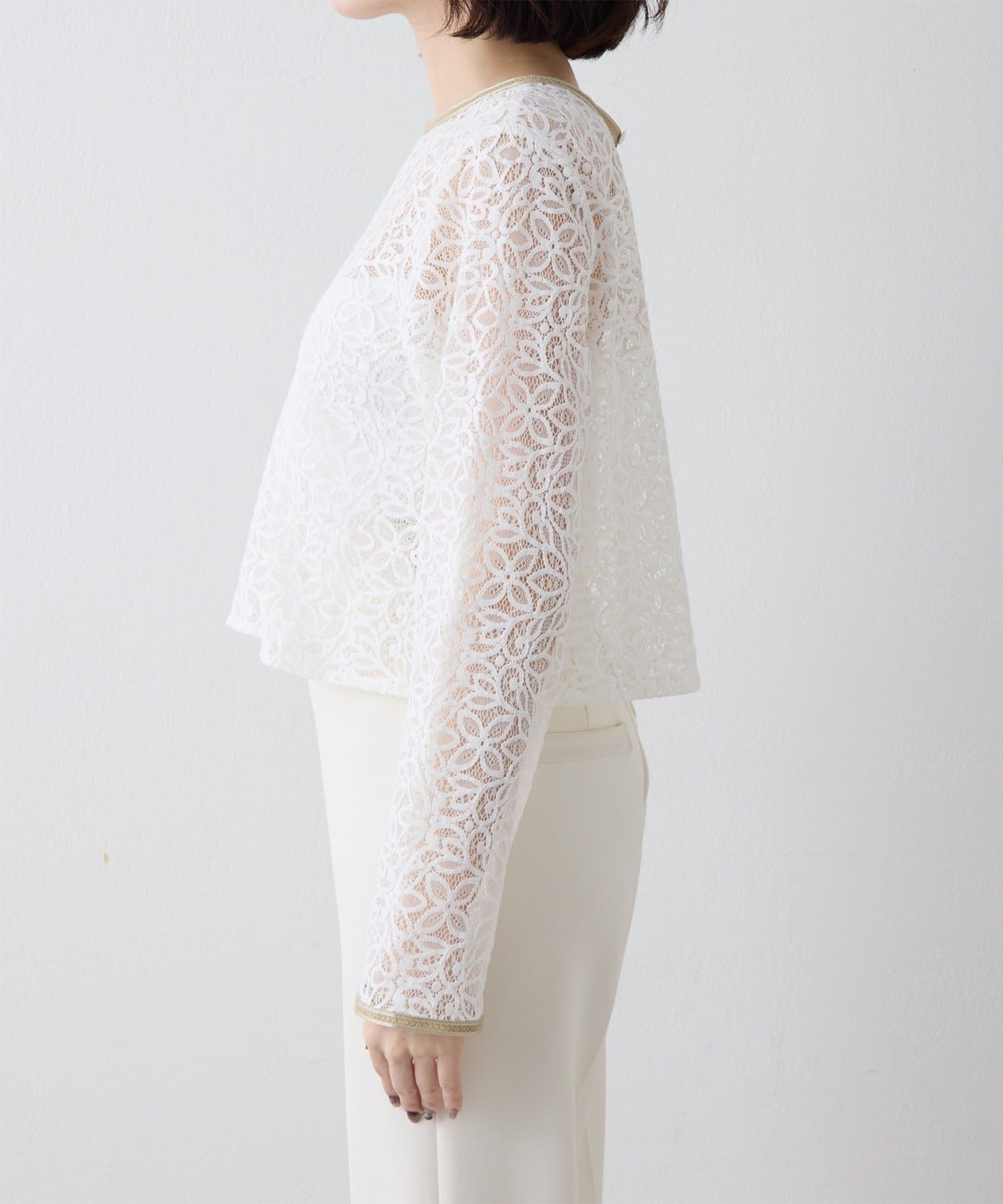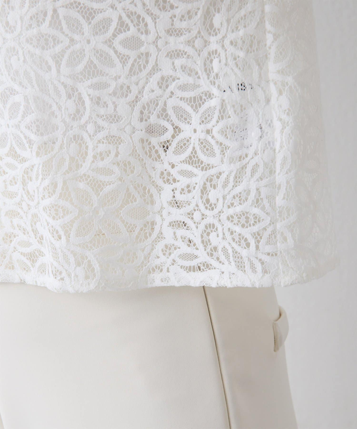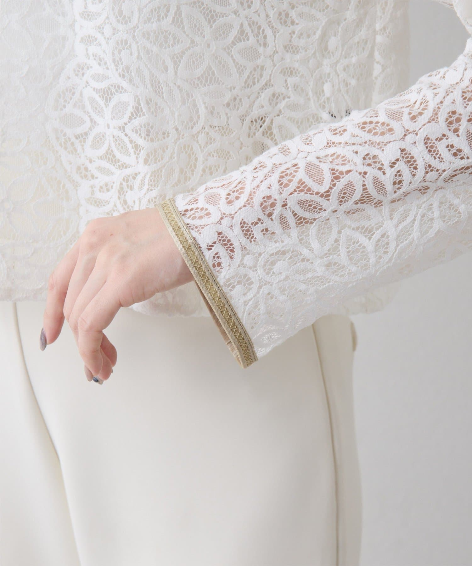 ■ボタニカル柄のレースを使用したクルーネックブラウス。