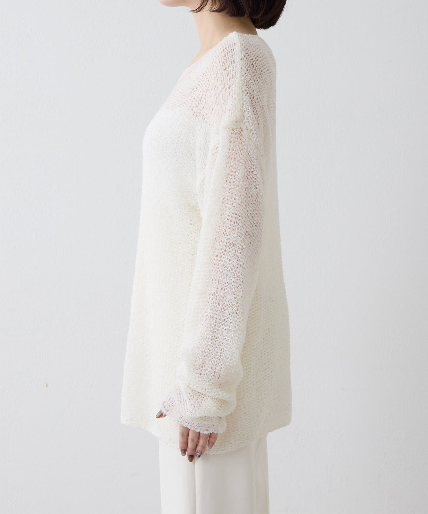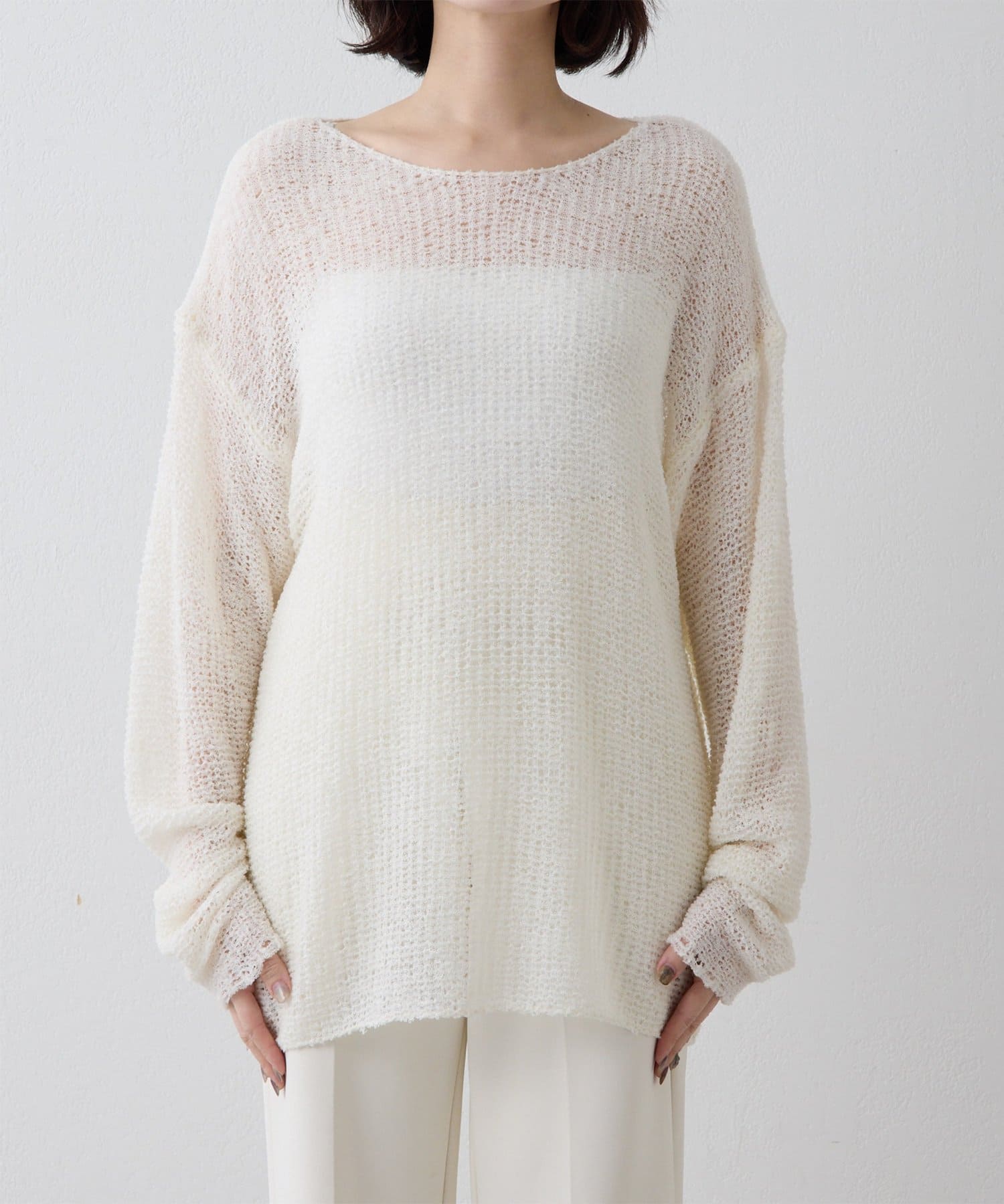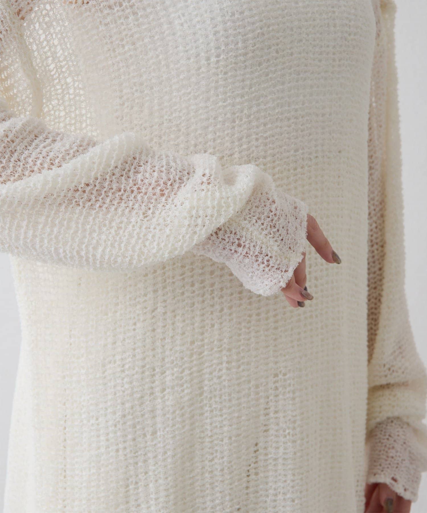 ■ローゲージで編まれたメッシュニットプルオーバー。