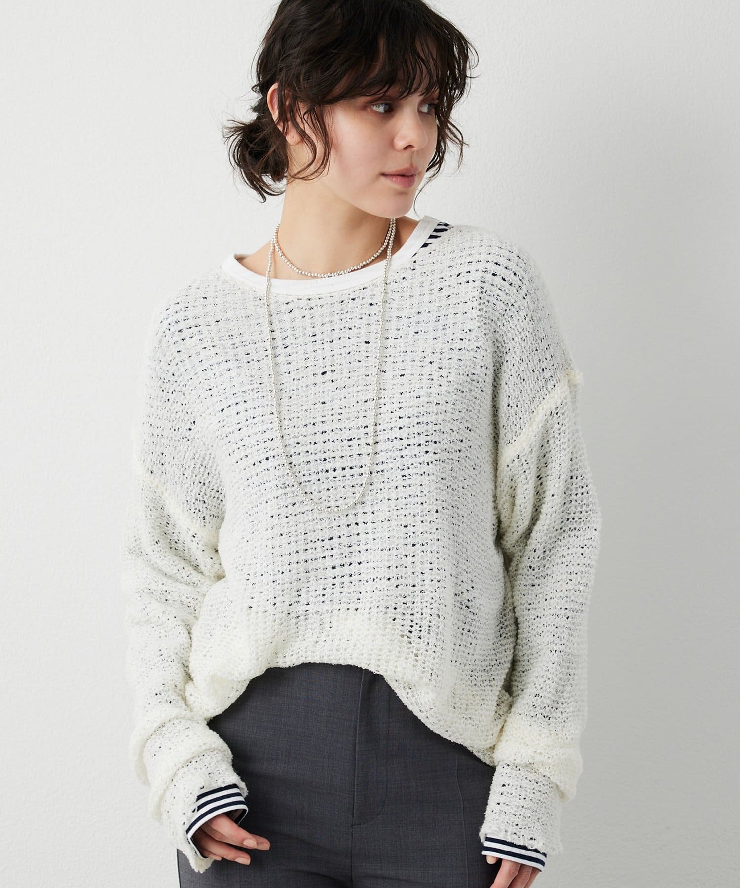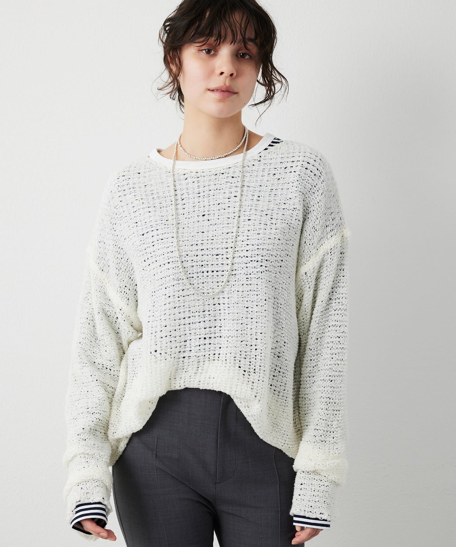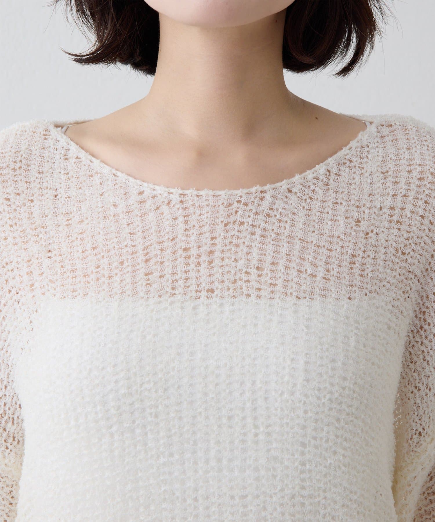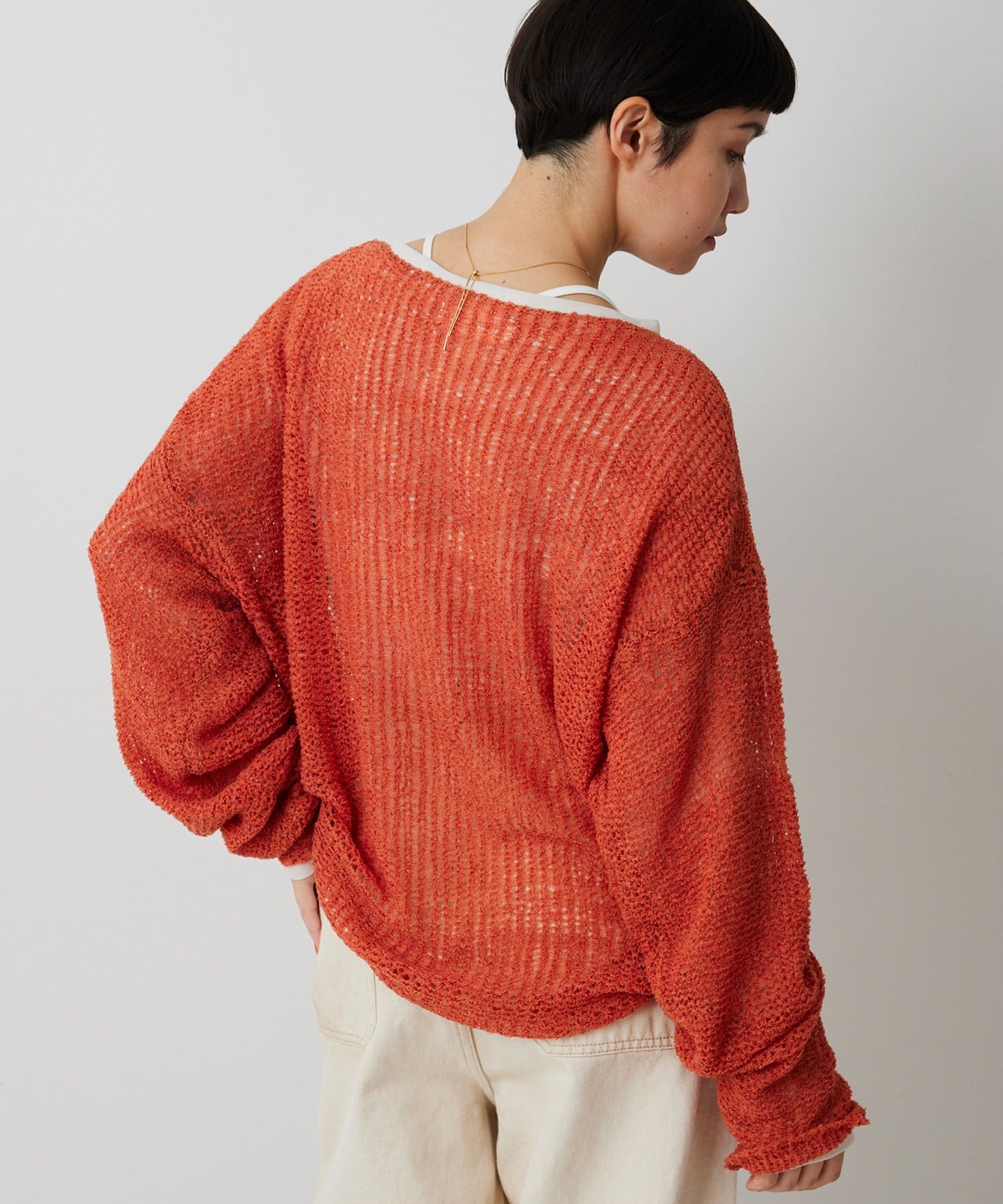 ■ローゲージで編まれたメッシュニットプルオーバー。