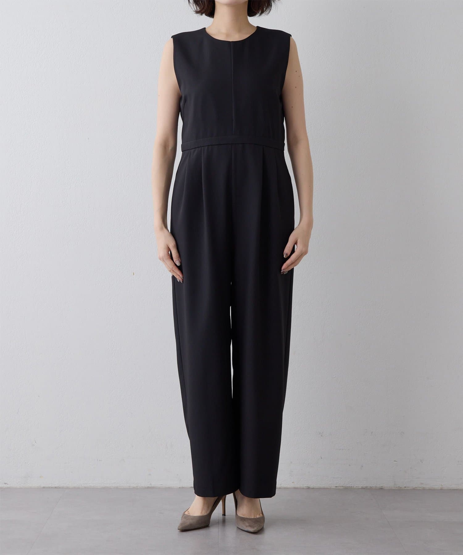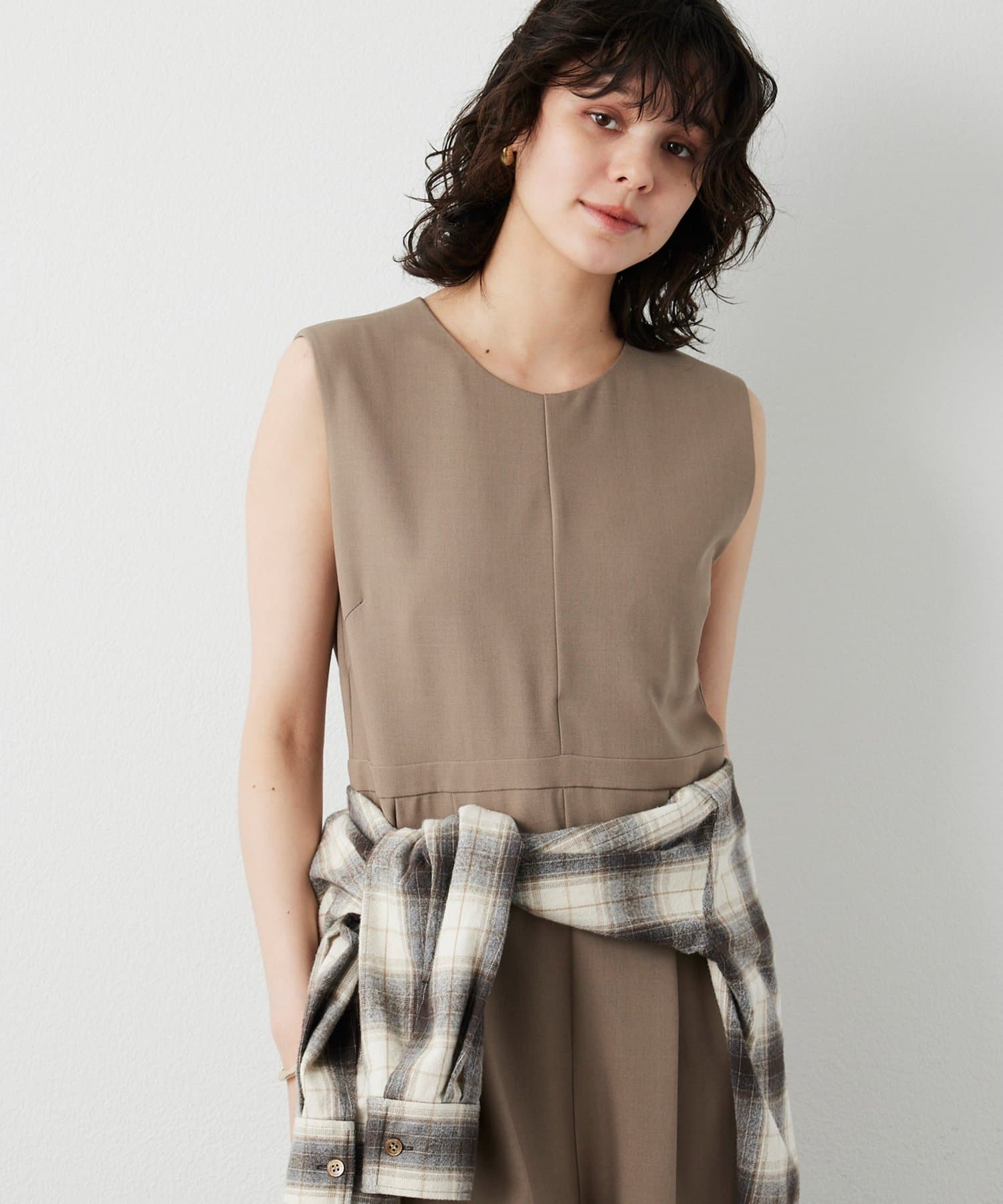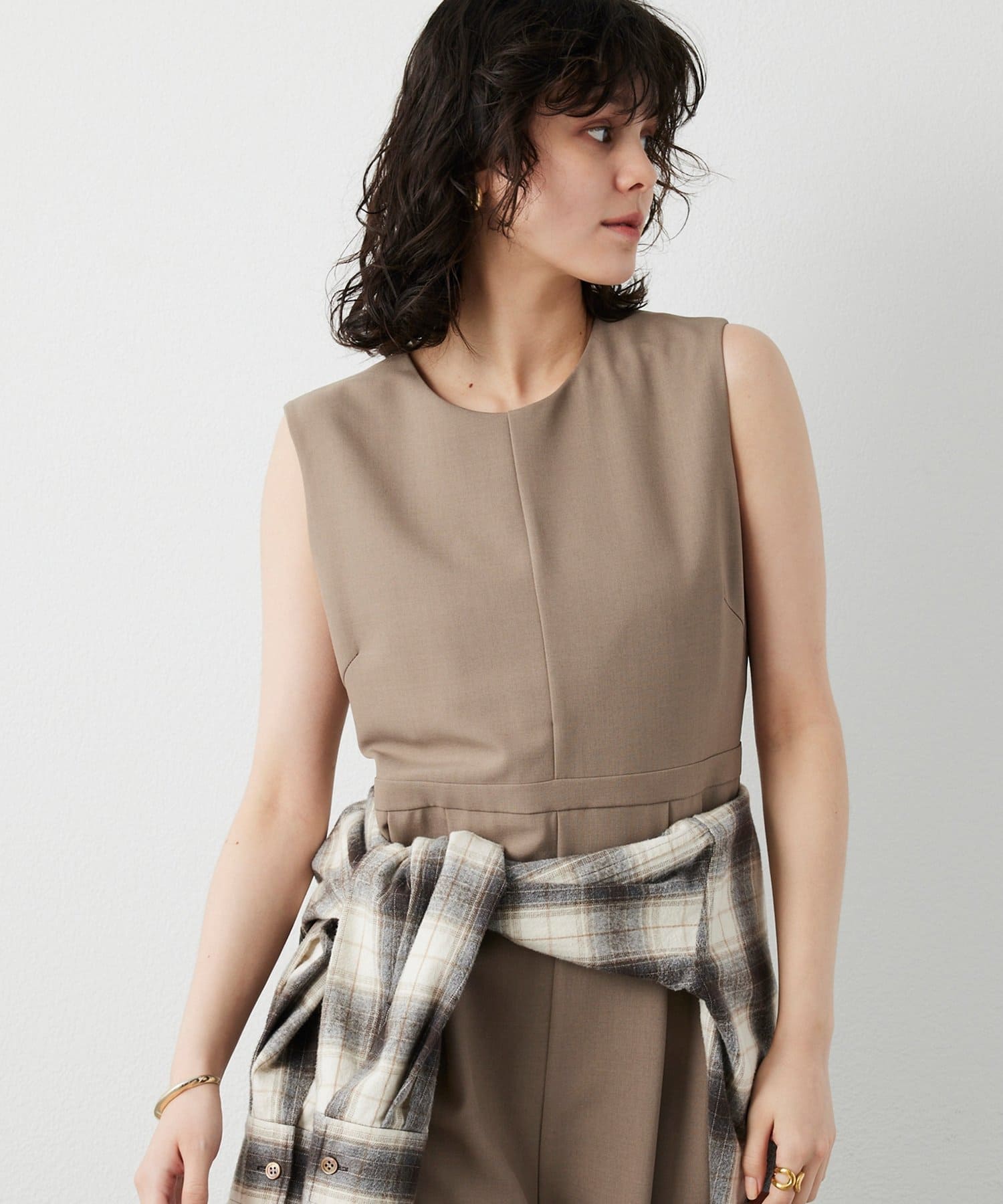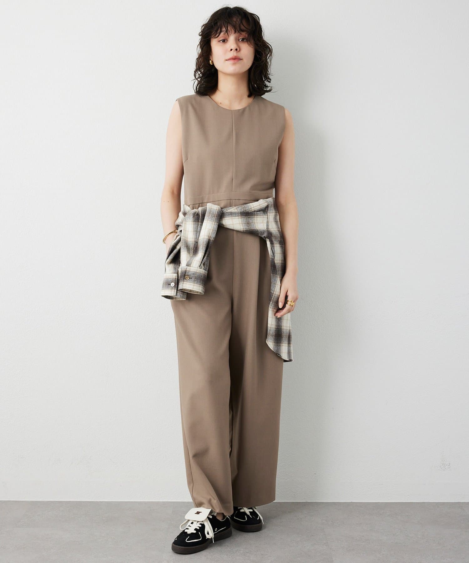 ■コンビネゾンは、ウエストにダーツを入れ程よい開きのクルーネックですっきりとした印象。