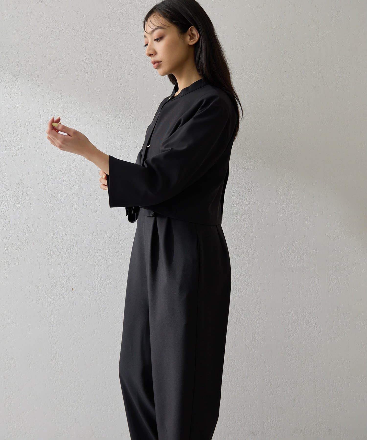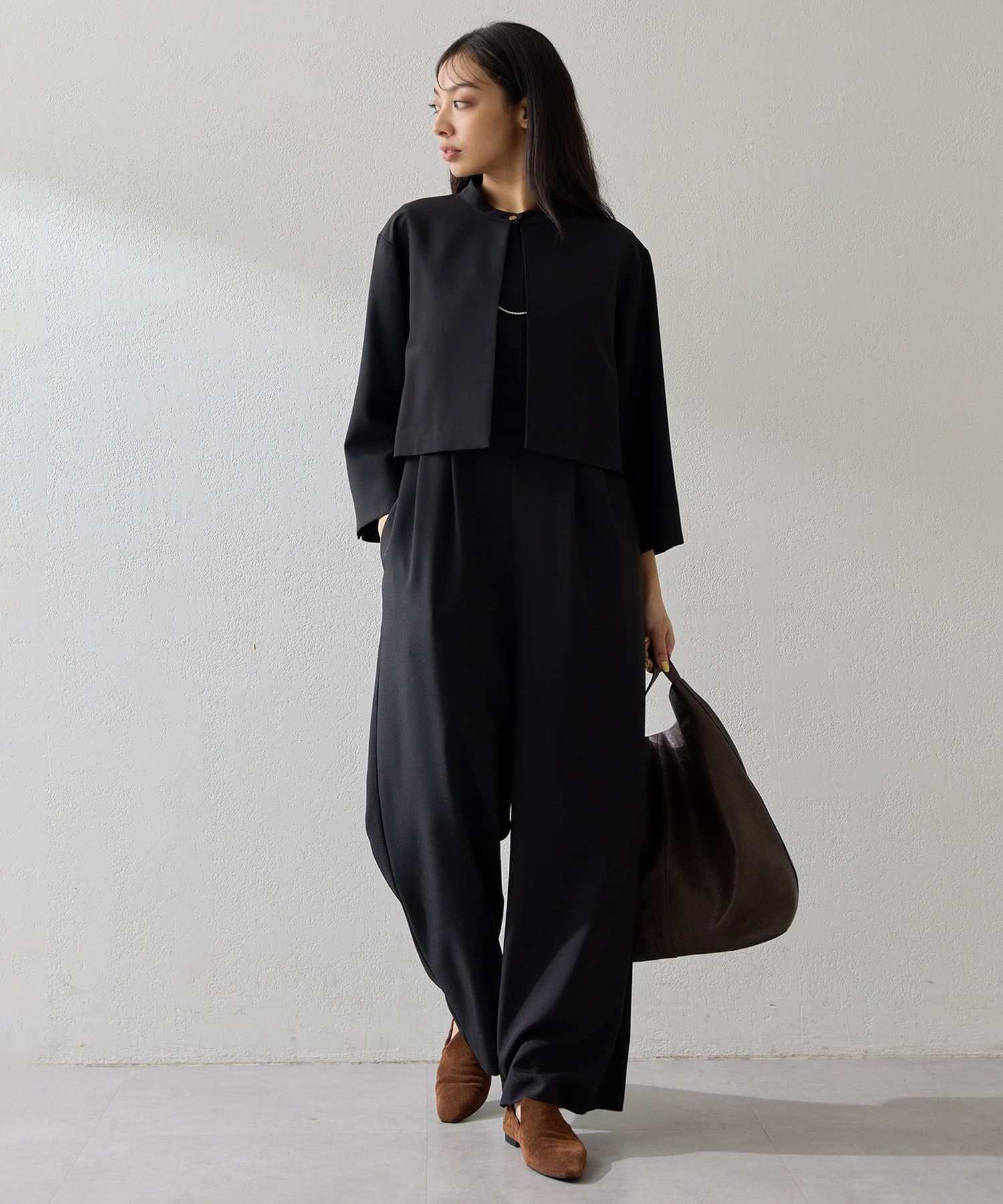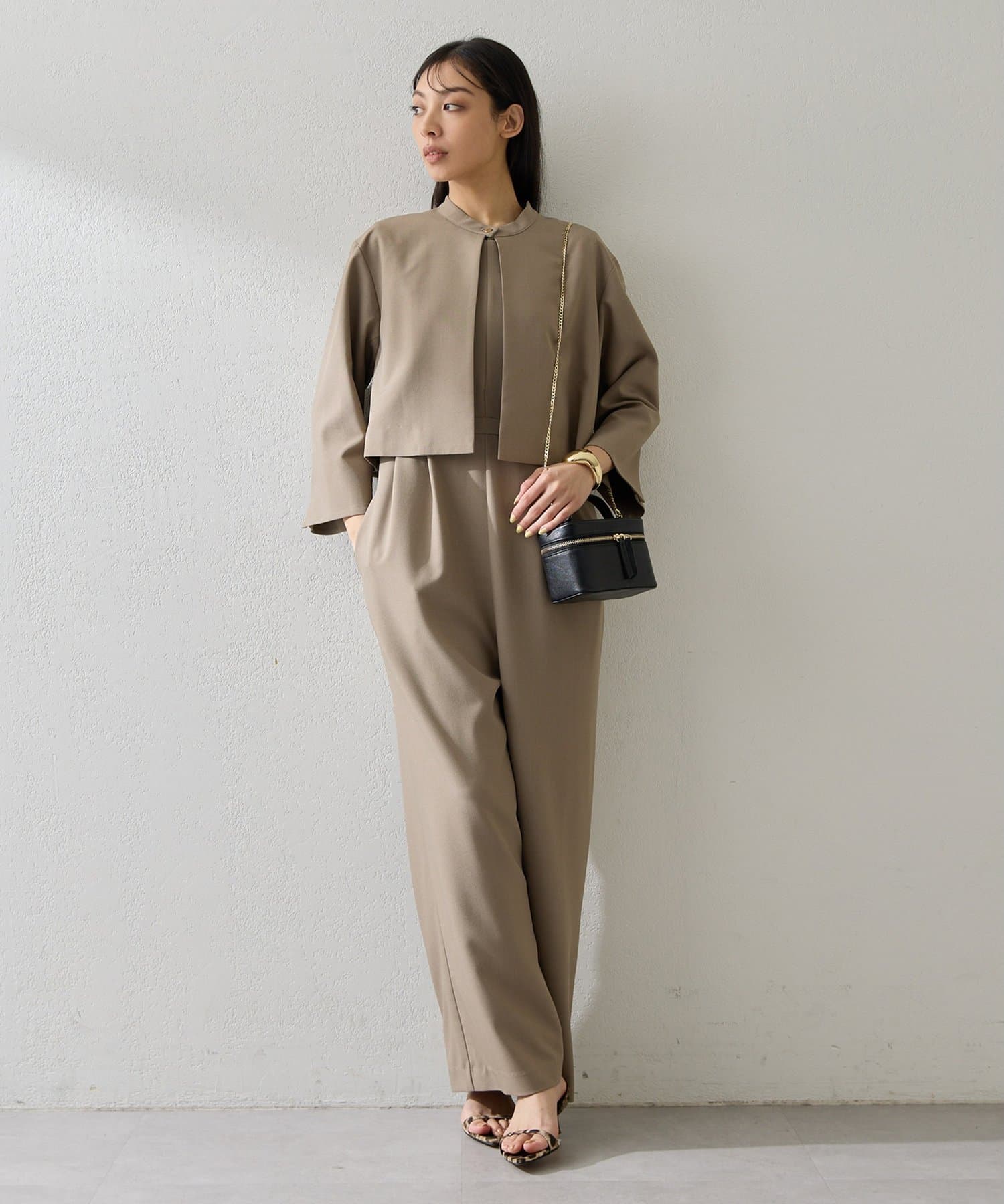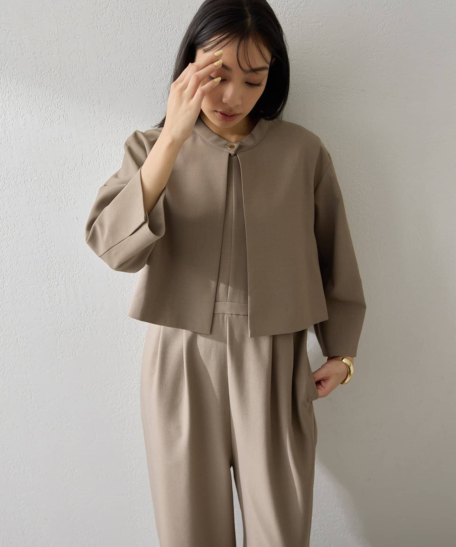 ■ショート丈のジャケットとノースリーブコンビネゾンのセットアップ。