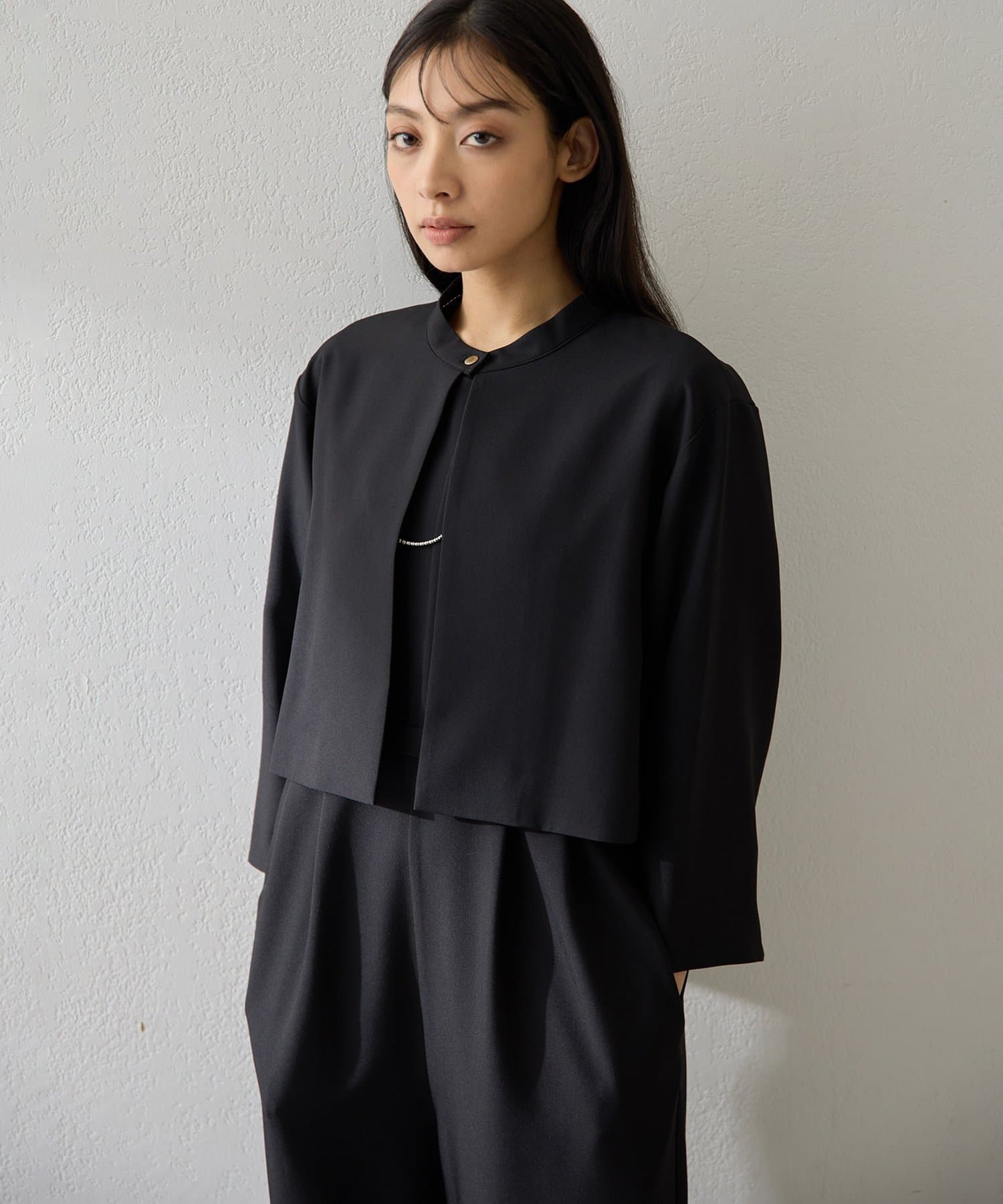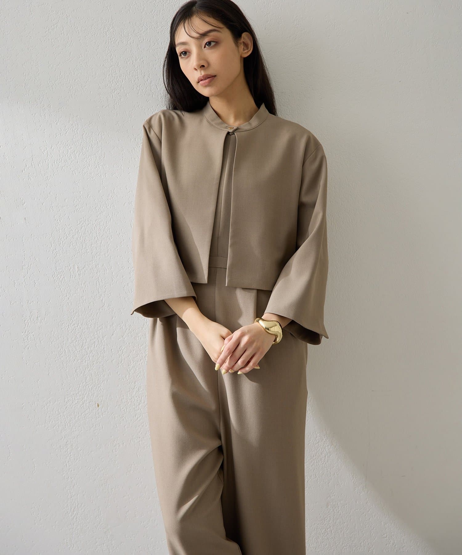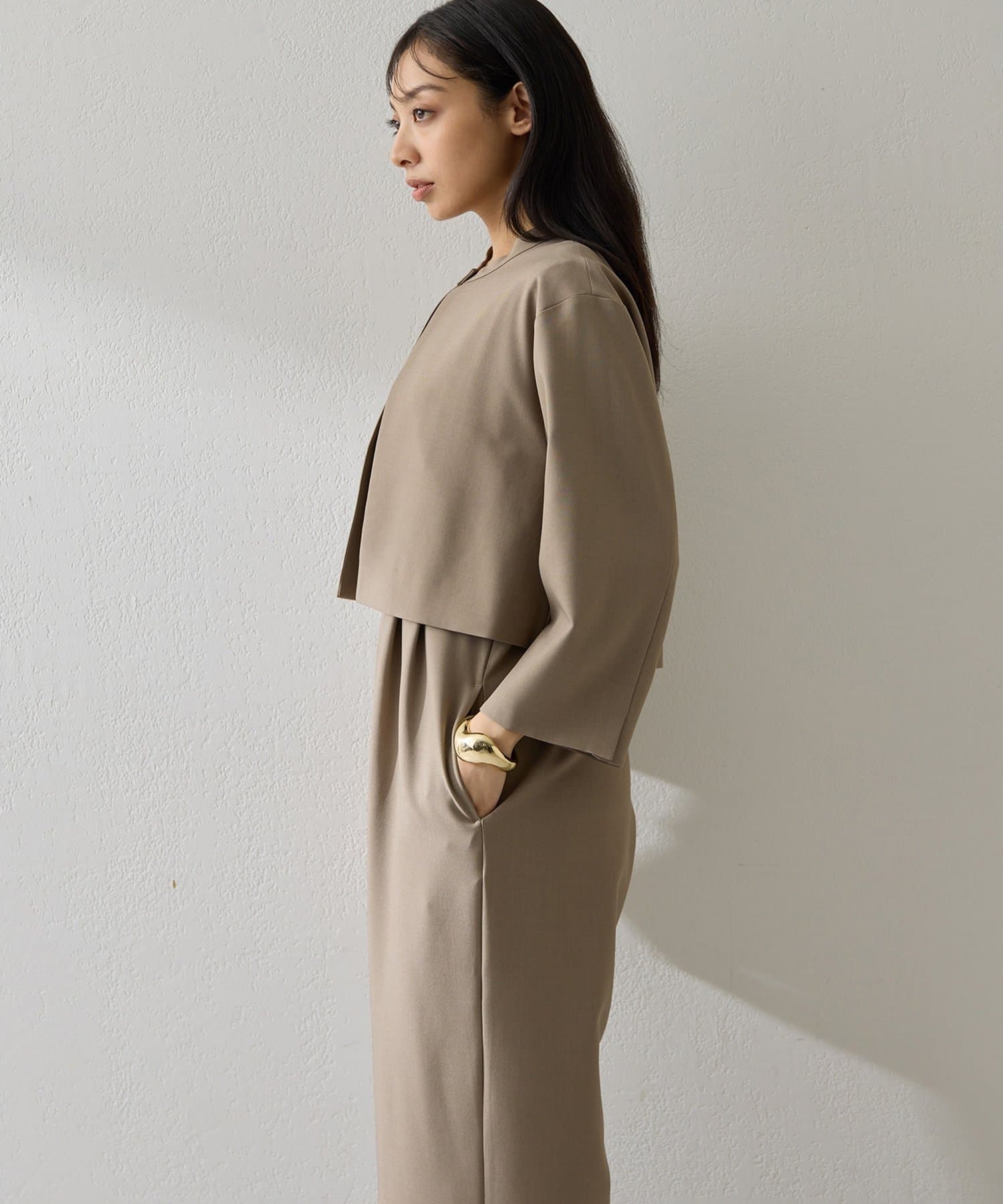 ■ショート丈のジャケットとノースリーブコンビネゾンのセットアップ。