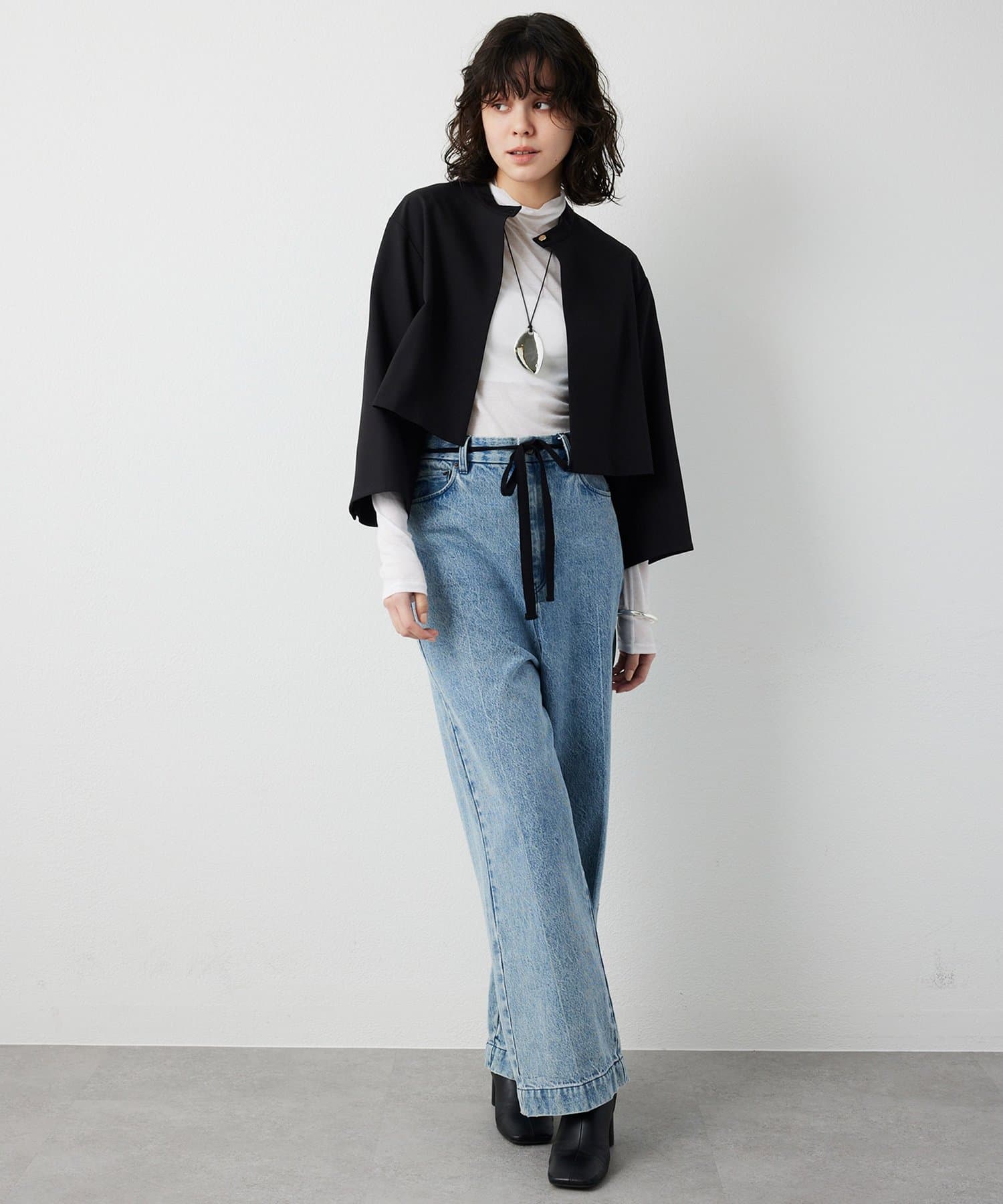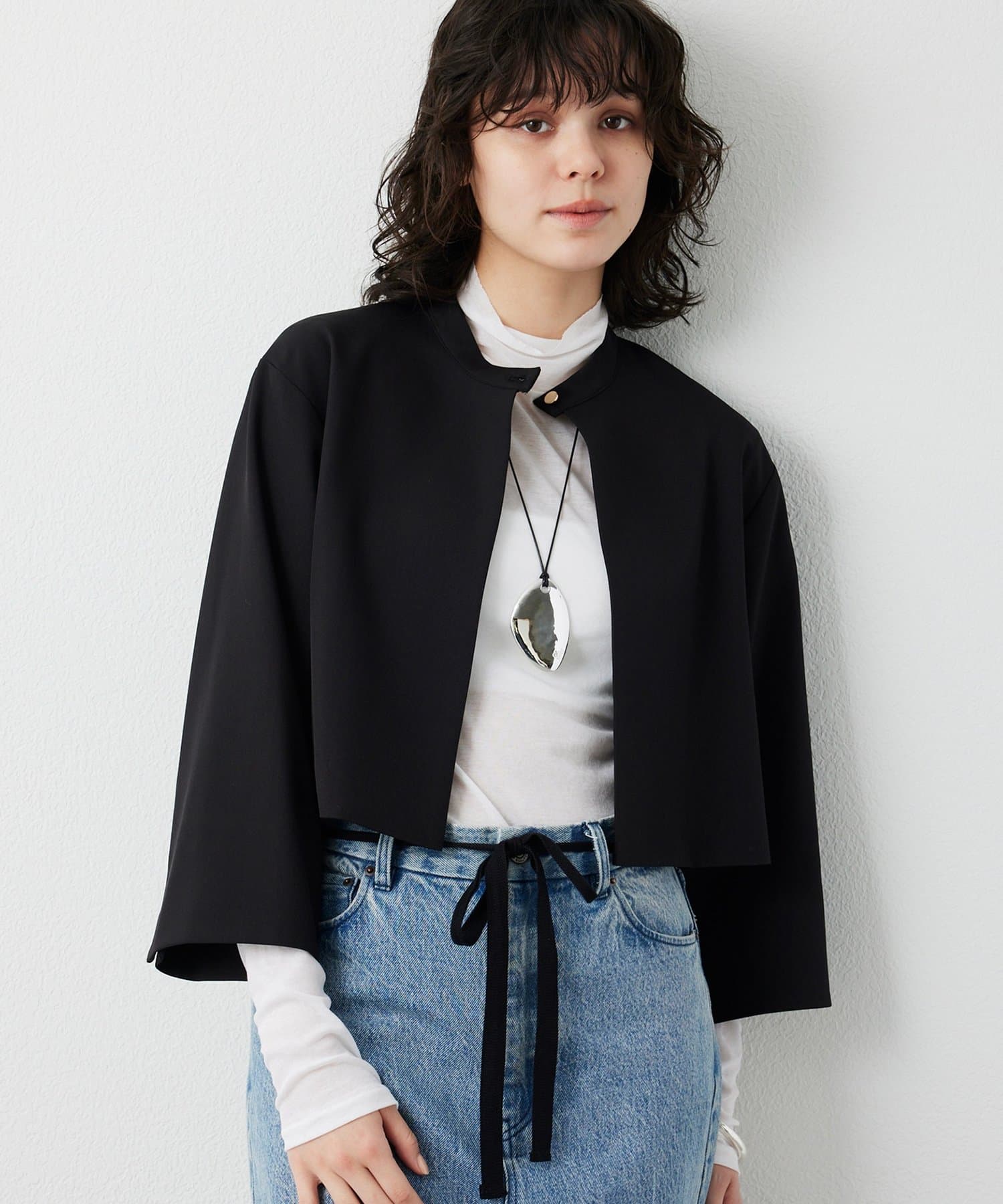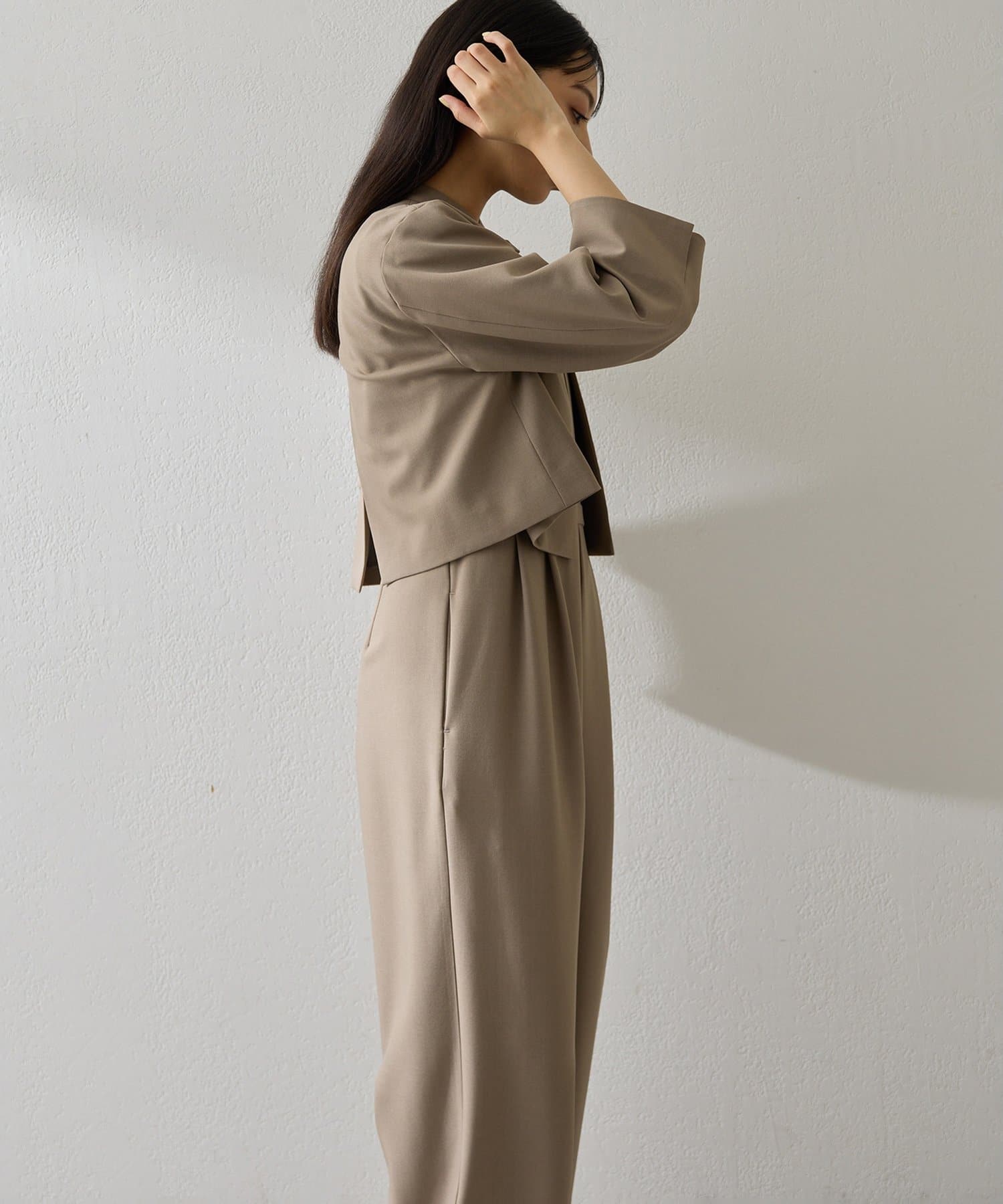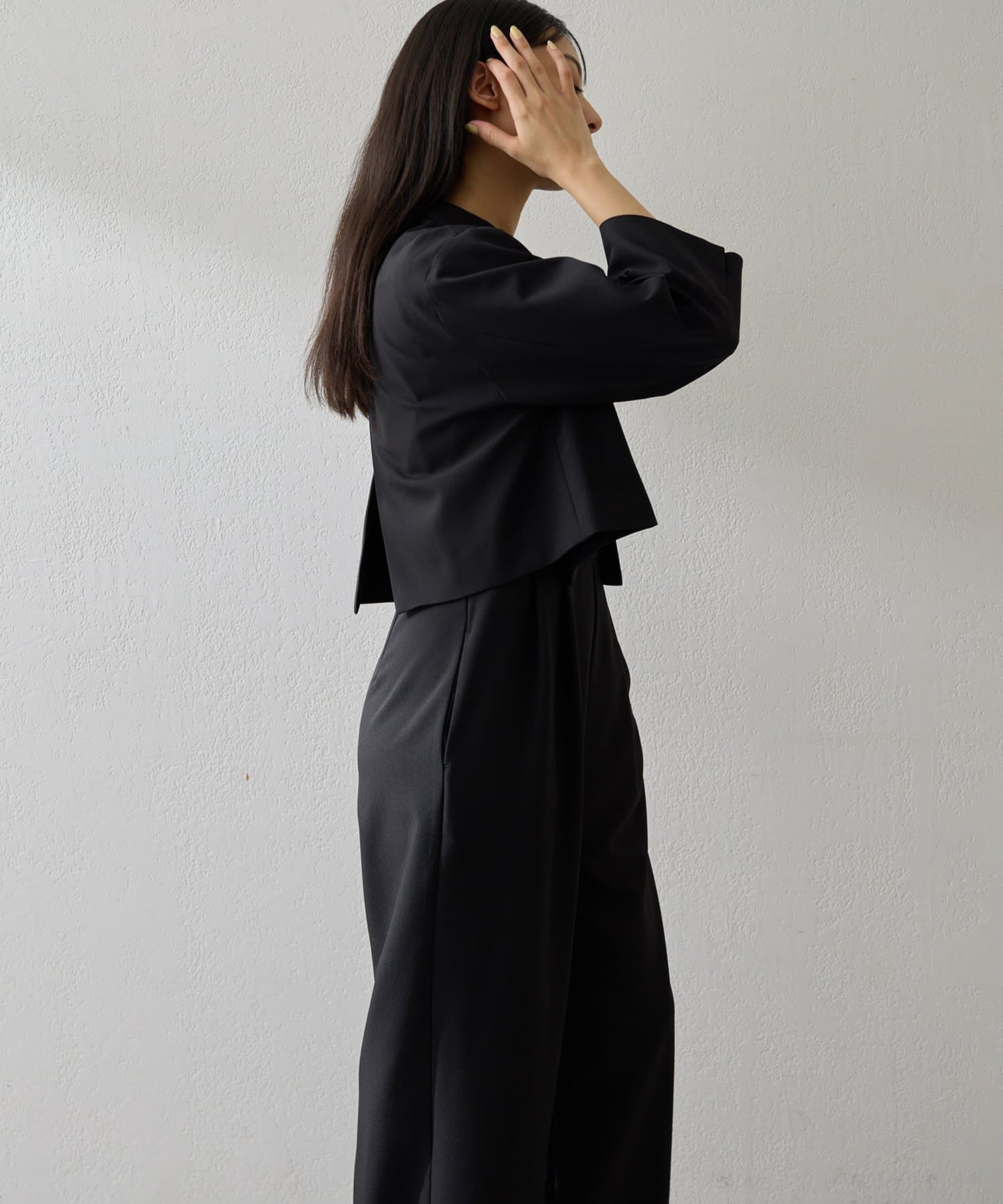 ■ショート丈のジャケットとノースリーブコンビネゾンのセットアップ。