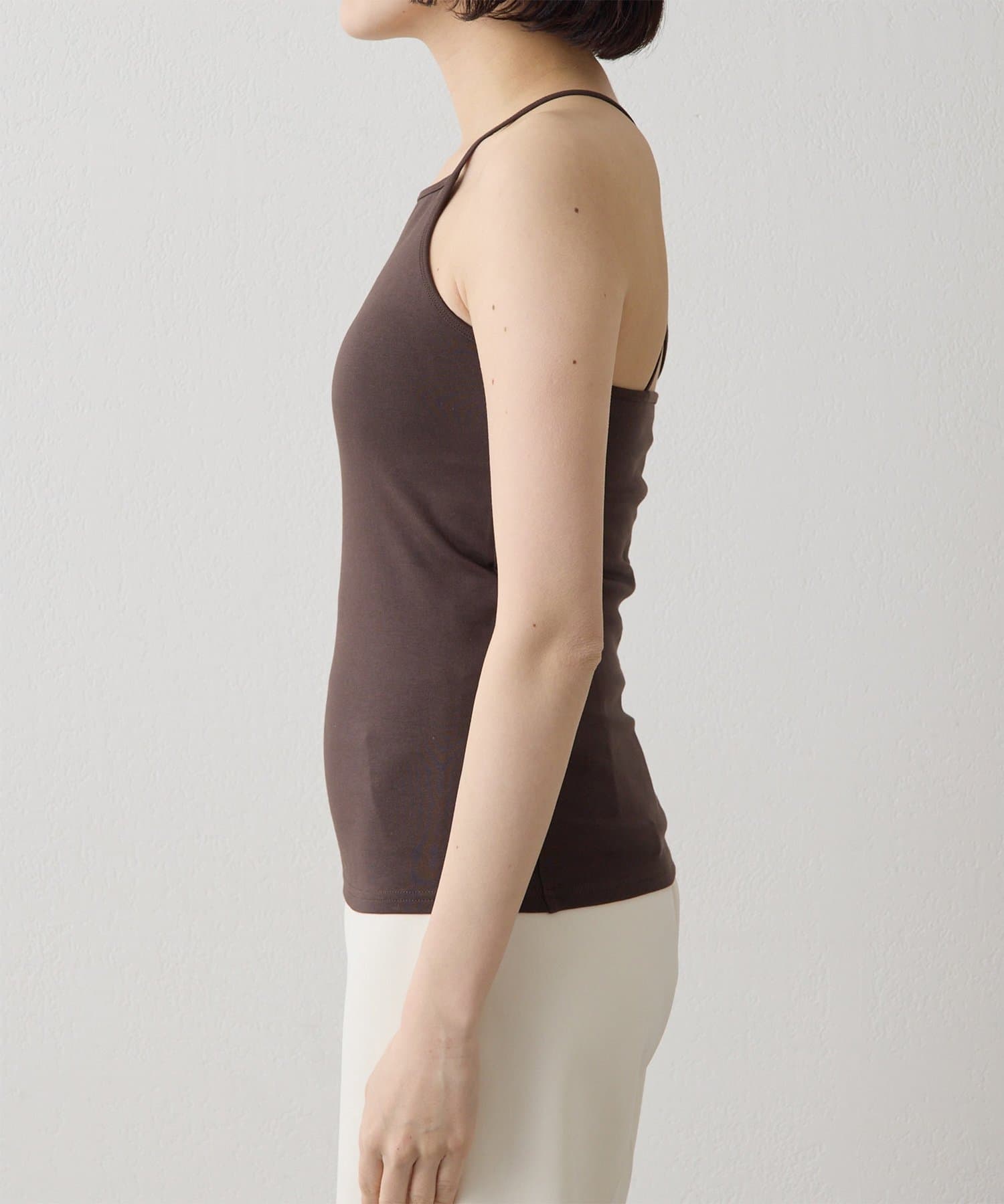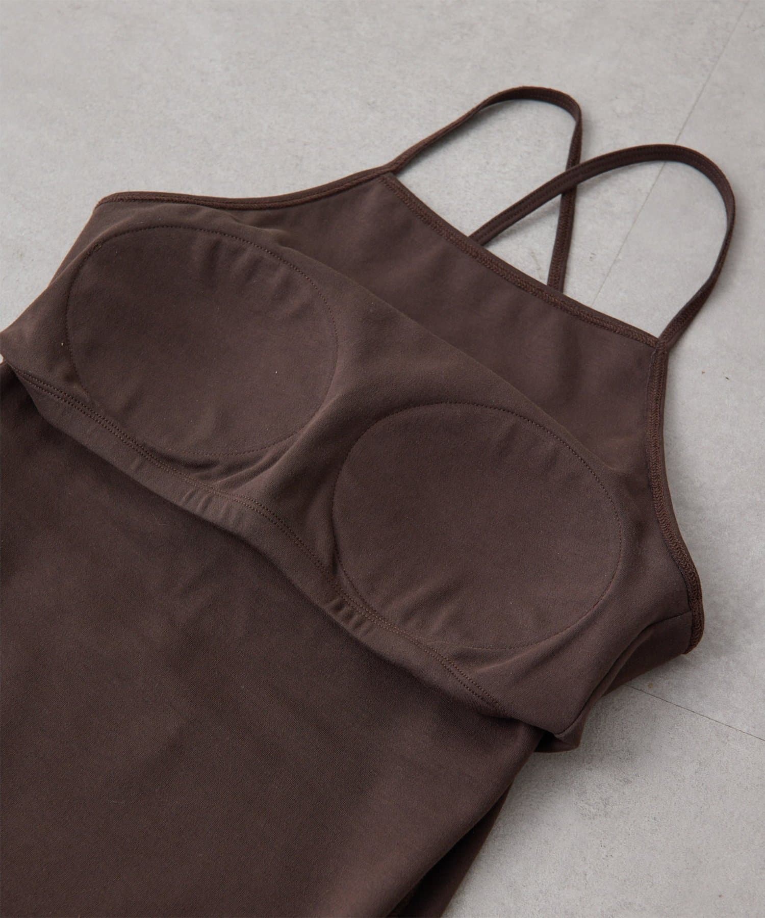 ■肩紐は細めにしあえてアジャスターは付けず、トップスから肩紐を見せてもインナー感が出ないデザインに。