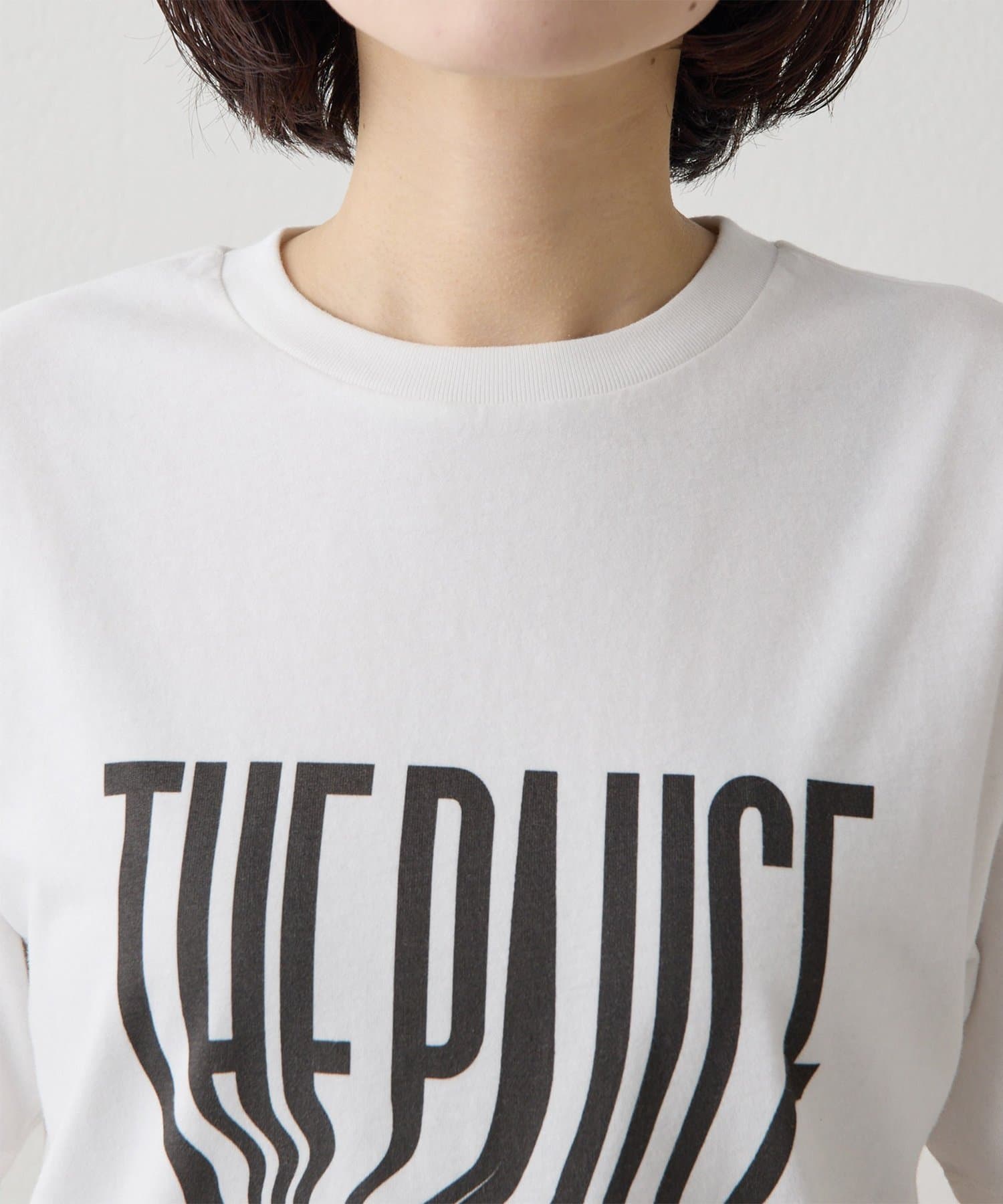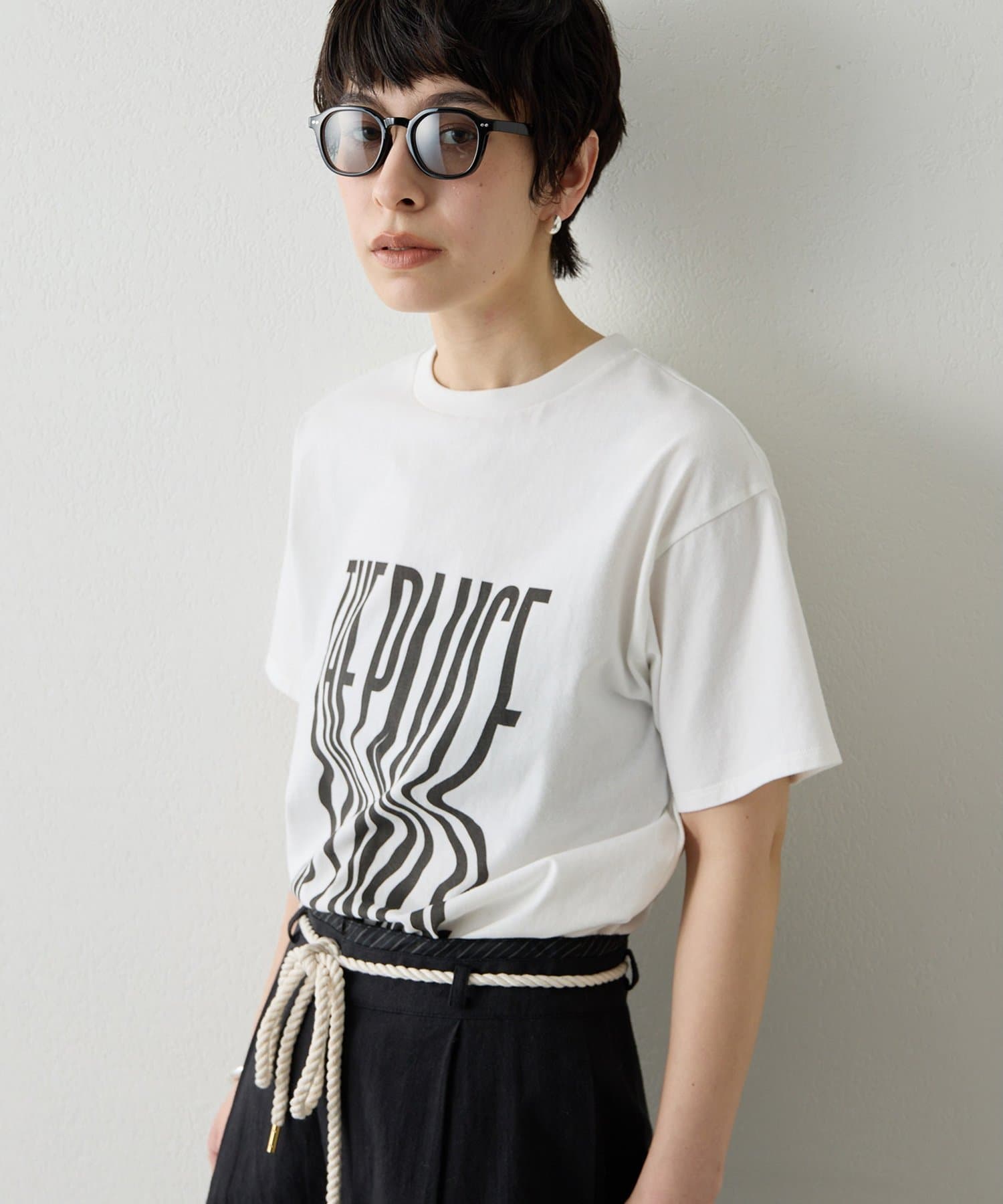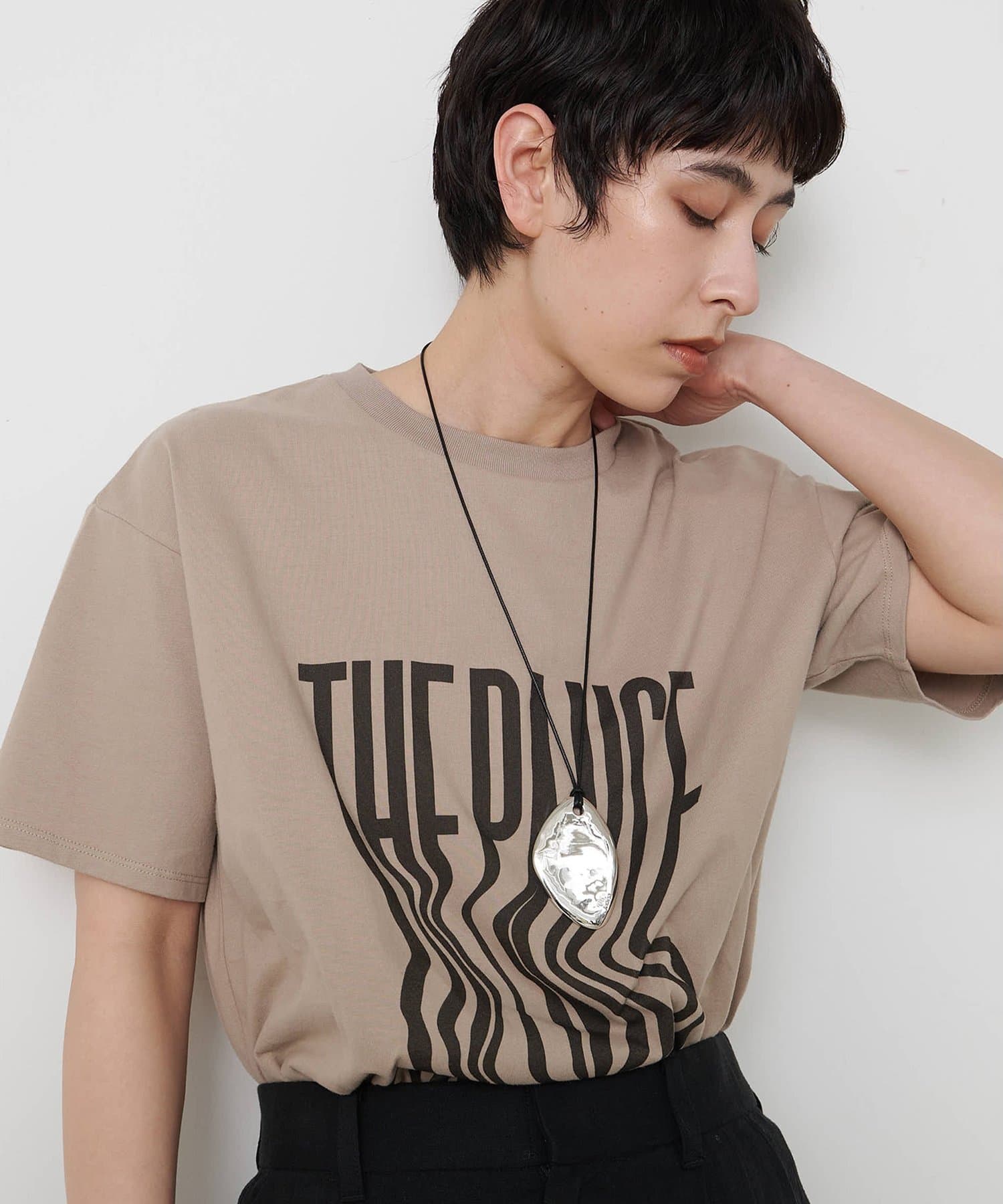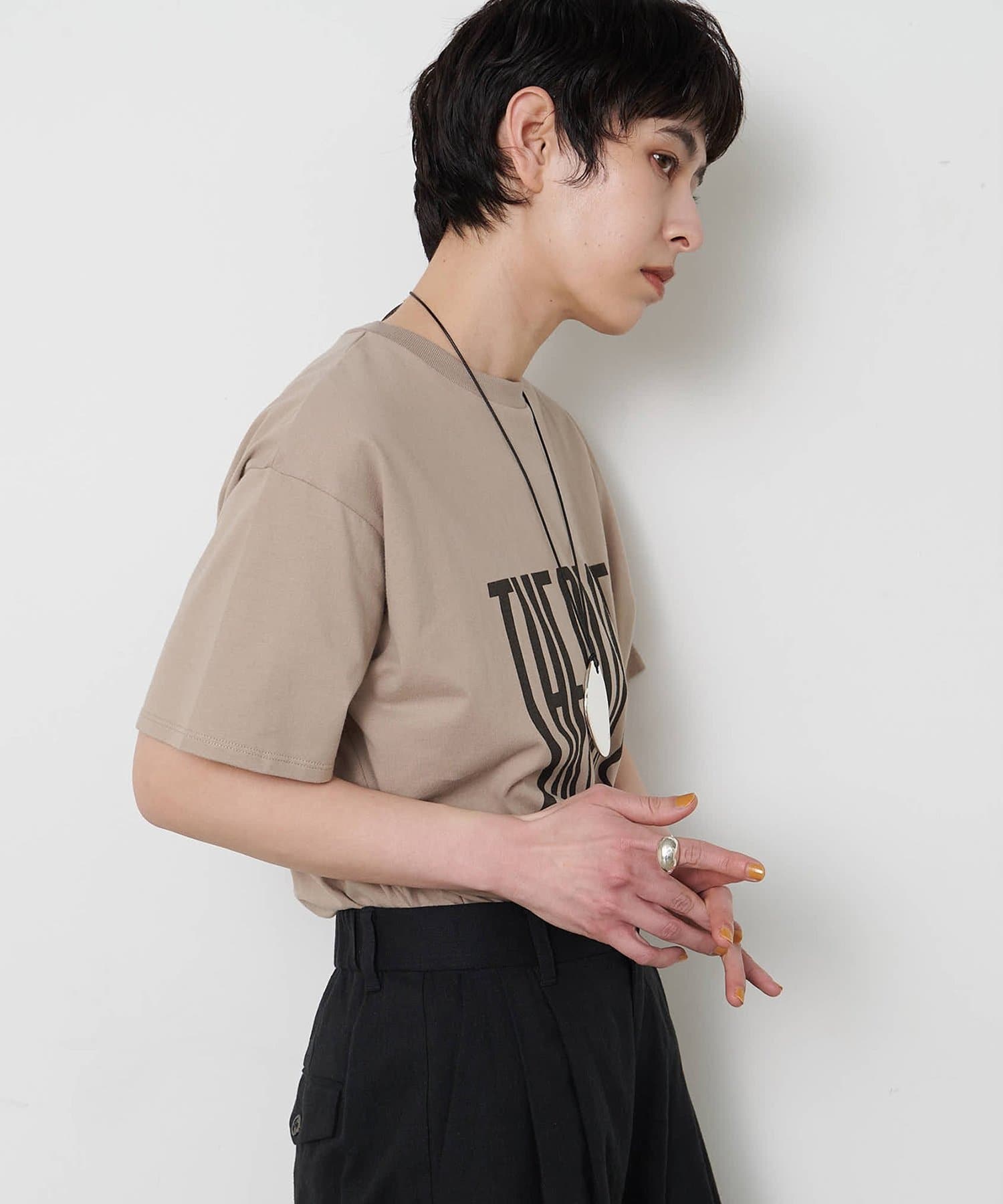 ■『THE PAUSE』の文字を縦に引き延ばしたロゴが遊び心を感じさせるTシャツ。