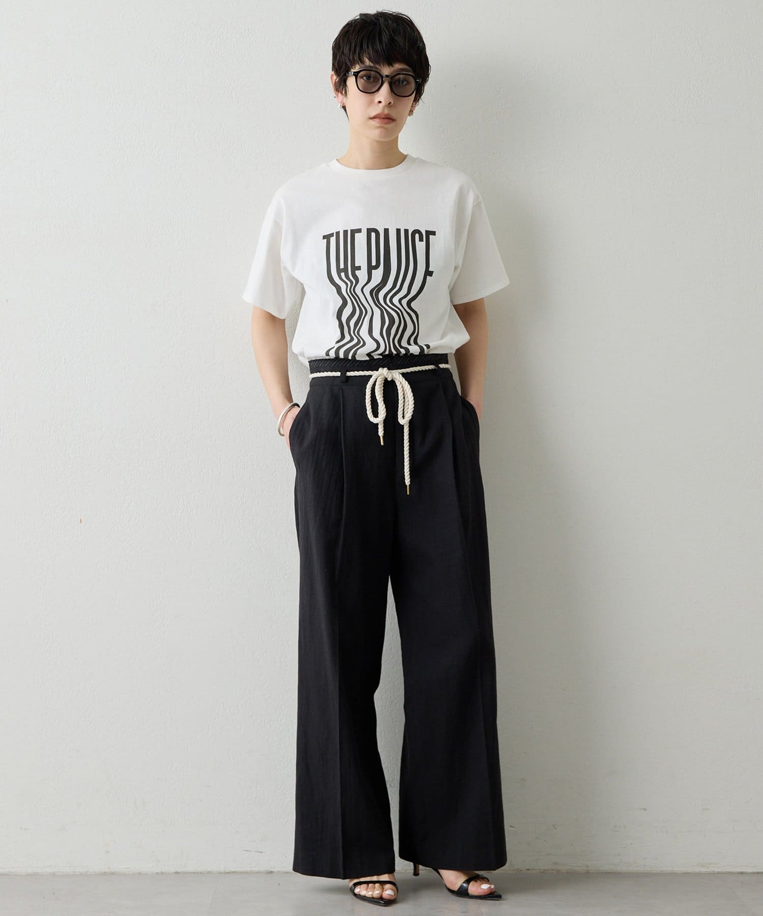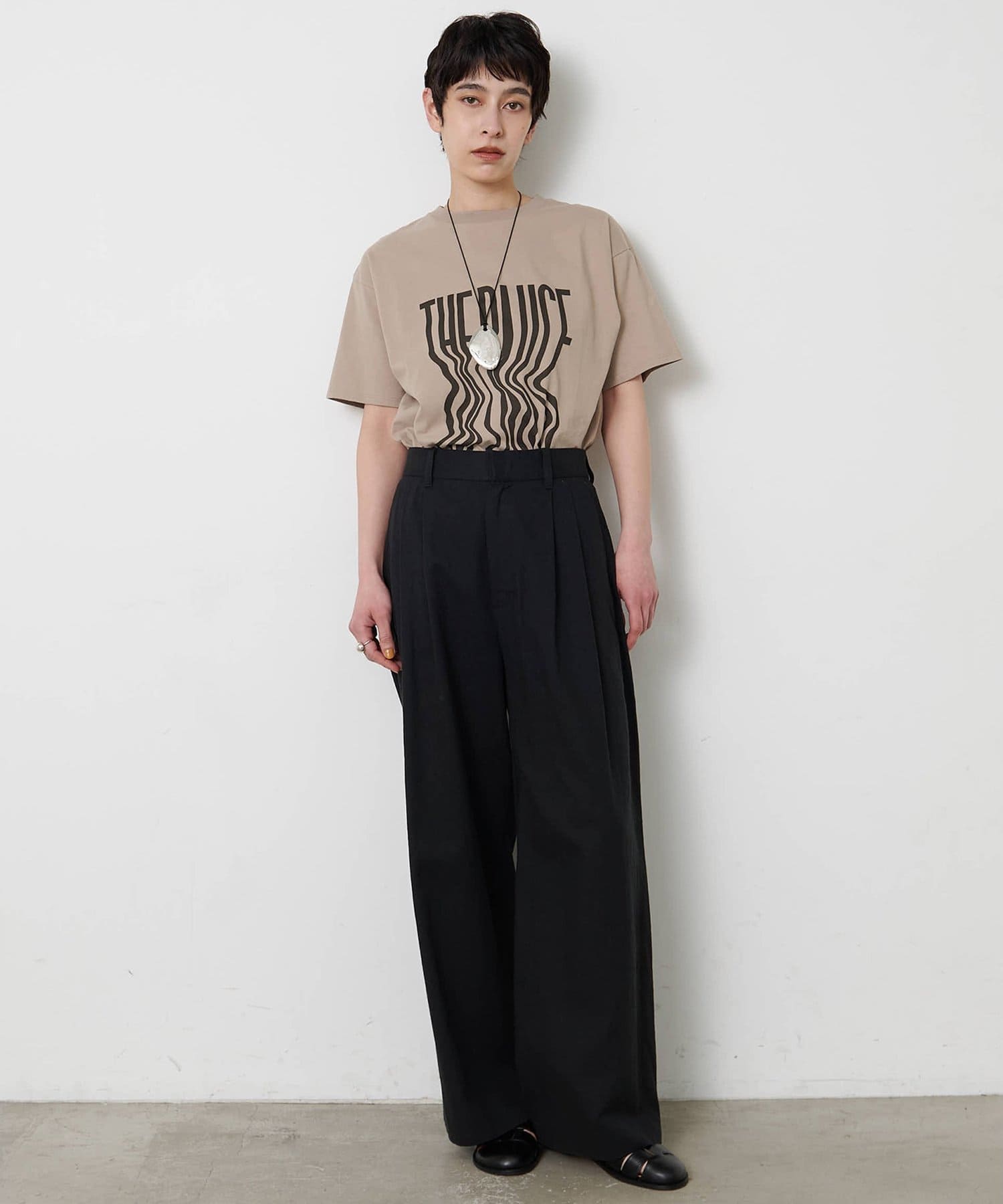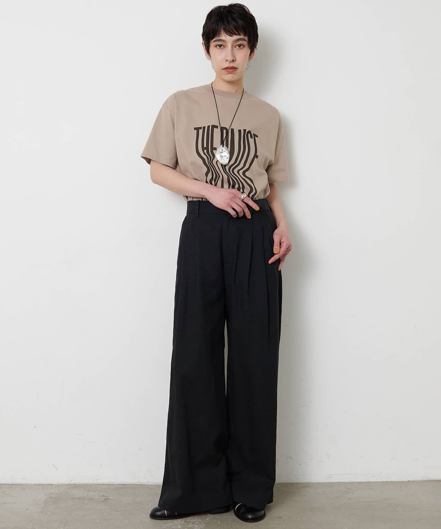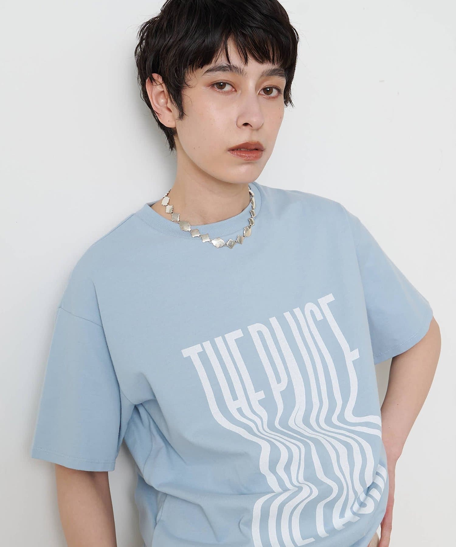 ■『THE PAUSE』の文字を縦に引き延ばしたロゴが遊び心を感じさせるTシャツ。