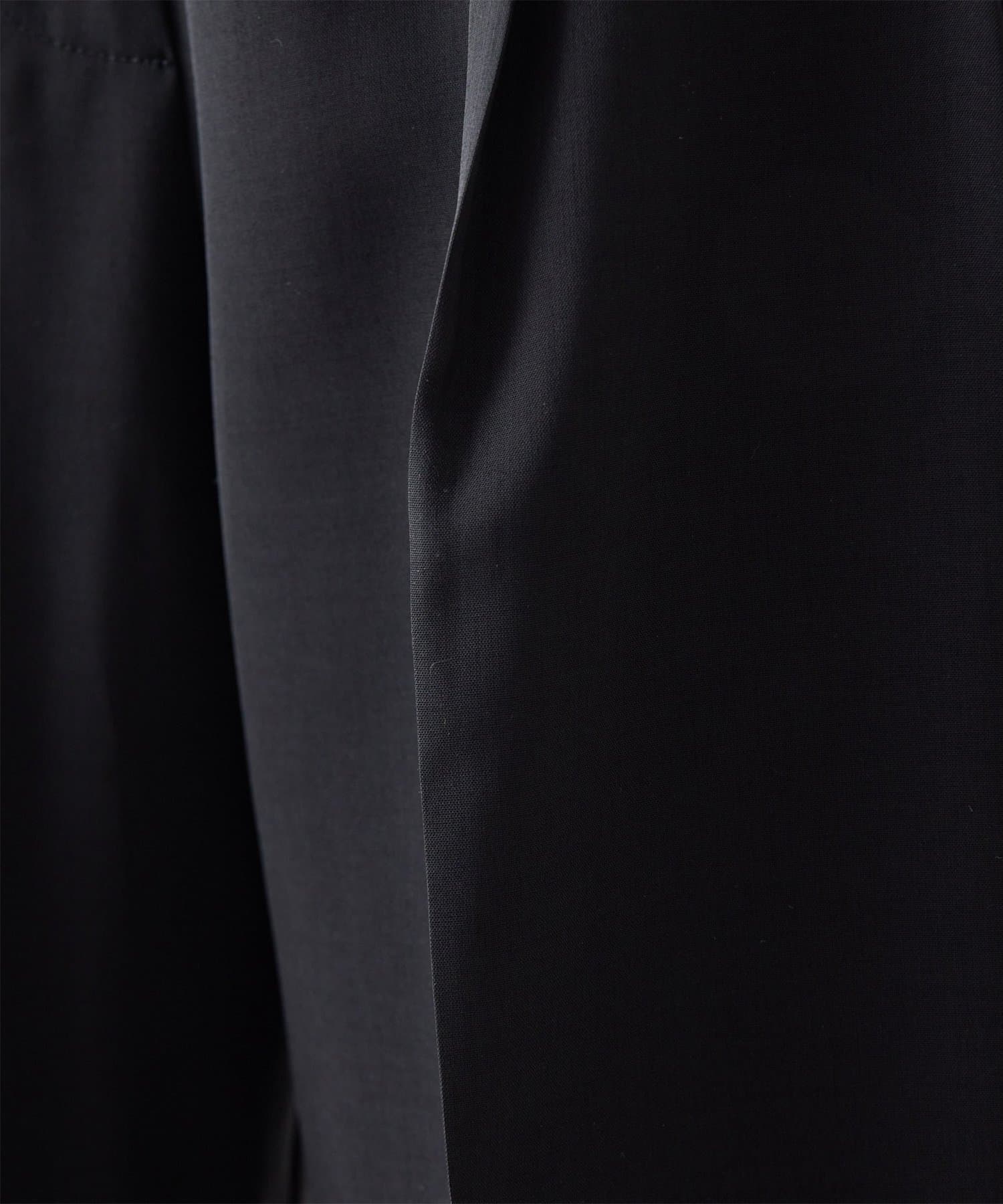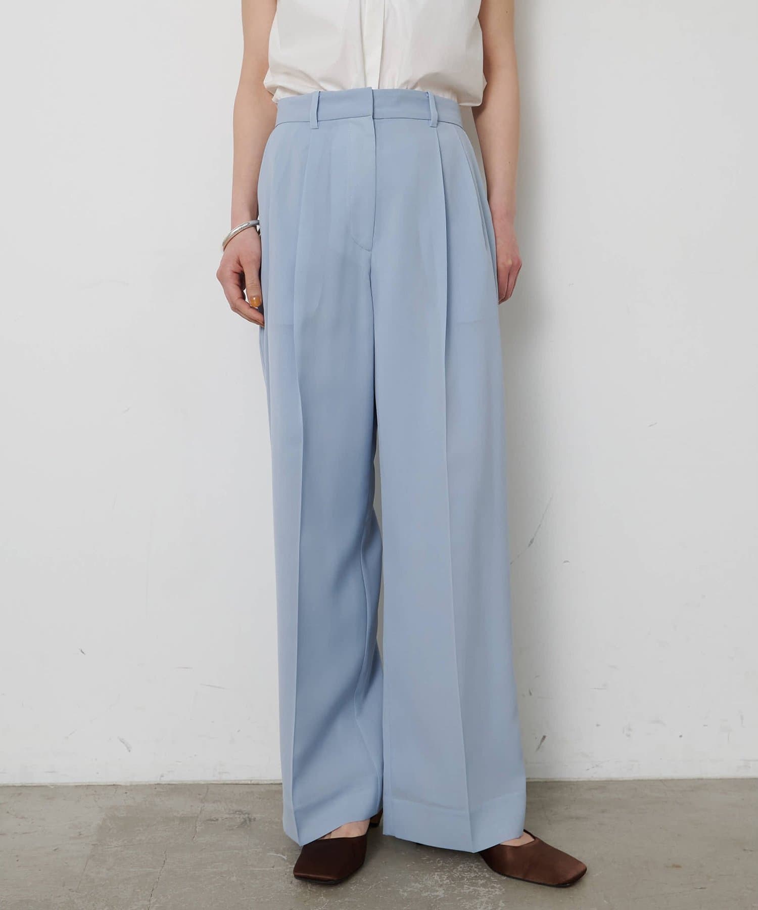 ■梳毛調シアー素材を使用したタックパンツ。