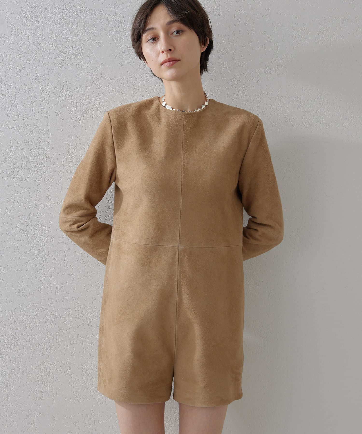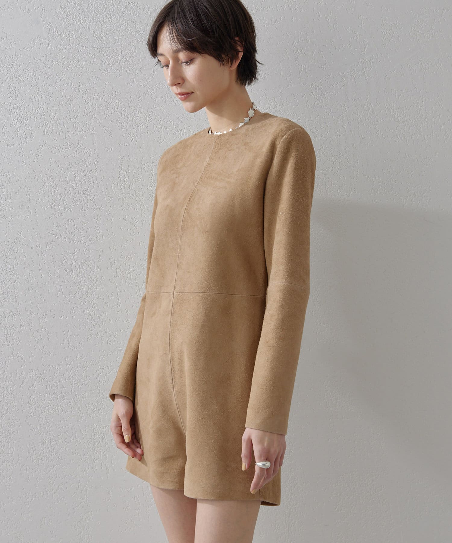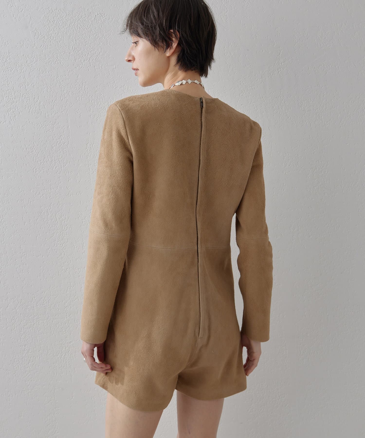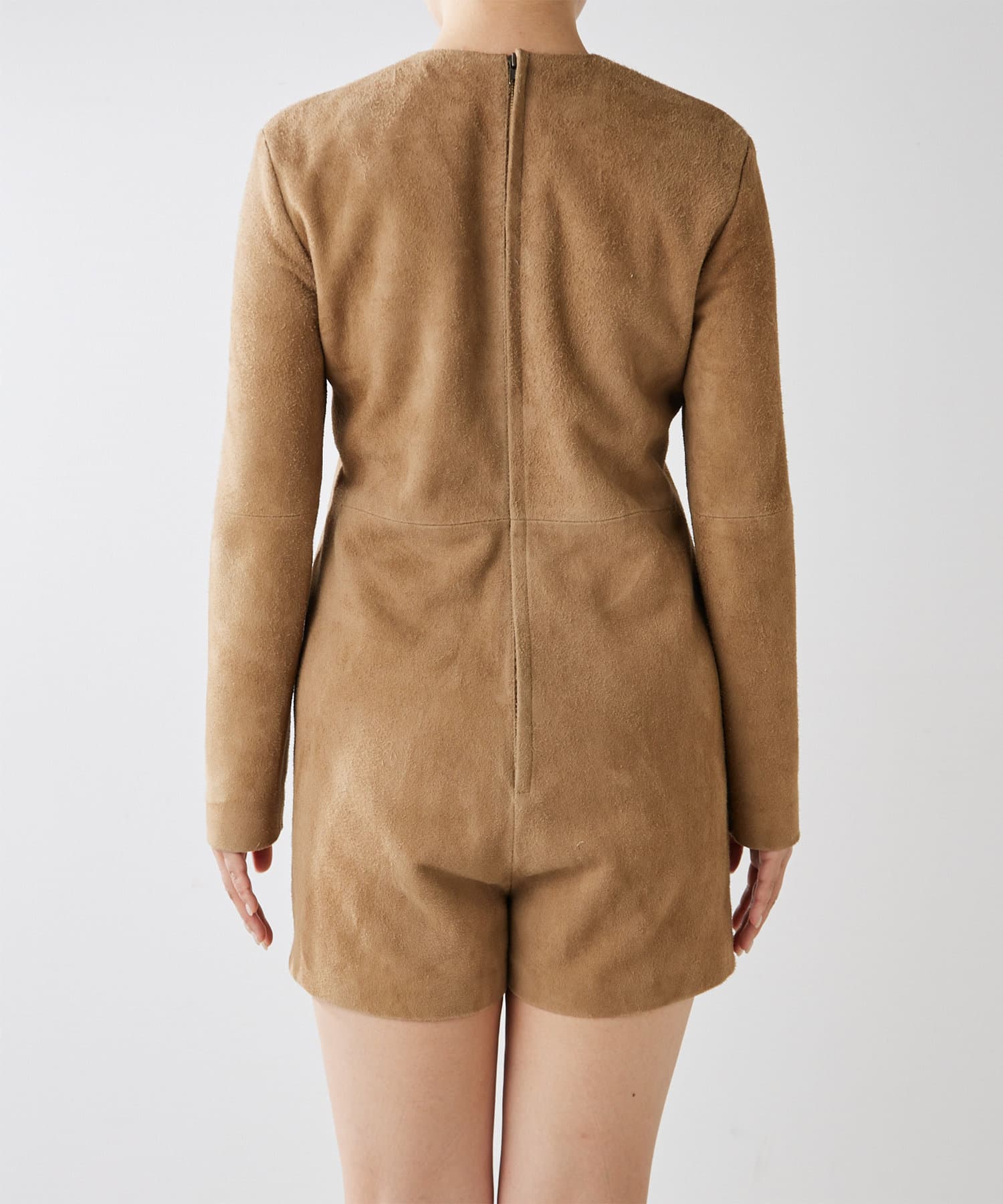 ■厚手のスエード素材を使用したミニ丈のオールインワン。