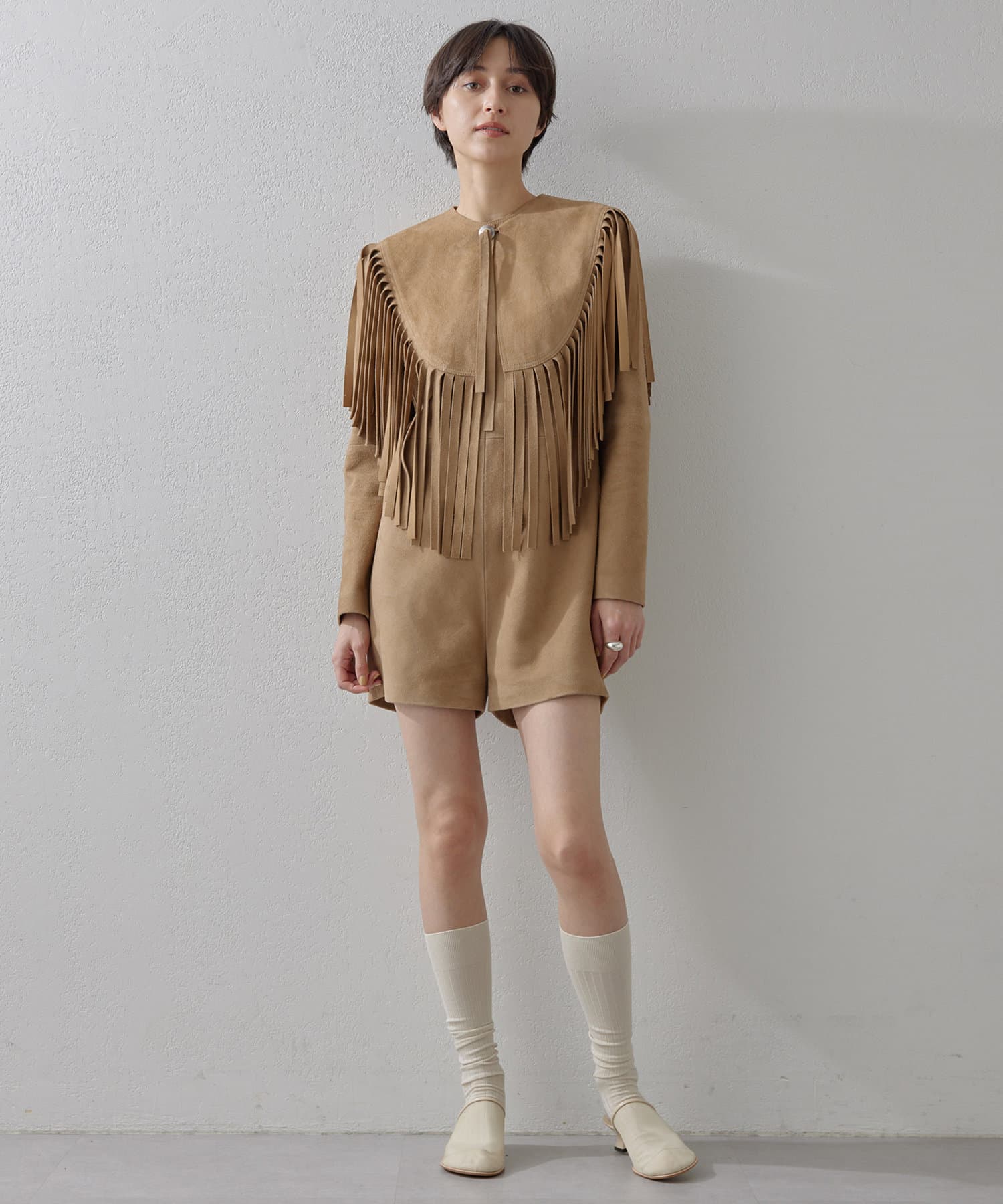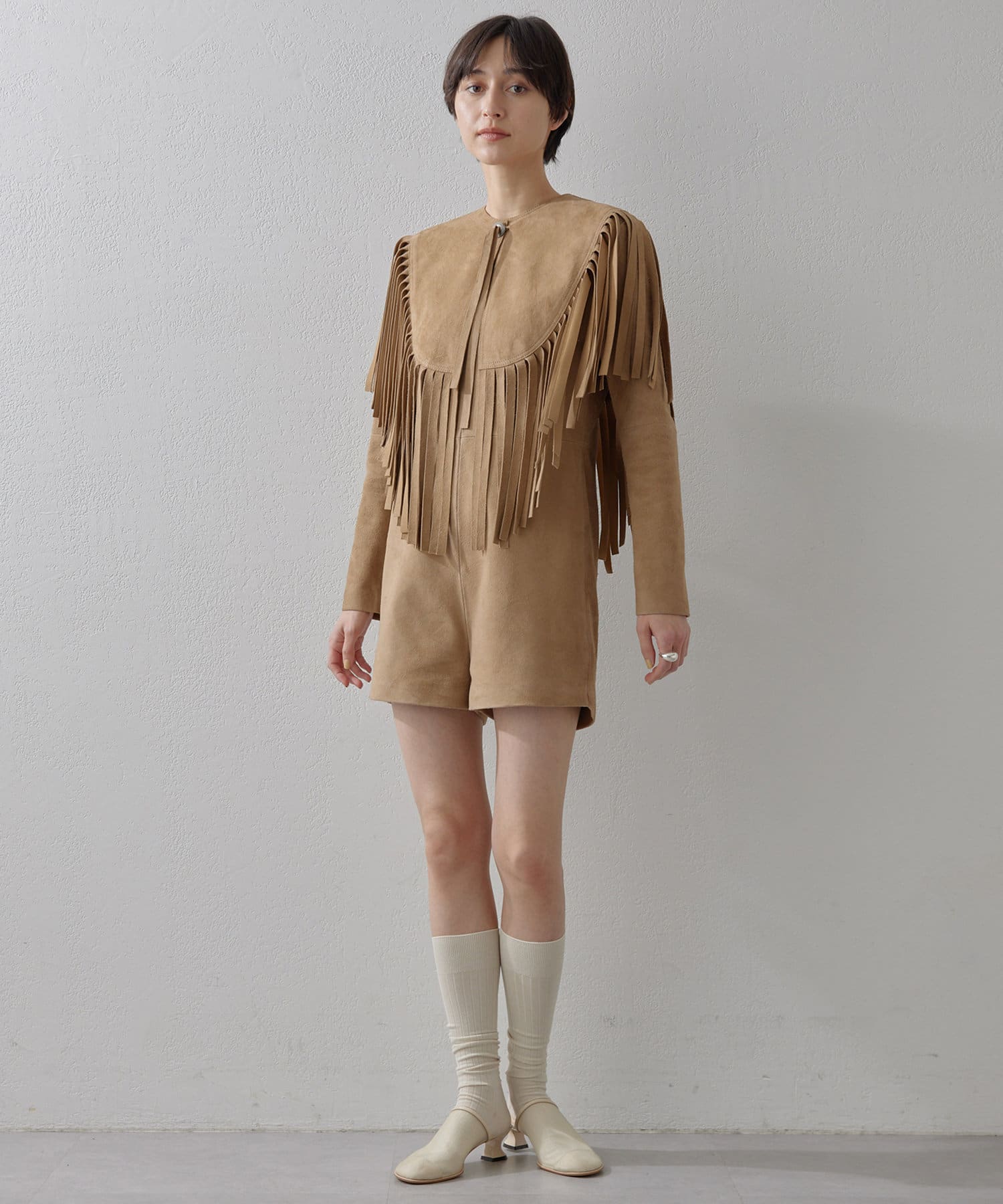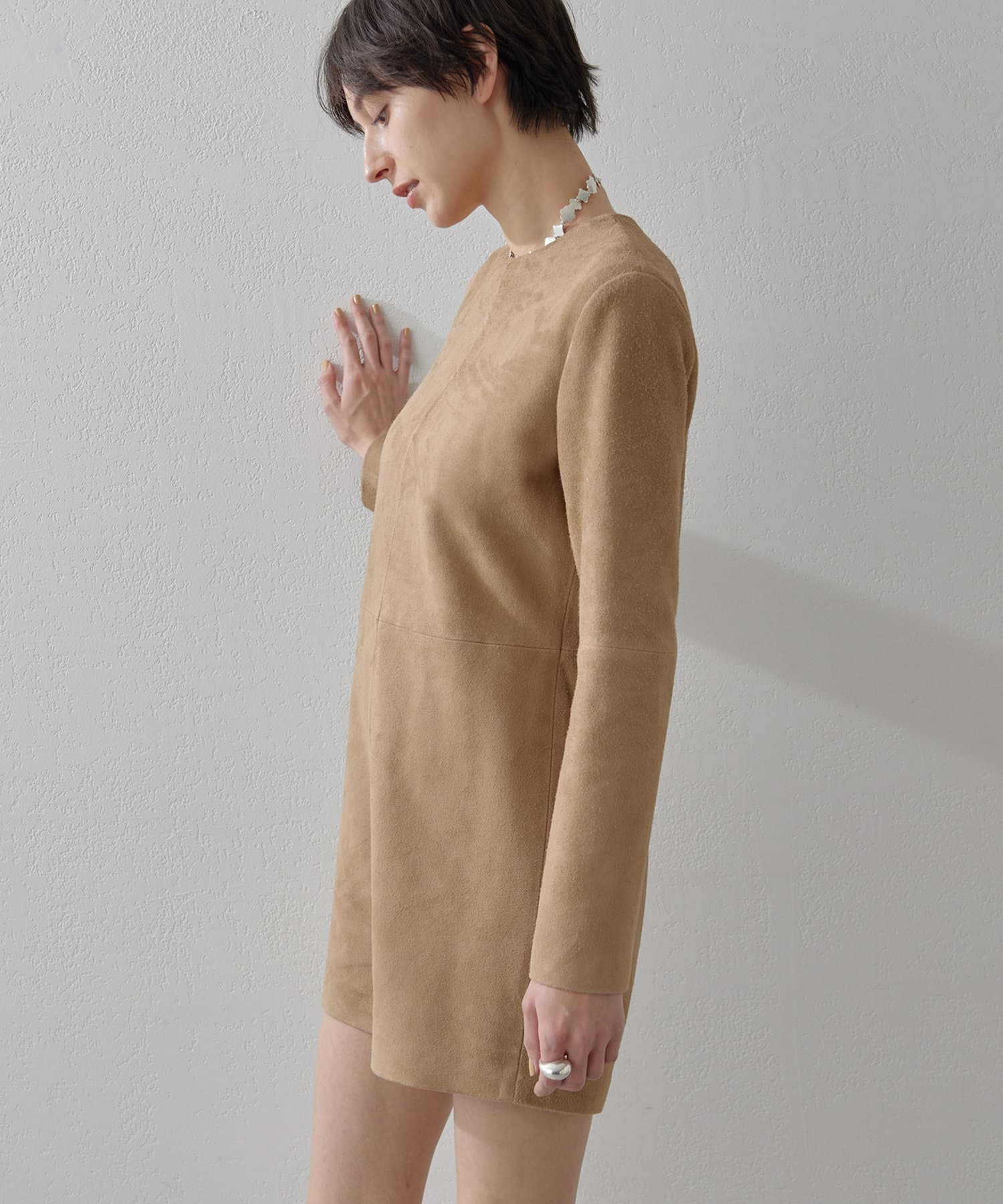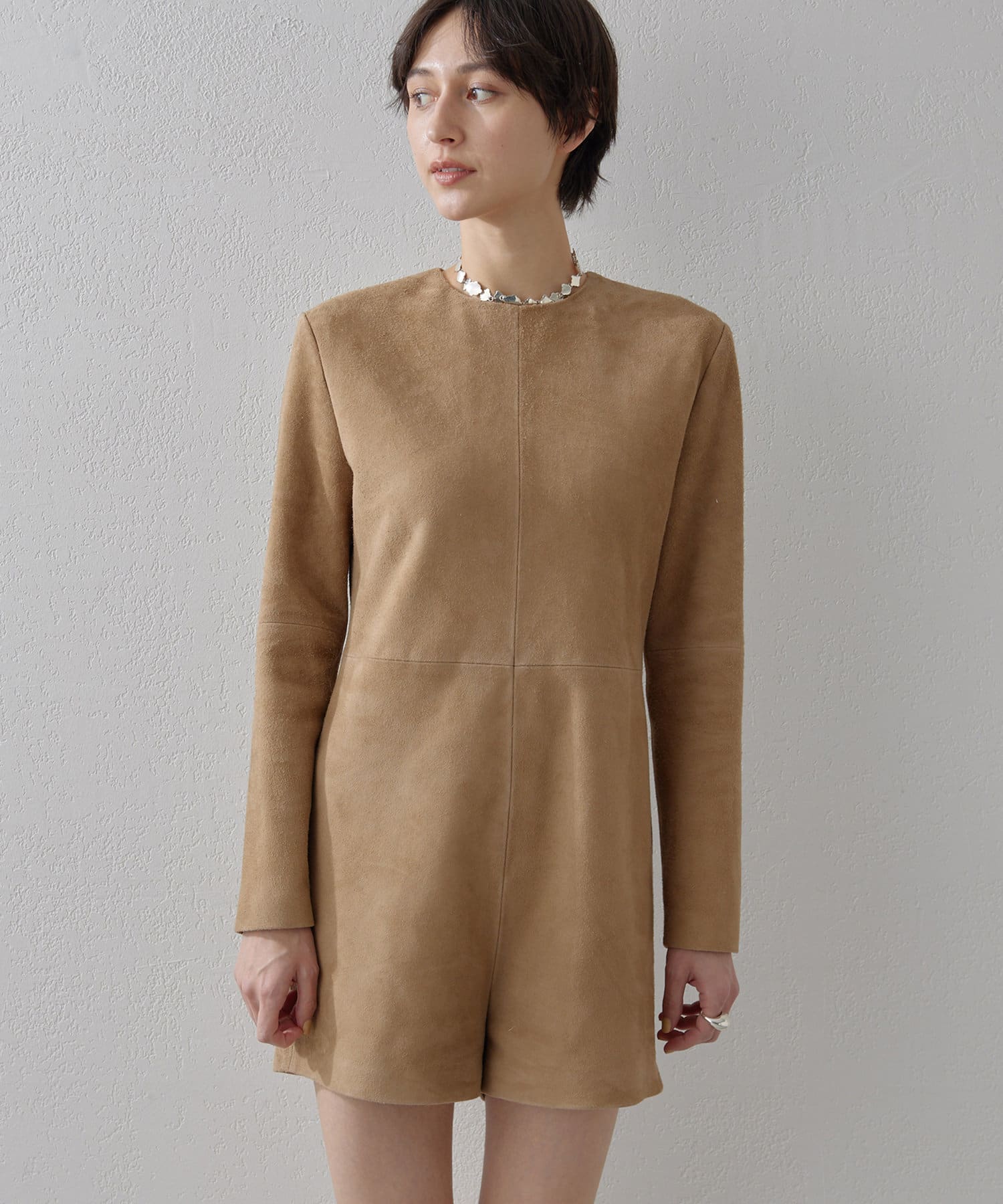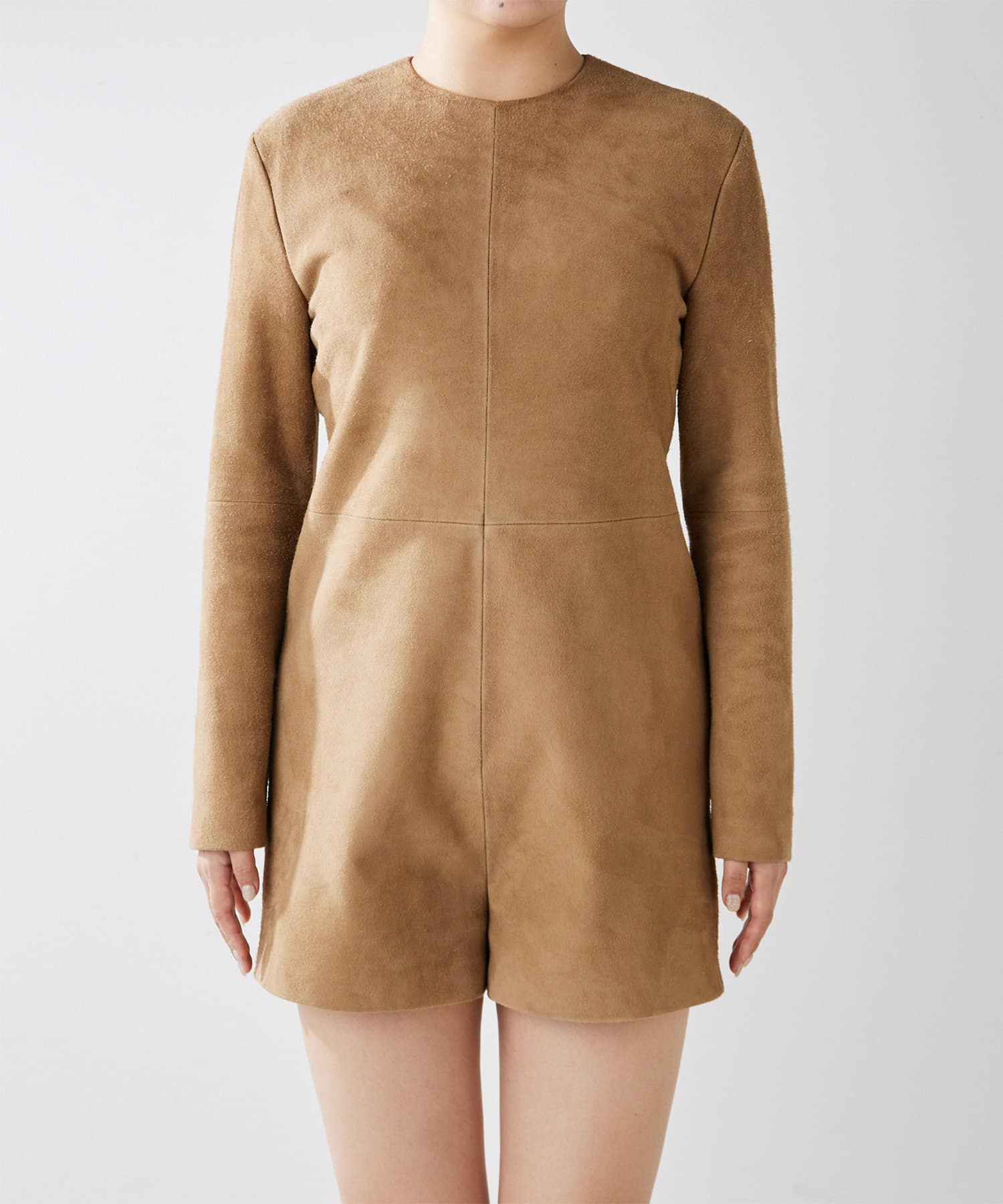 ■厚手のスエード素材を使用したミニ丈のオールインワン。