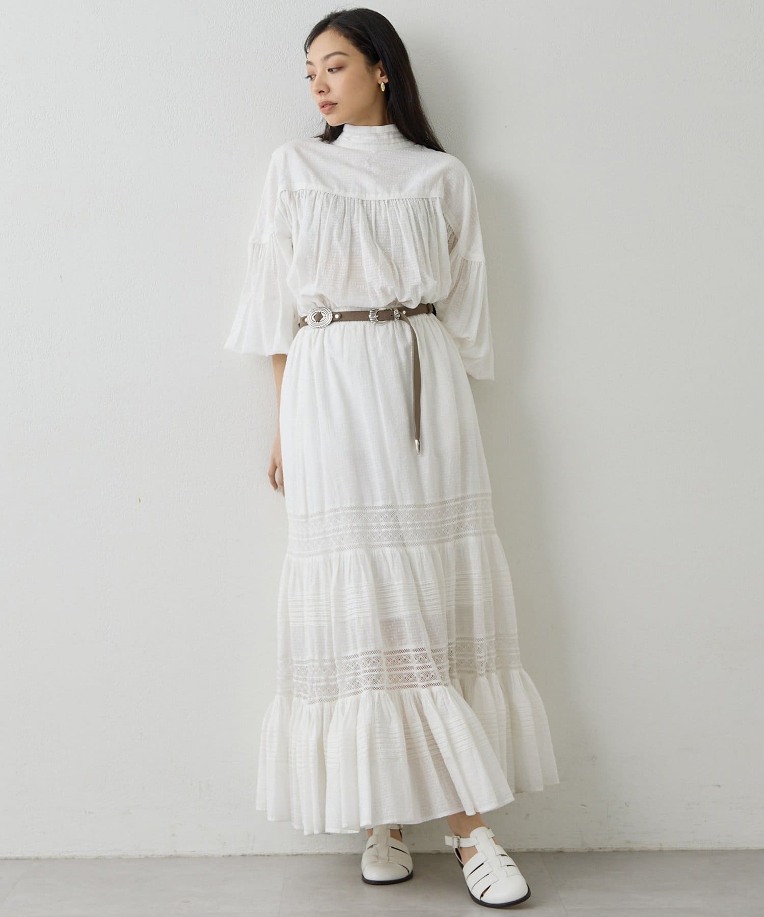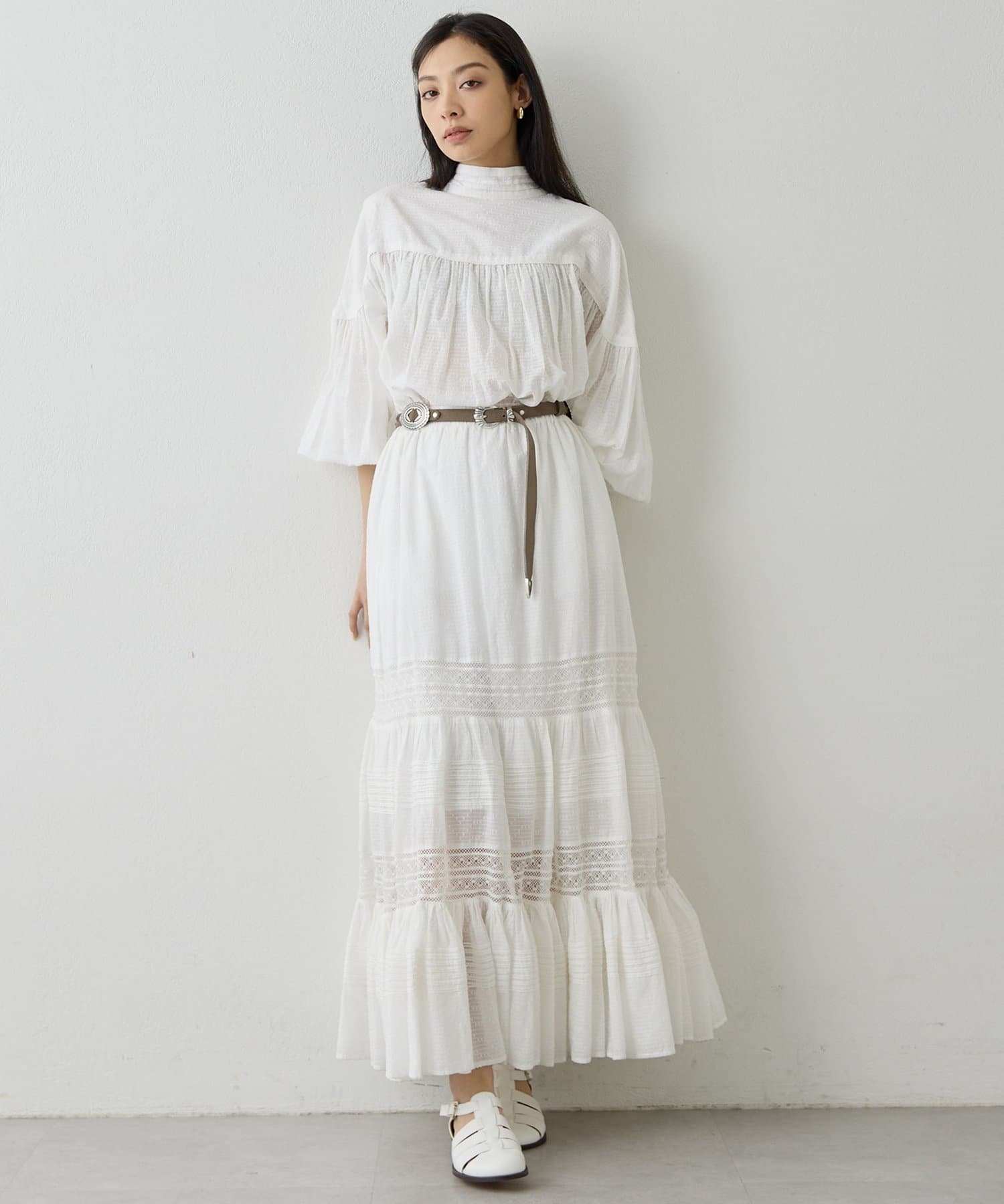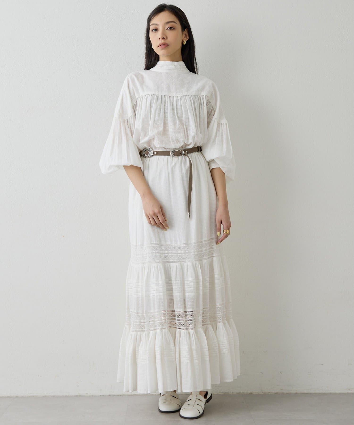 ■同素材のコットンギャザー切替えブラウス(ブランド品番:WGS1061204A0001)と合わせてワンピースのように楽しむのもおすすめ。