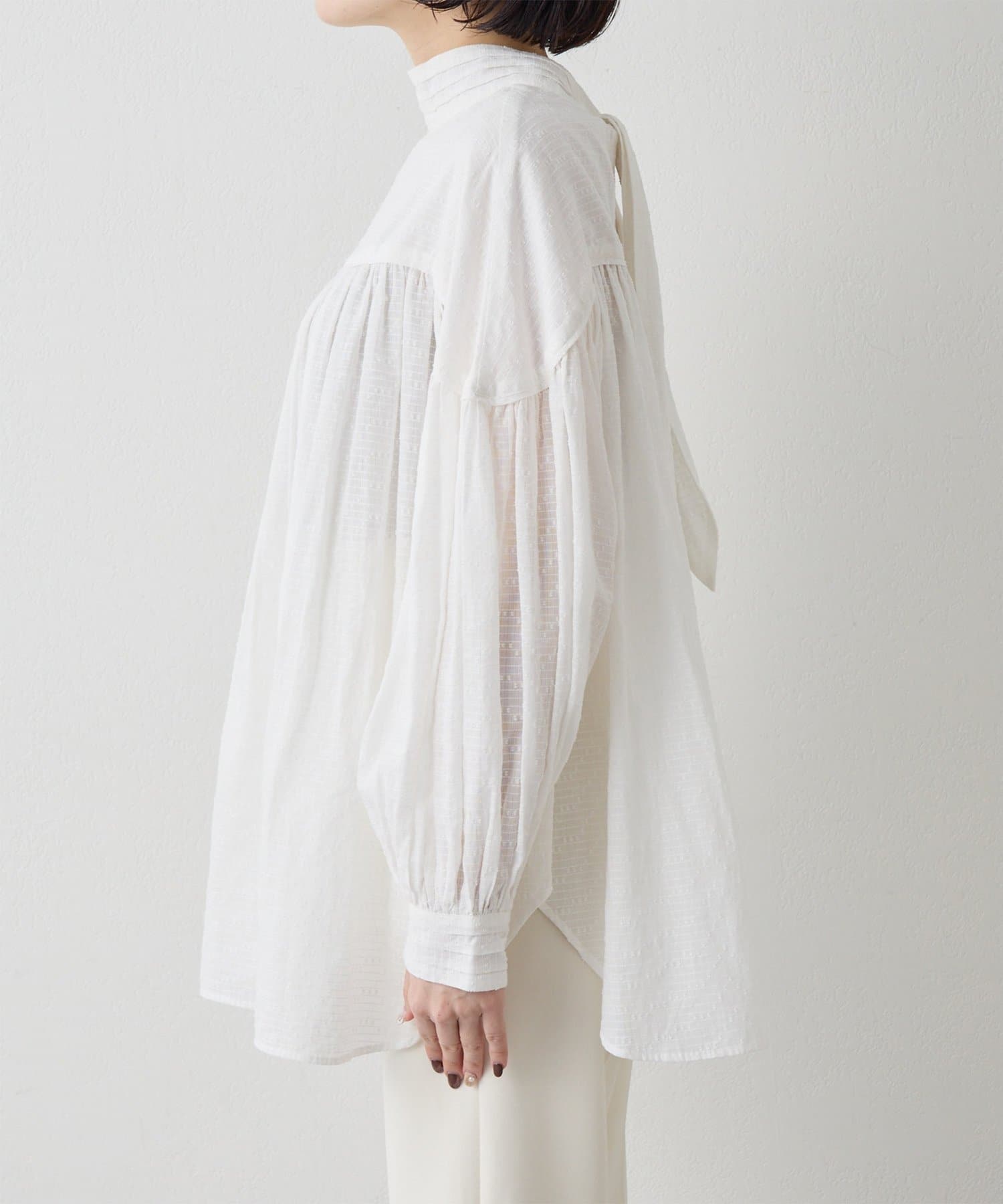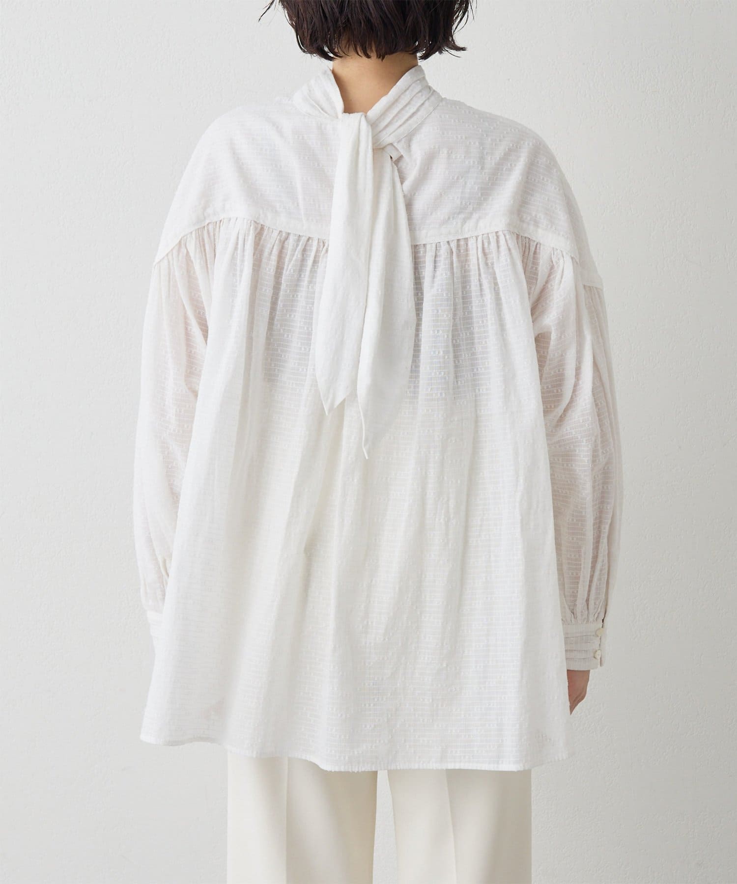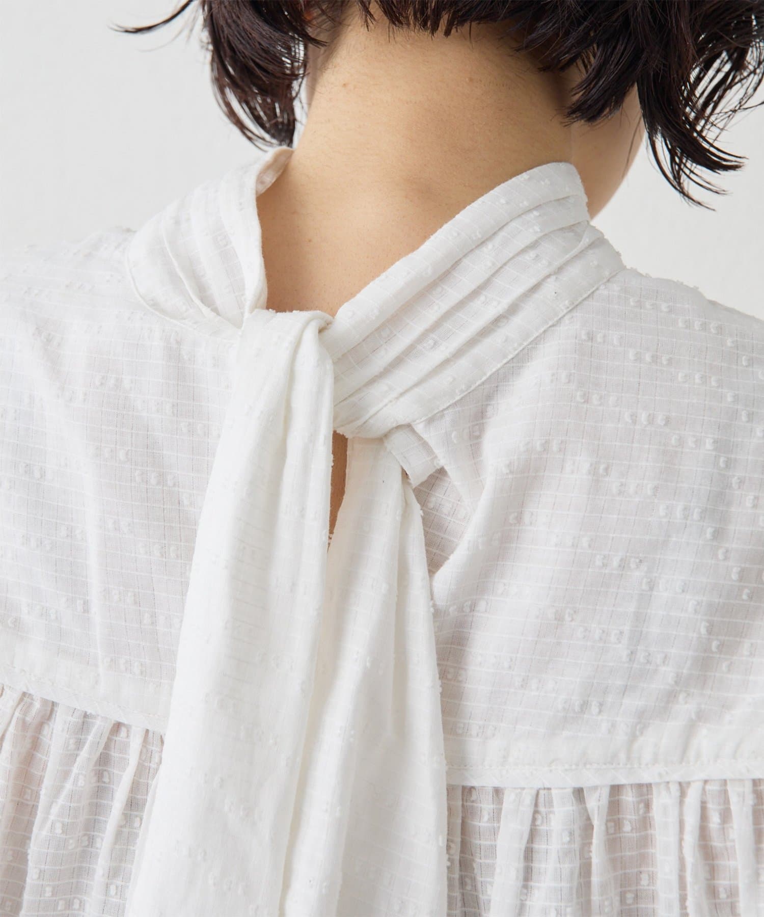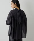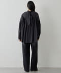 ■首元はリボンタイで女性らしい印象に仕上げ、タックと切り替えギャザーで立体的な表情をプラス。
