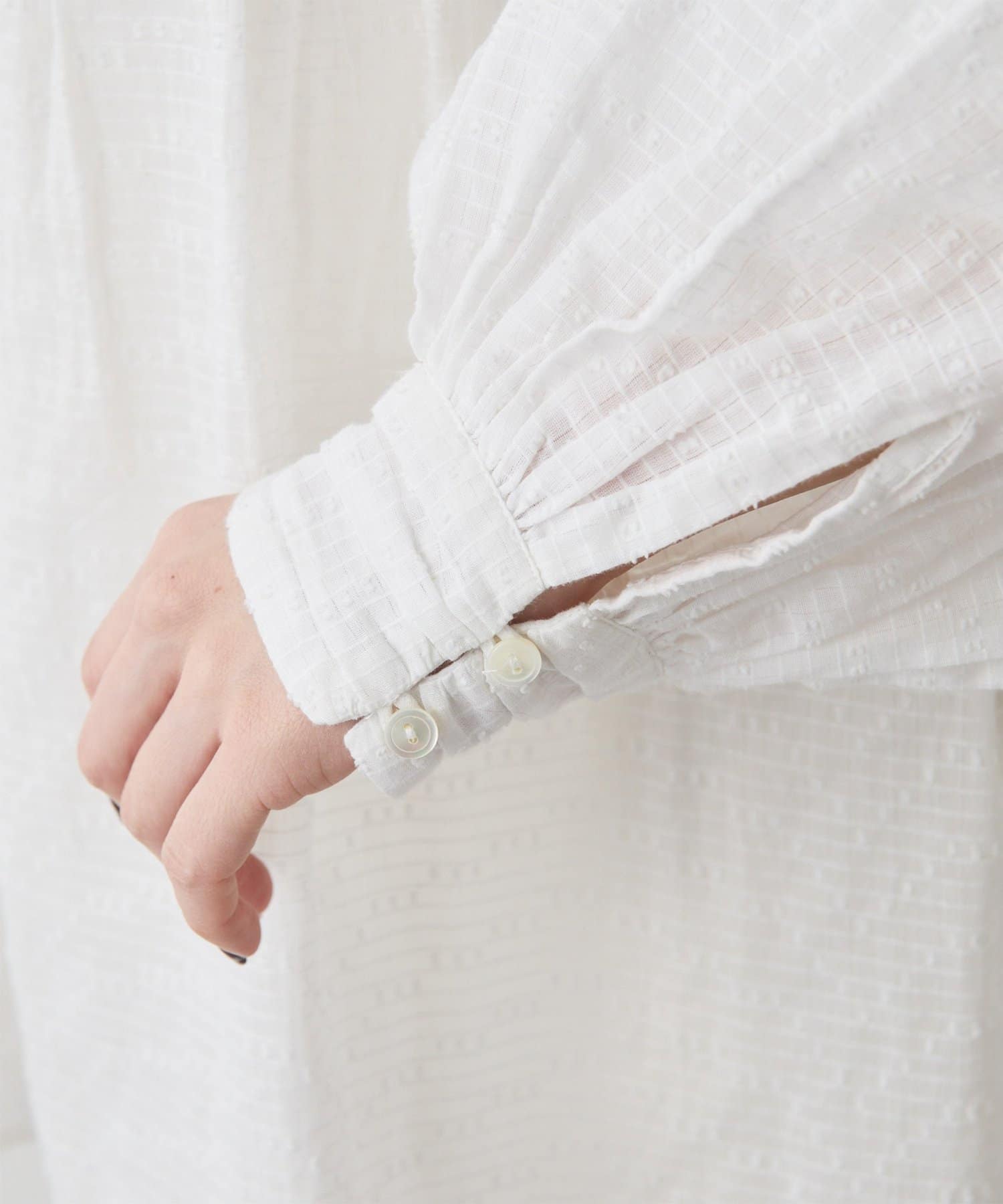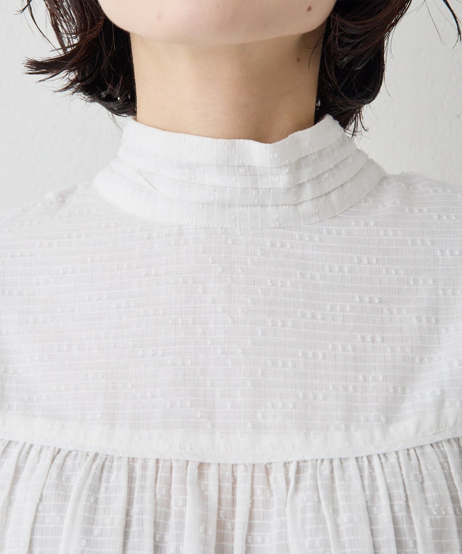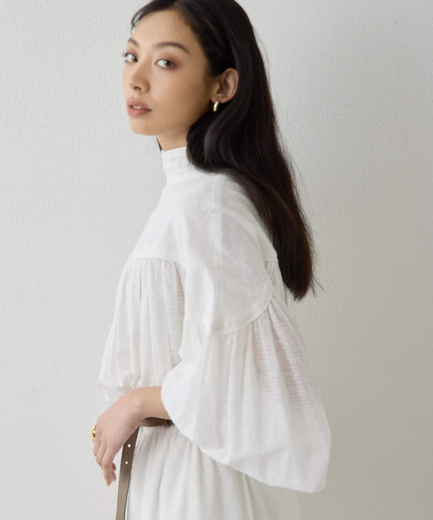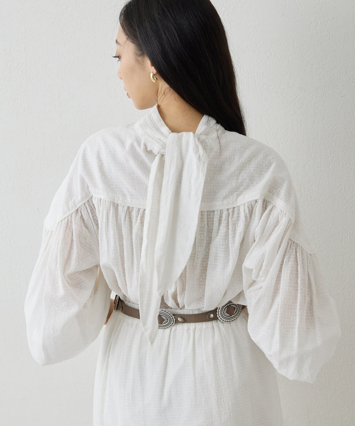 ■首元はリボンタイで女性らしい印象に仕上げ、タックと切り替えギャザーで立体的な表情をプラス。