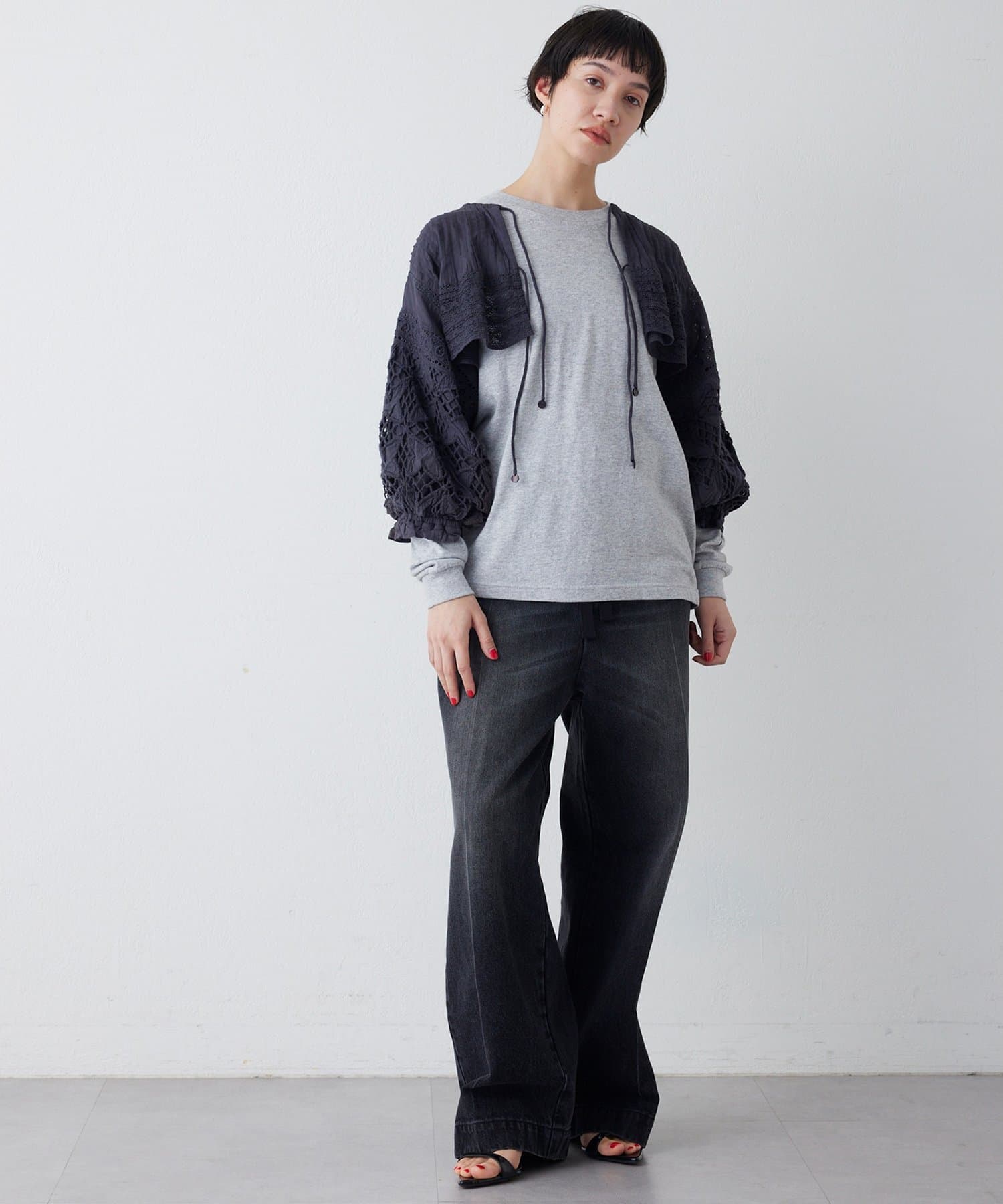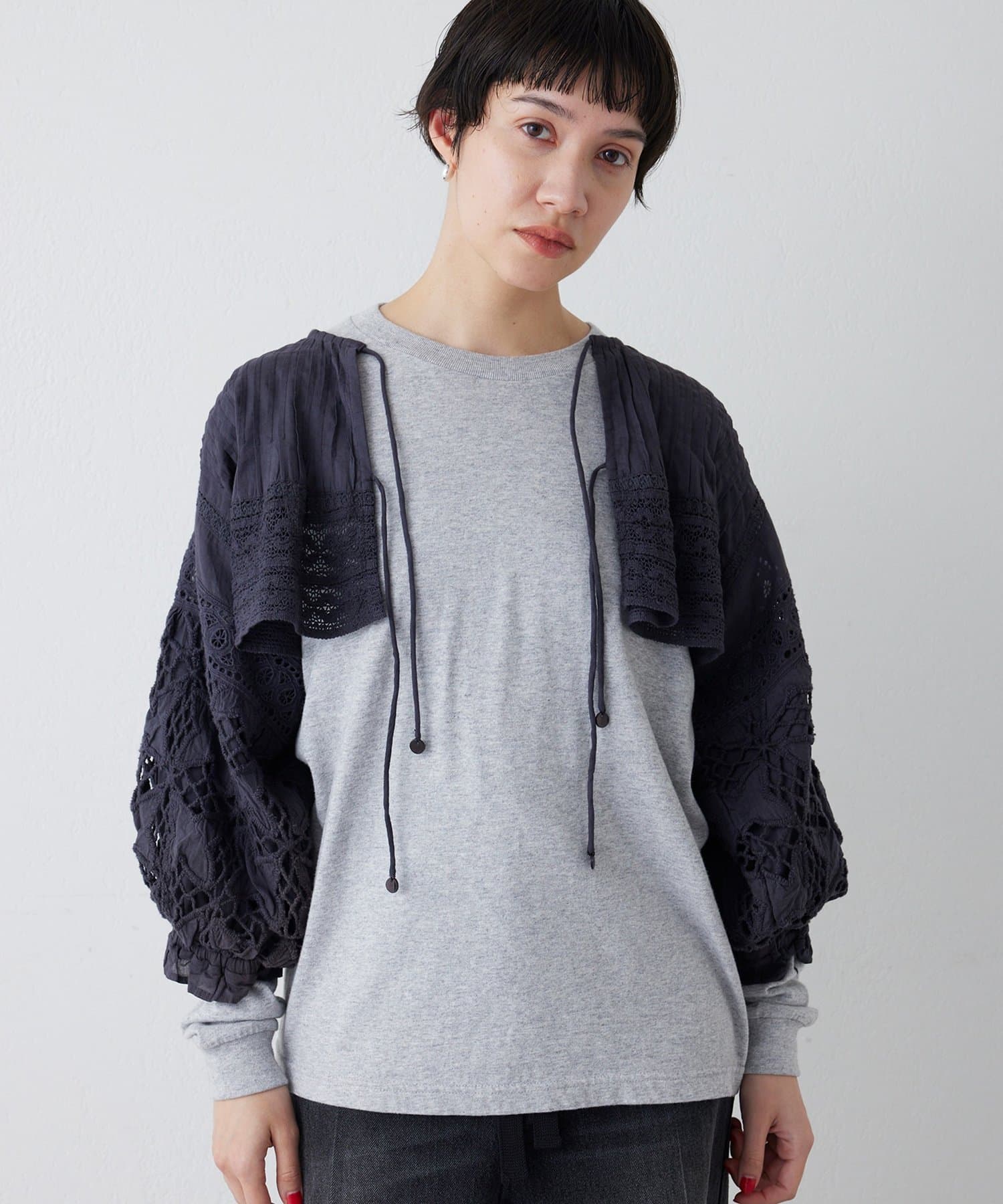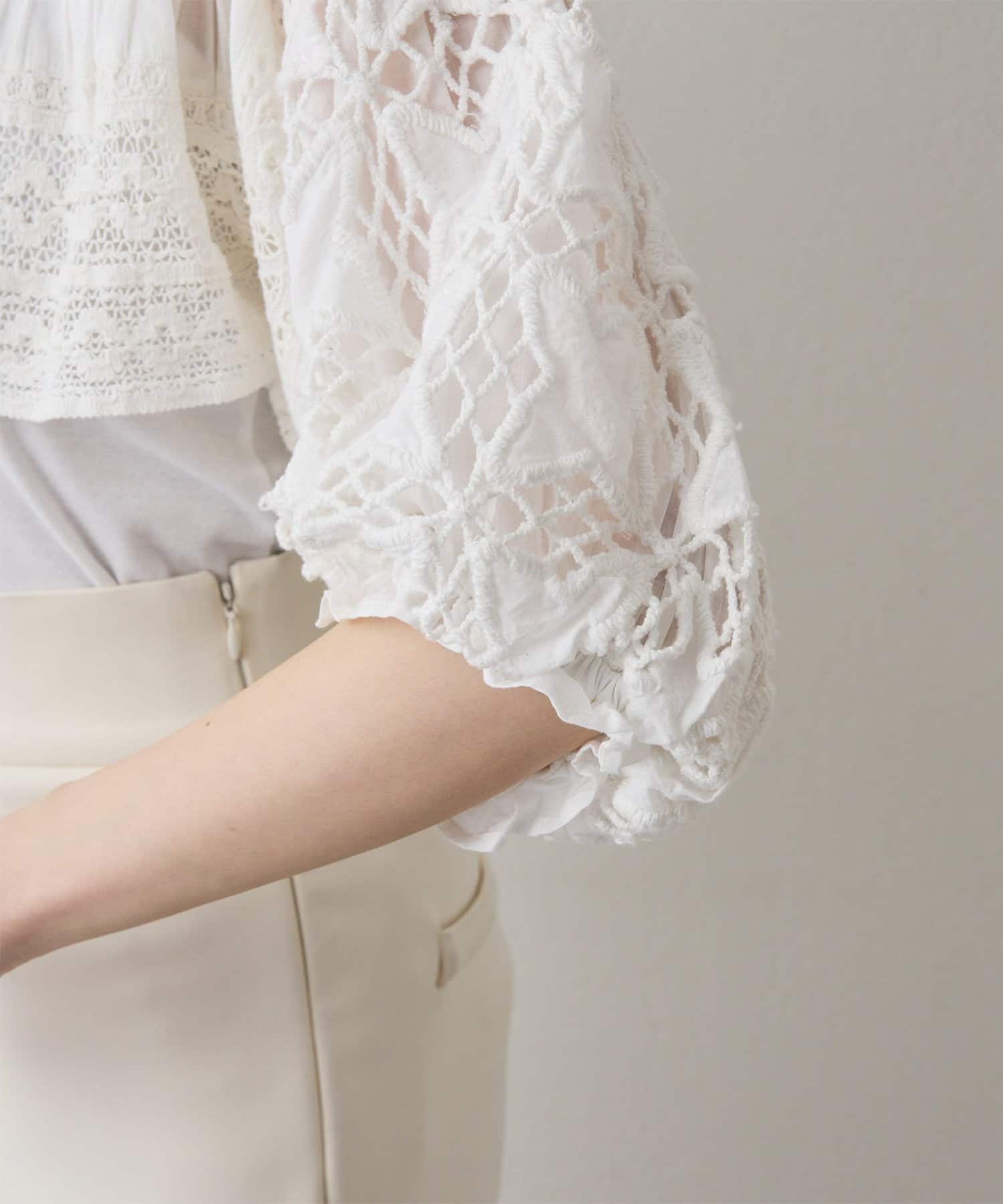 ■スリーブ部分には生地の上から大柄の機械刺繍を施し、部分的に生地をカットすることで立体感のあるスカシのレース柄を表現。