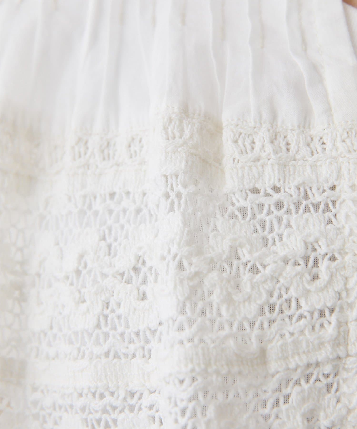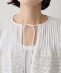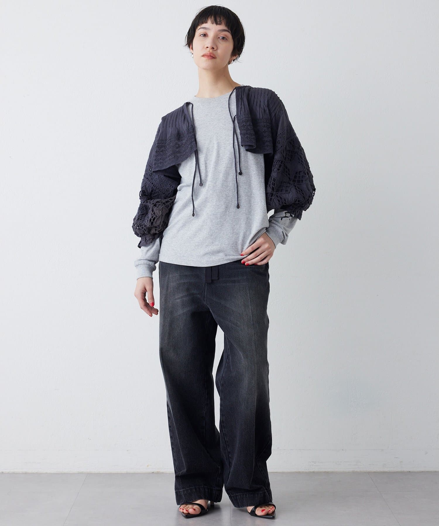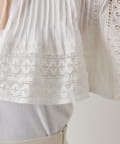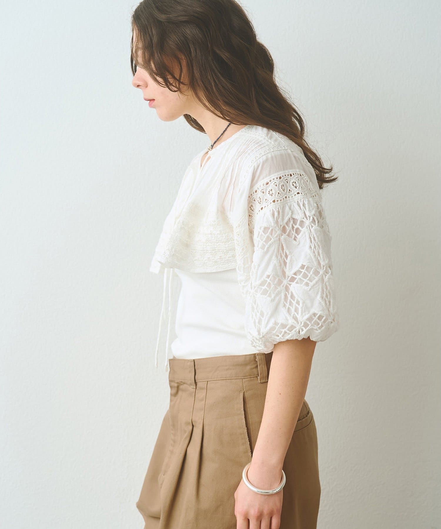 ■スリーブ部分には生地の上から大柄の機械刺繍を施し、部分的に生地をカットすることで立体感のあるスカシのレース柄を表現。