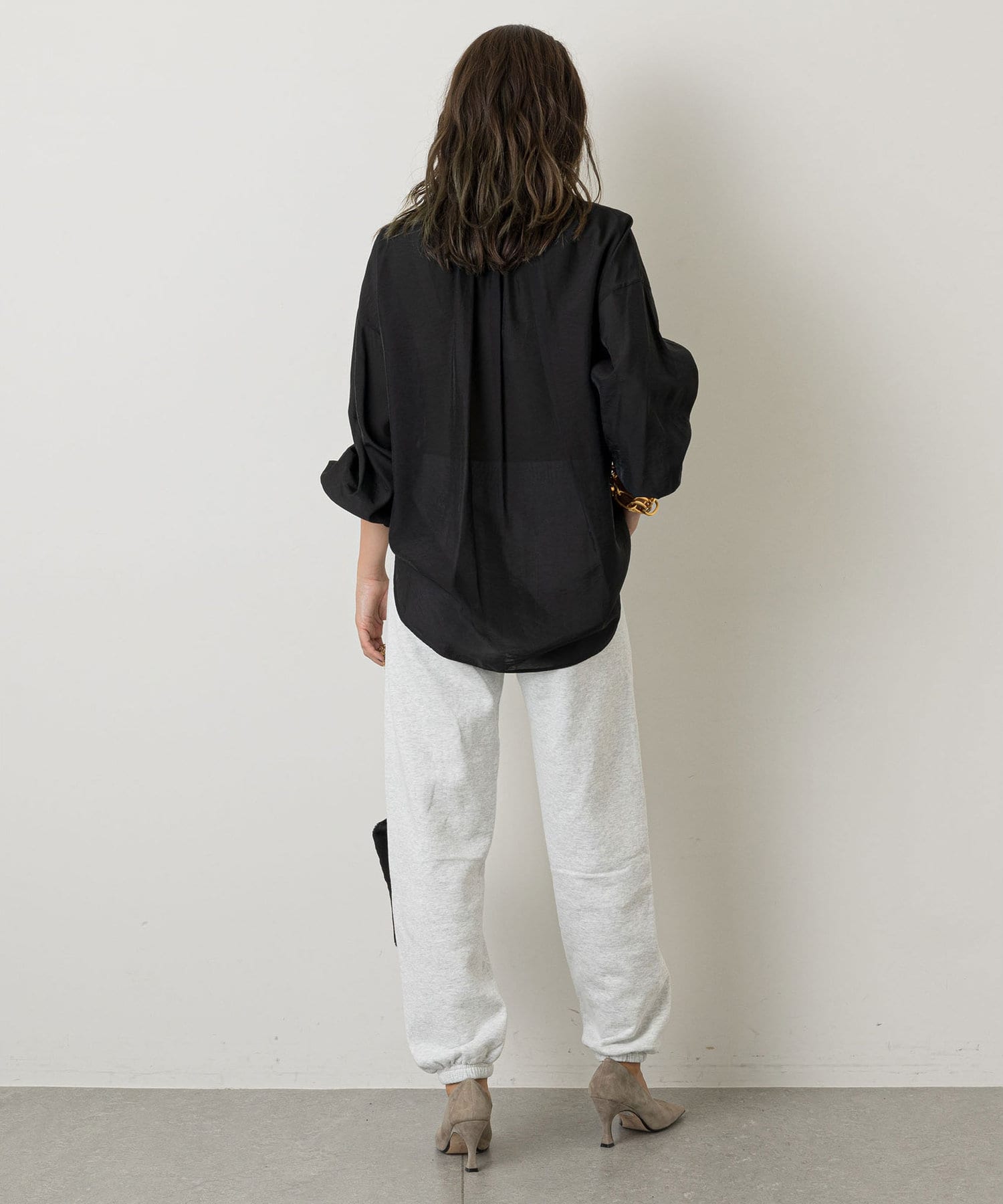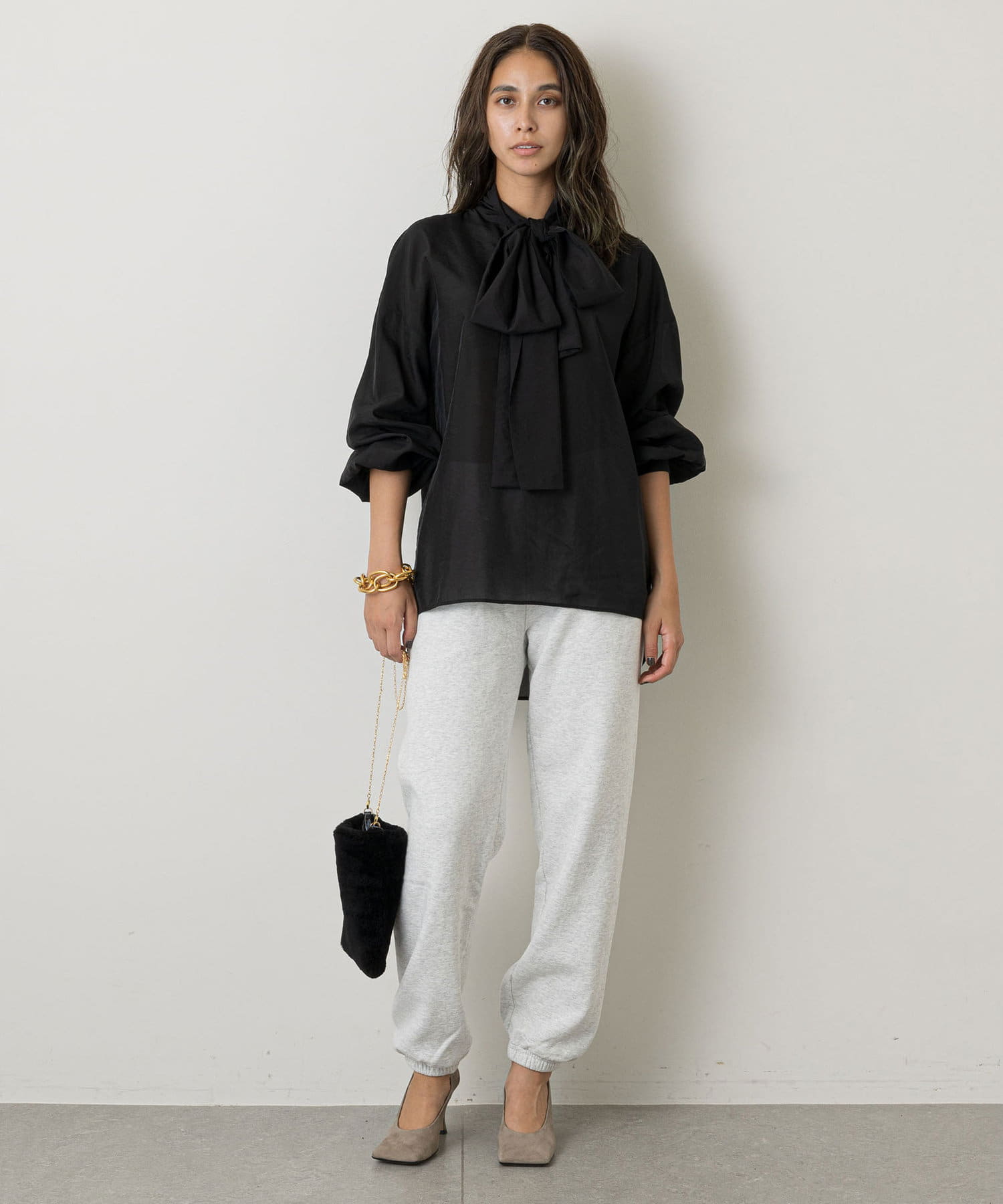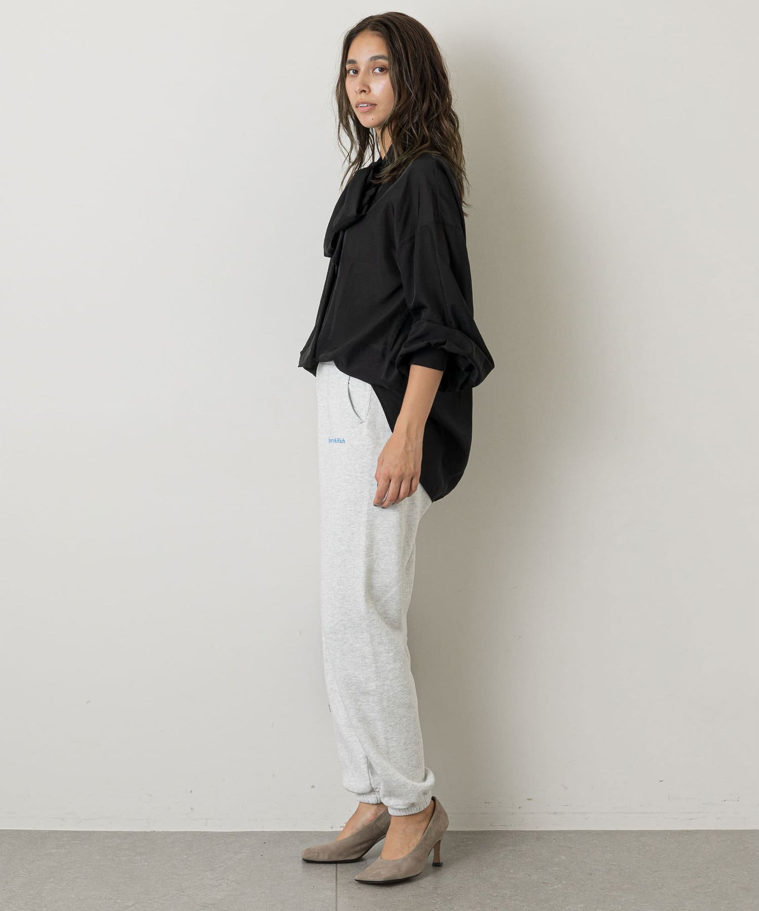裾に太めのゴムが入っているので、足首をきゅっと華奢に見せてシルエットにメリハリを付けてくれるのがうれしいポイント。