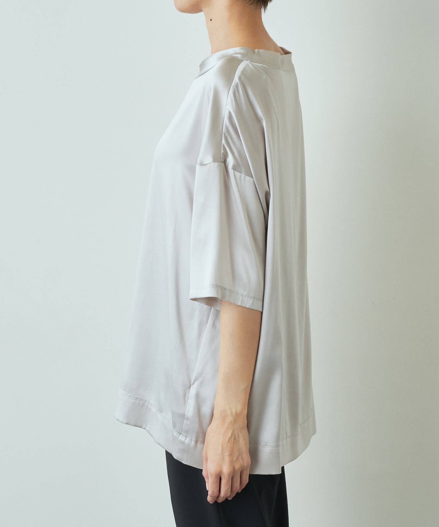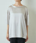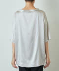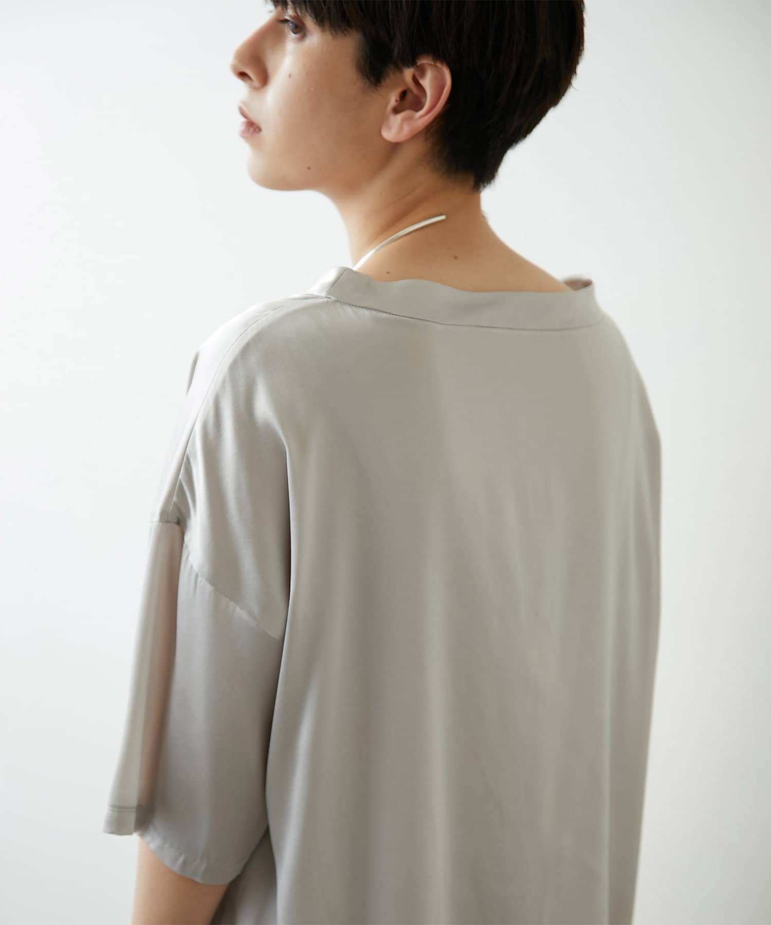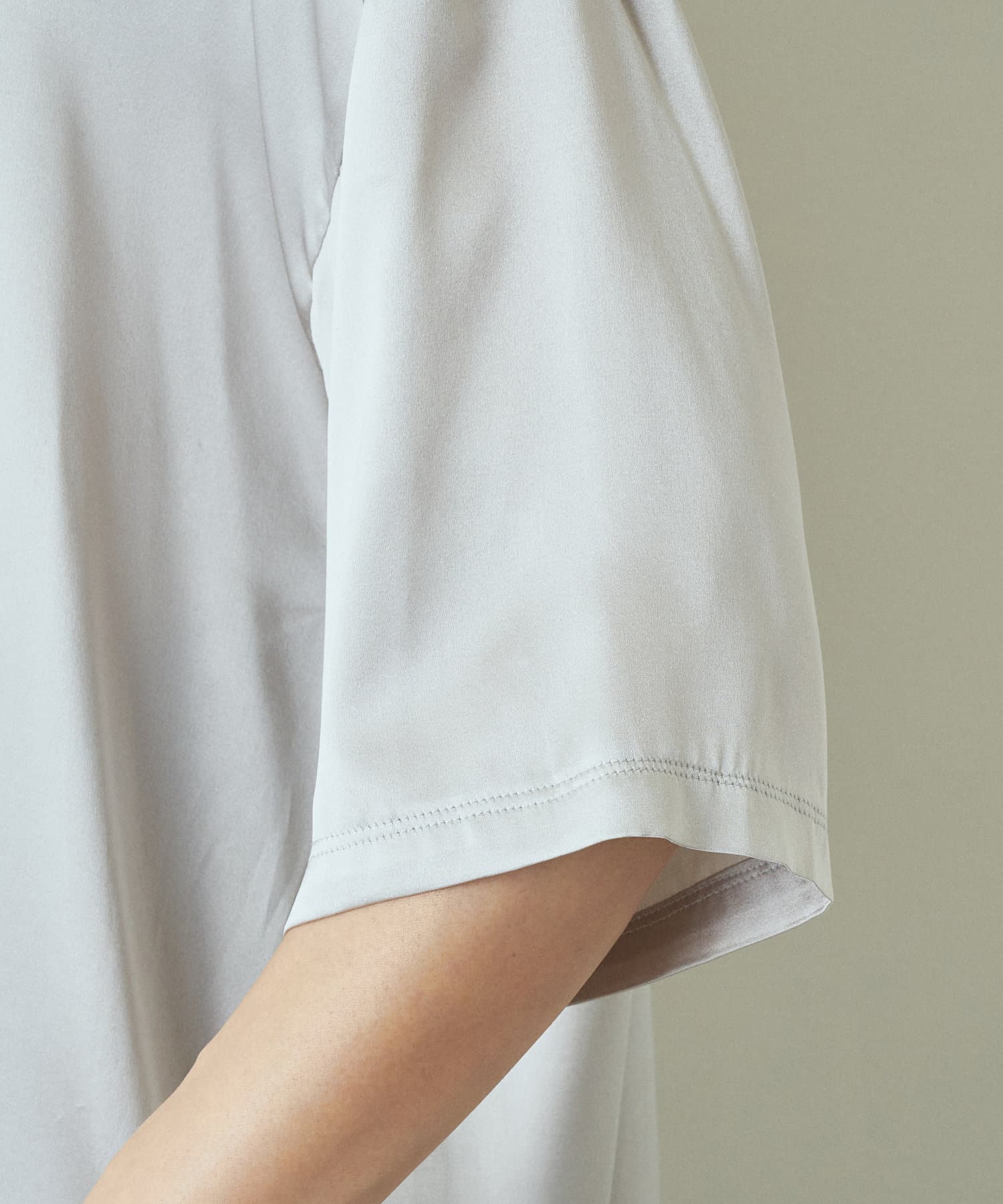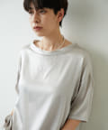 半袖のTシャツライクなデザインとオーバーシルエットがラフなニュアンスを与えつつ、少し開きのあるクルーネックデザインがデコルテをきれいに見せ、ヘルシーな色気をプラス。