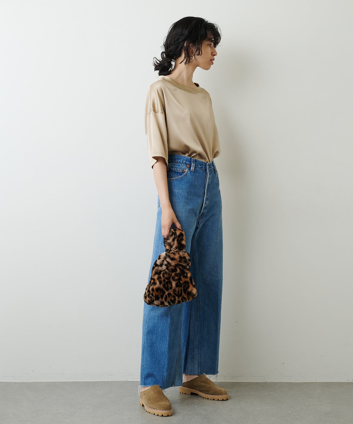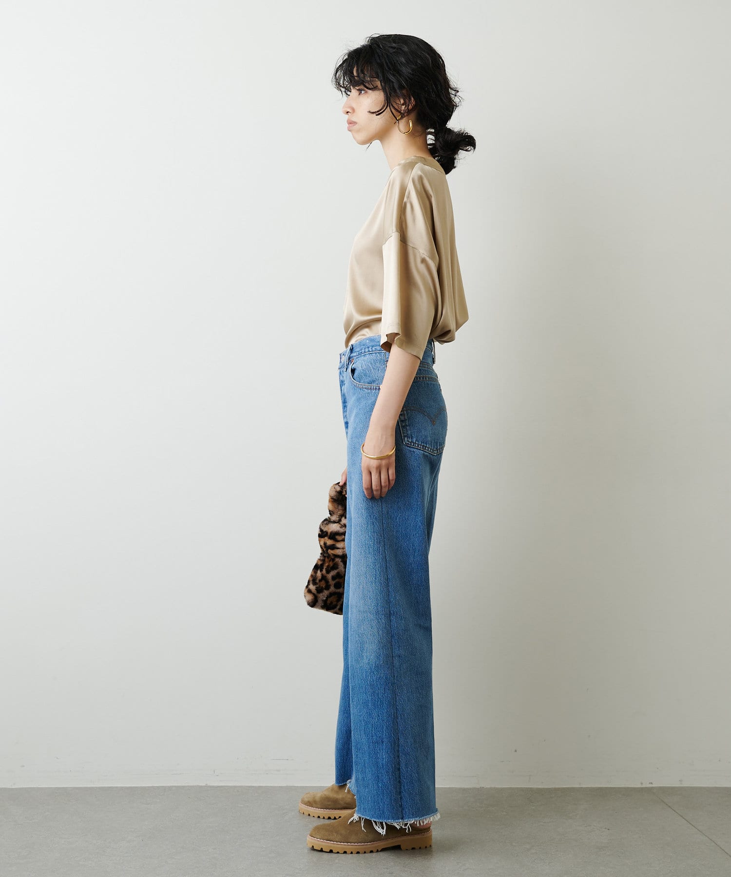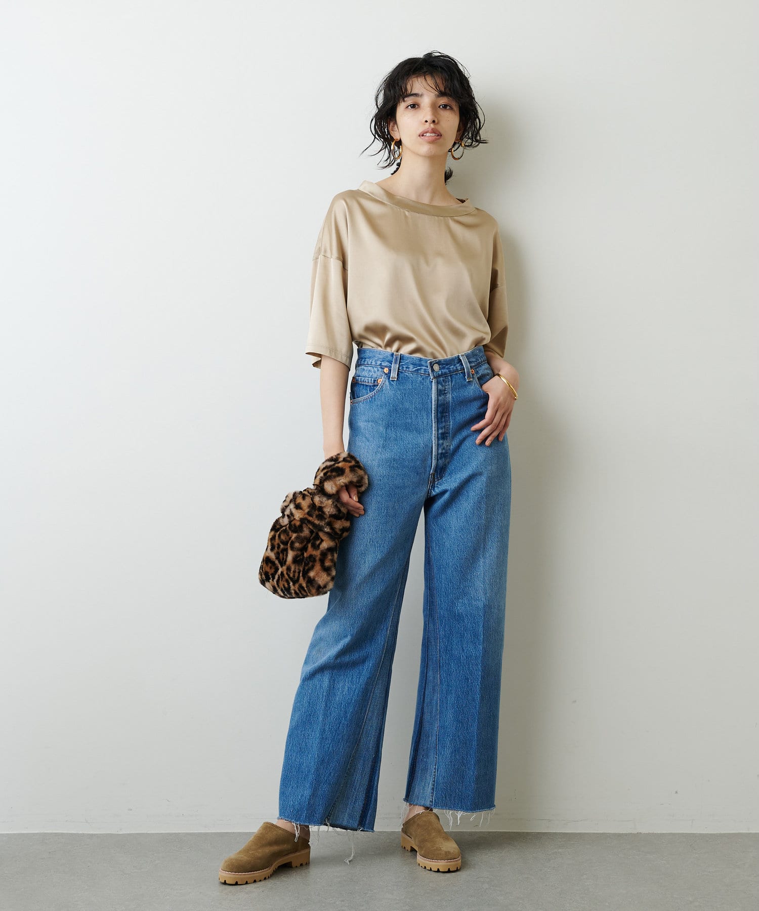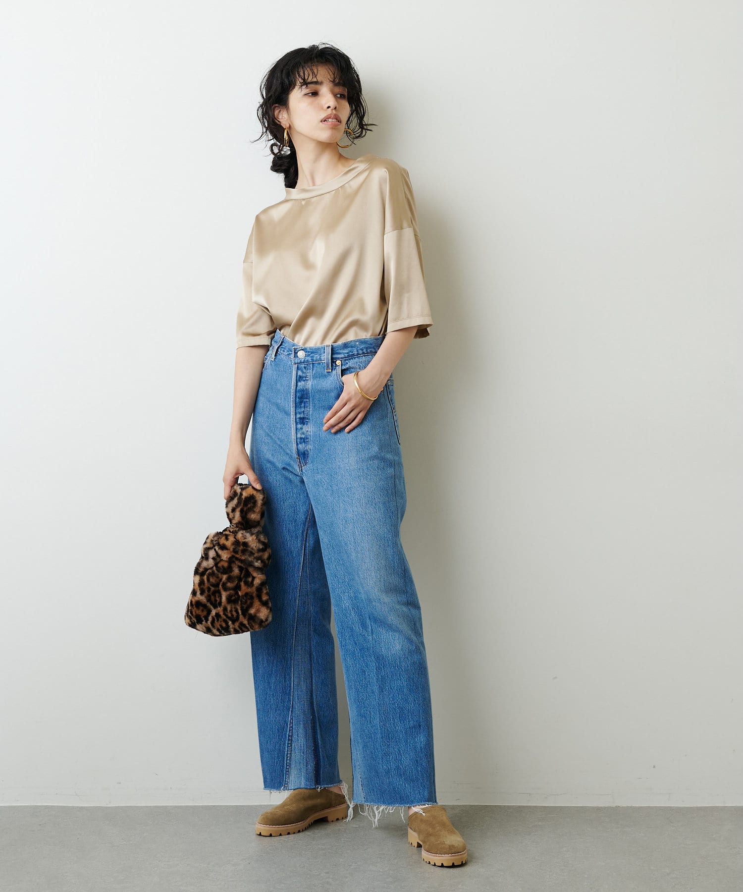 半袖のTシャツライクなデザインとオーバーシルエットがラフなニュアンスを与えつつ、少し開きのあるクルーネックデザインがデコルテをきれいに見せ、ヘルシーな色気をプラス。