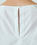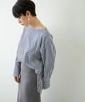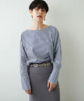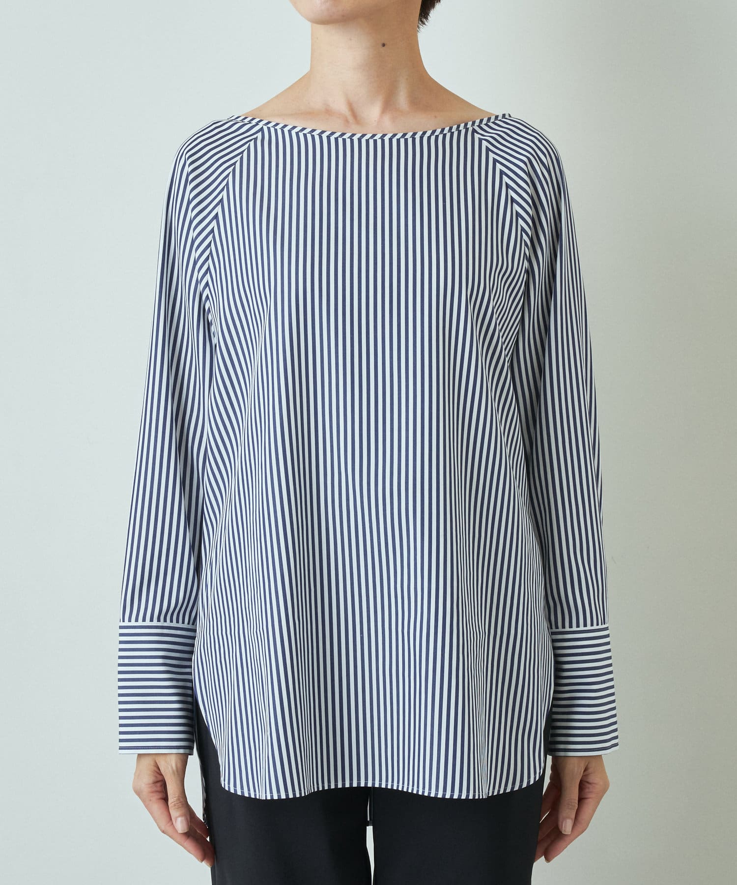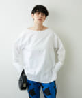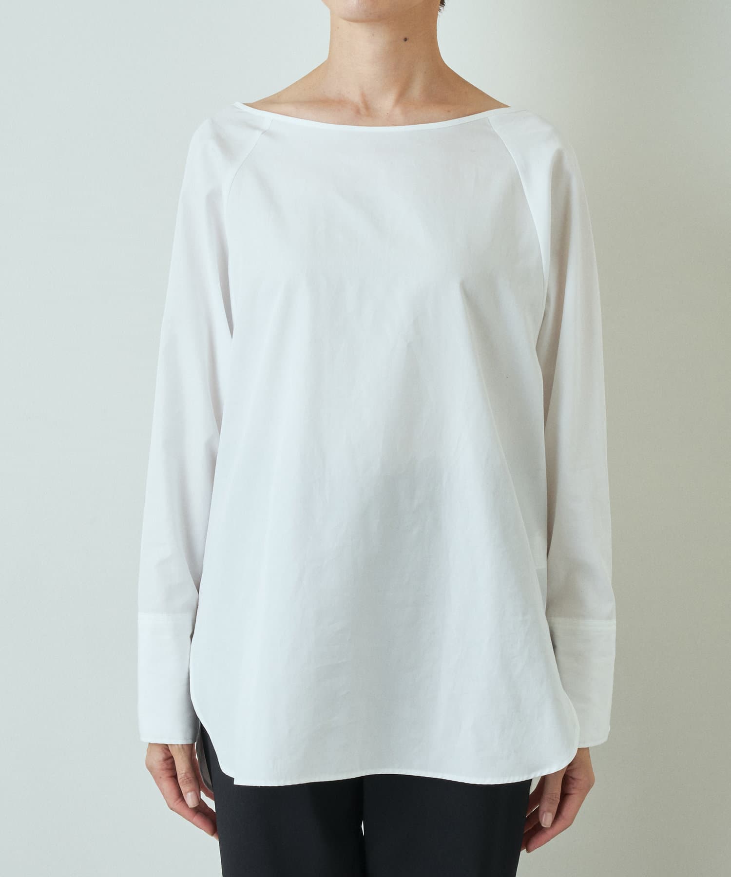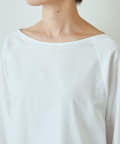 デコルテをきれいに見せてくれるボートネックや、バックスタイルのさりげないスリット開きが女性らしく、袖の切り替えをラグランスリーブにすることでラフな表情もプラスしました。