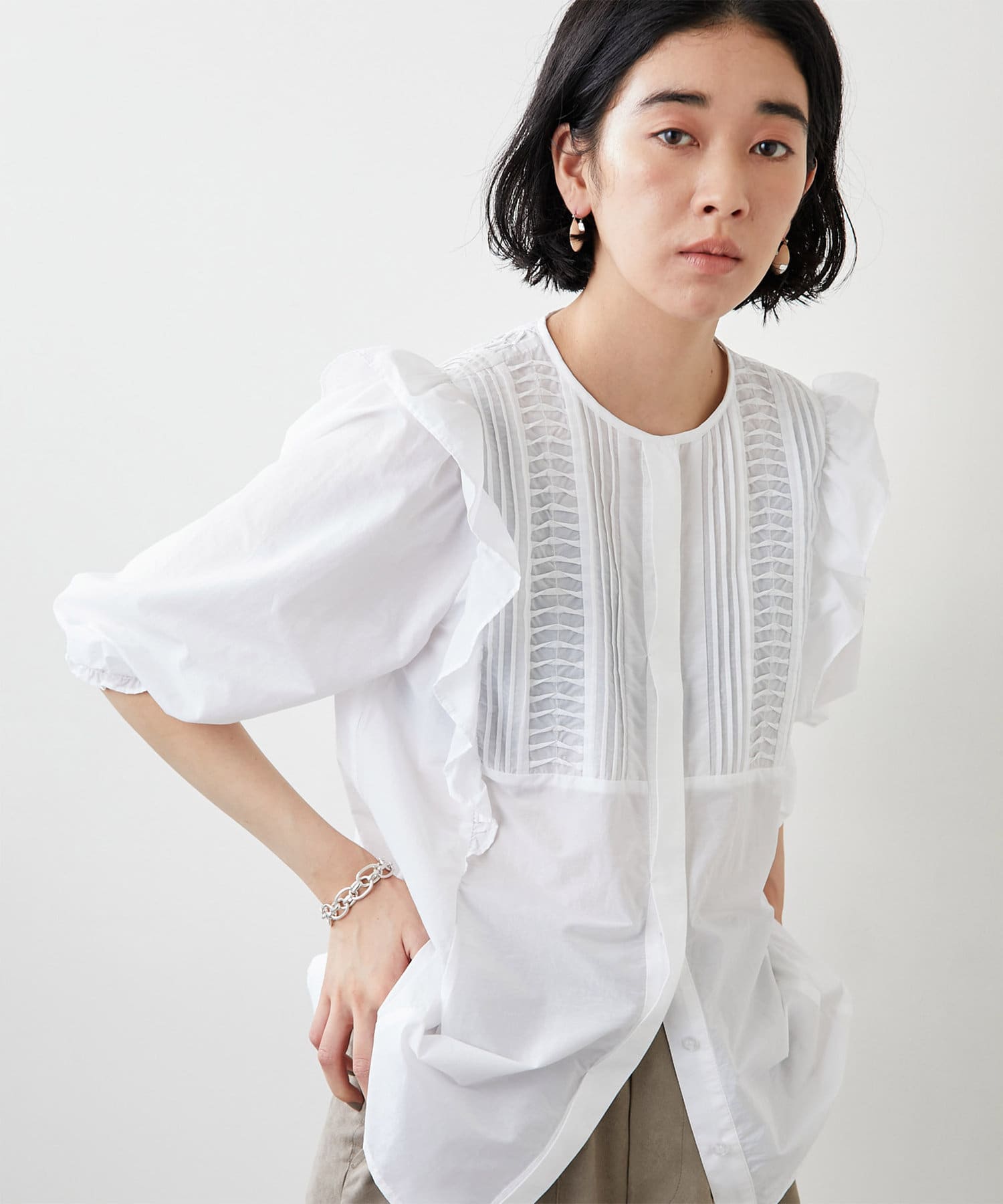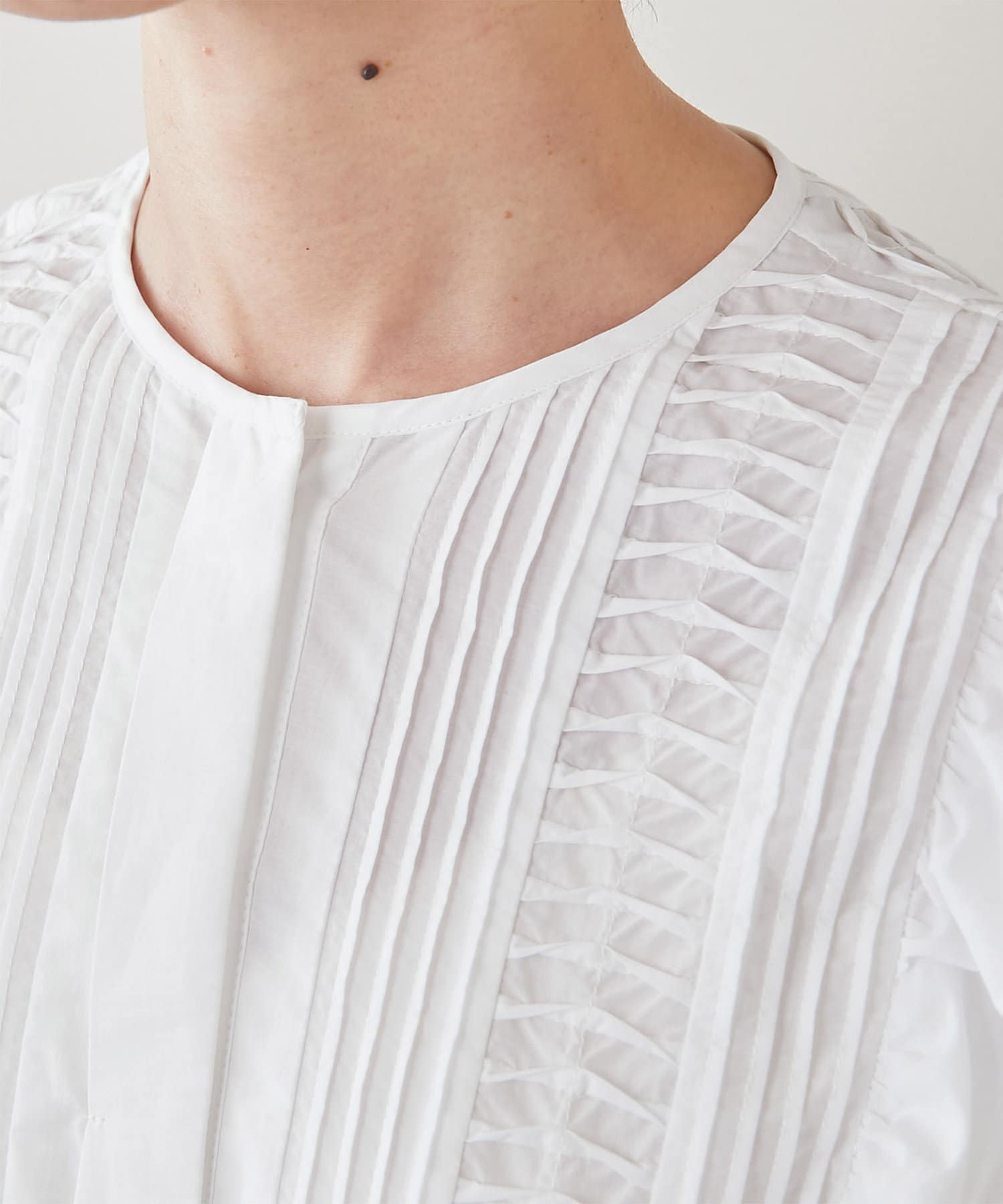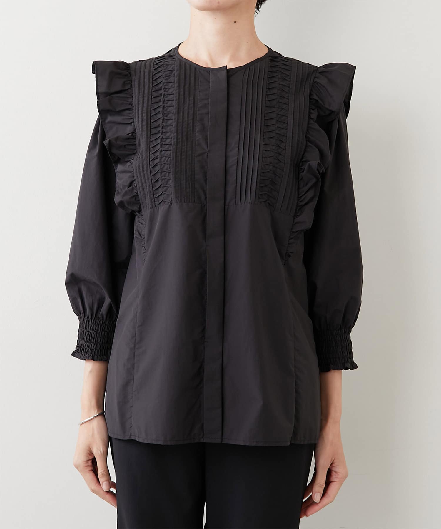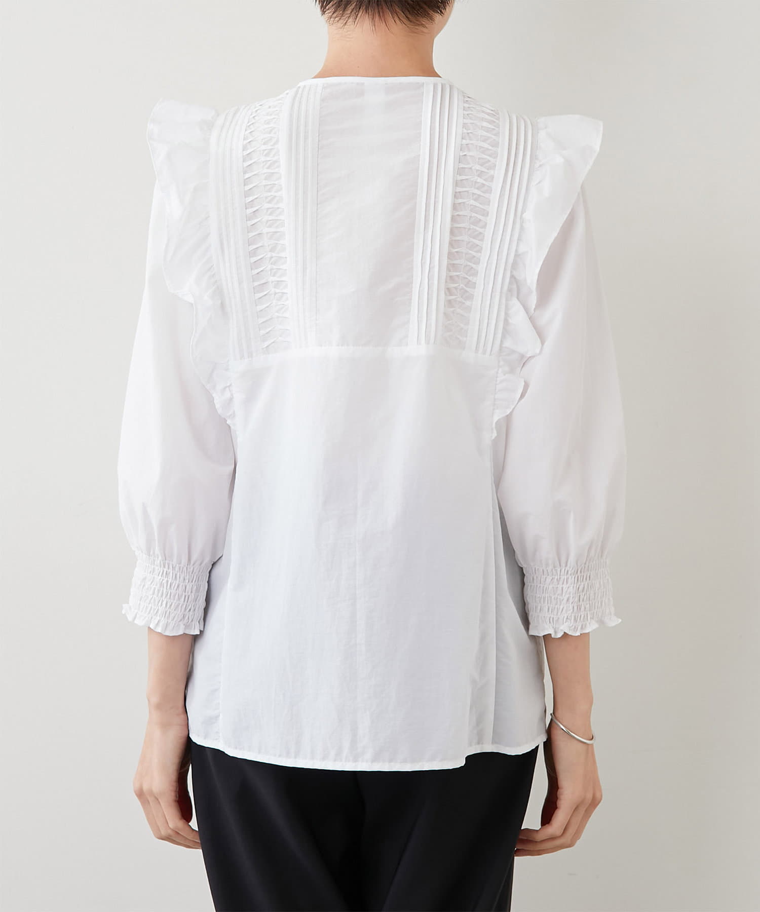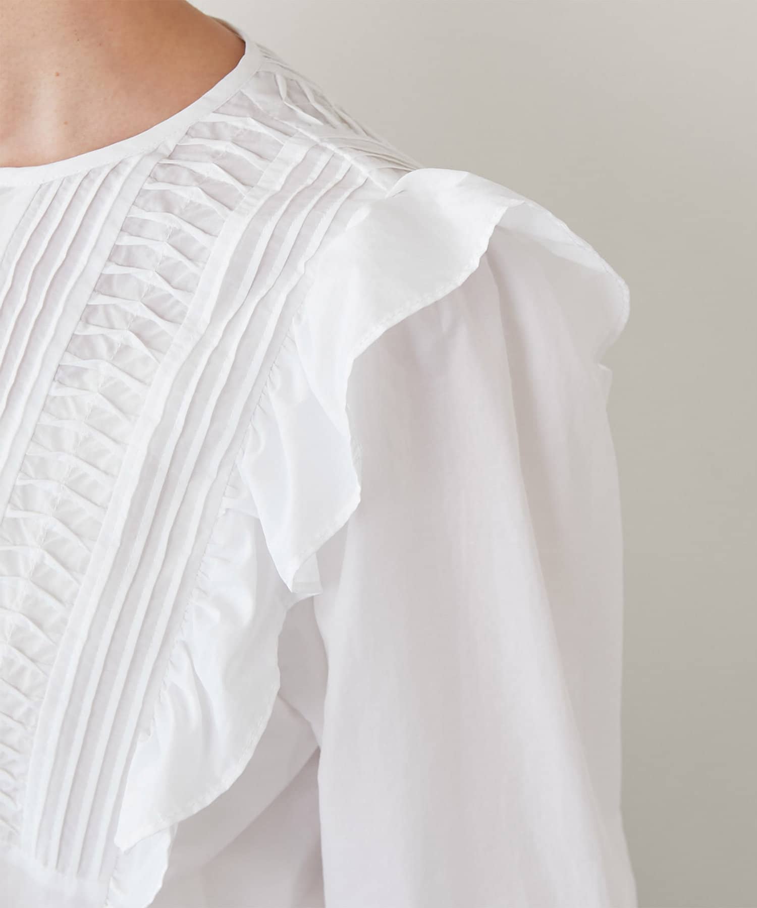 前後のピンタックと肩のフリルが目を惹くデザインブラウス。