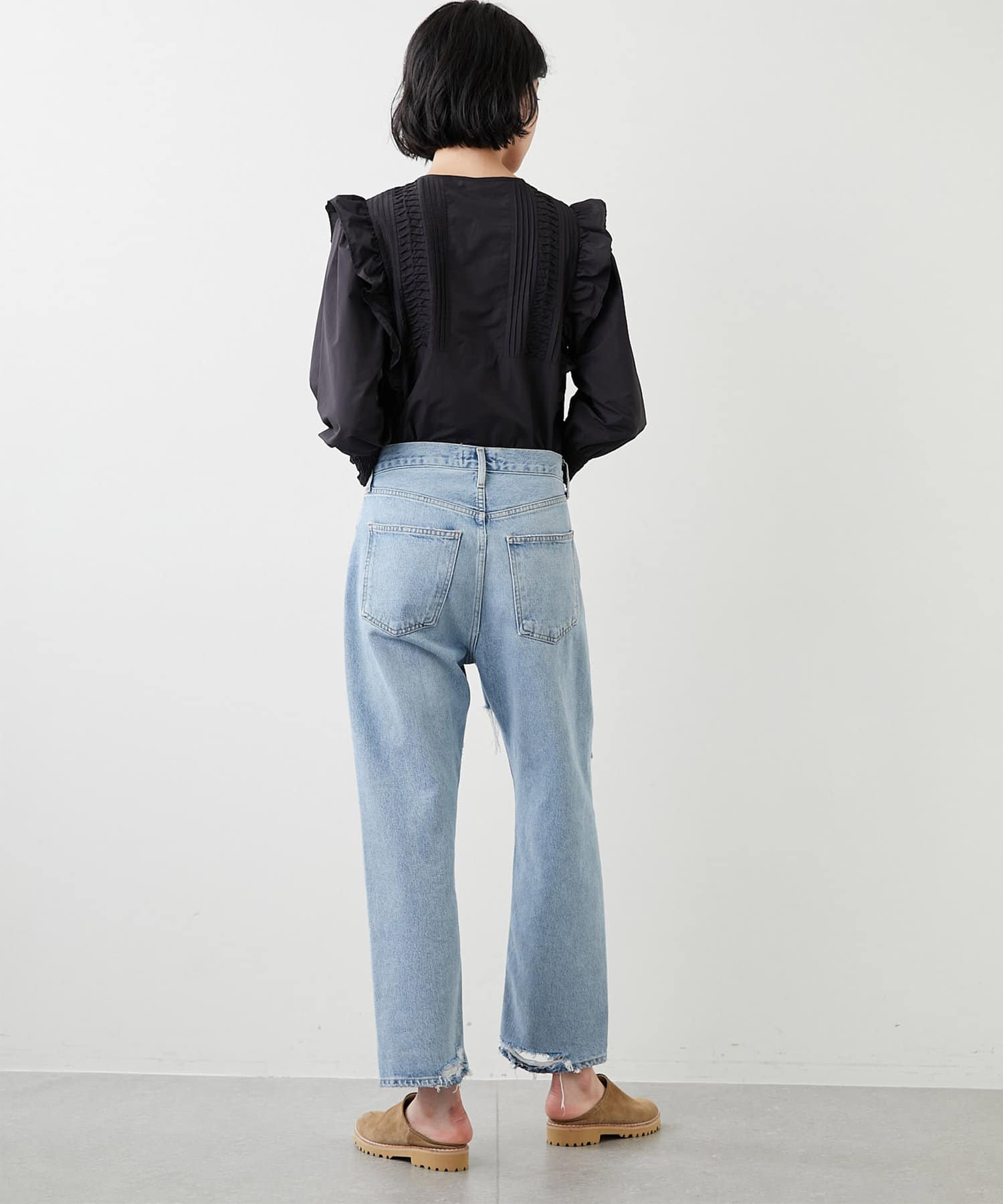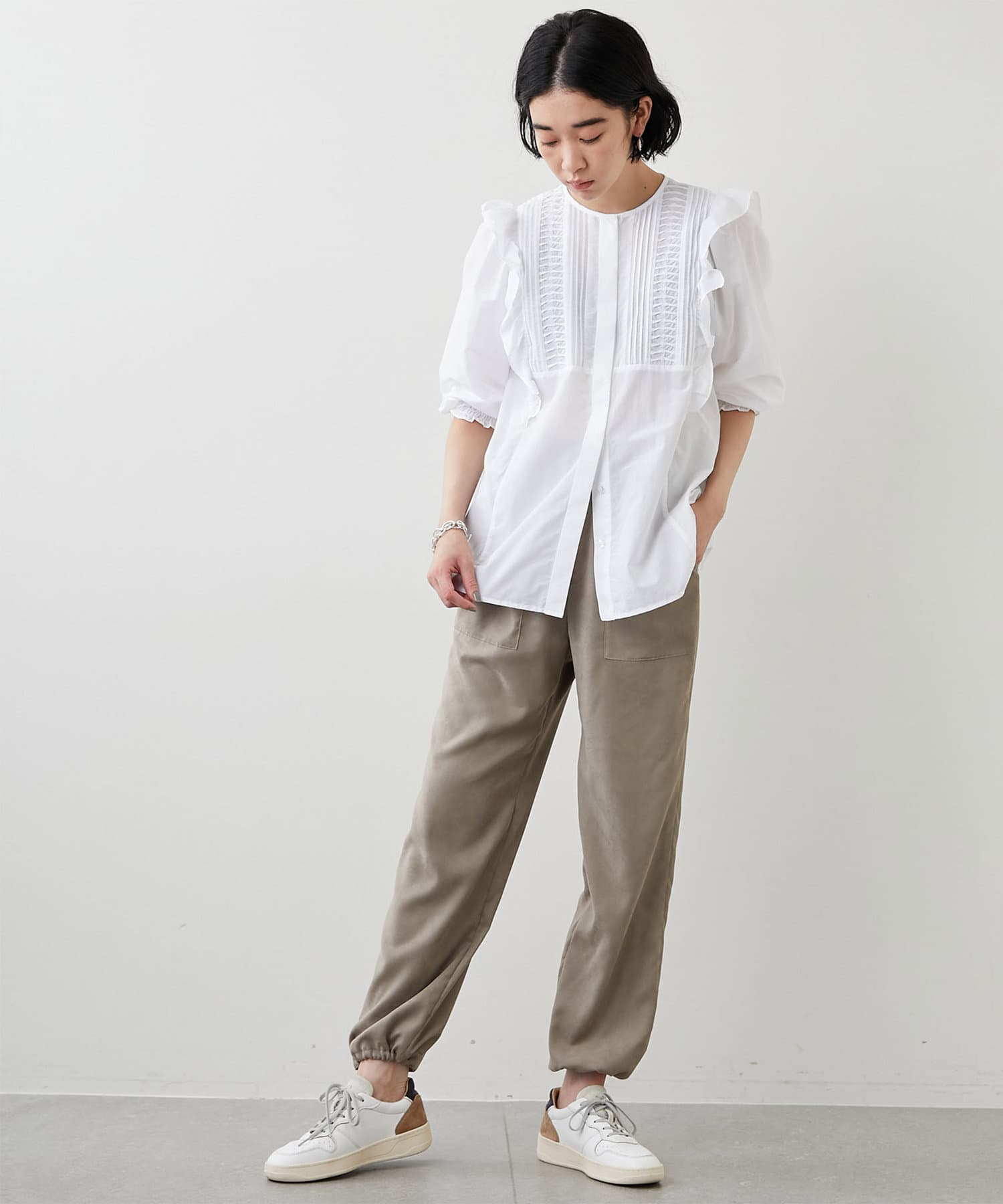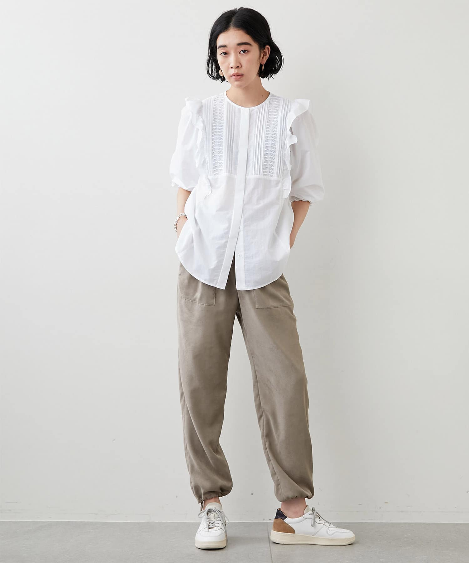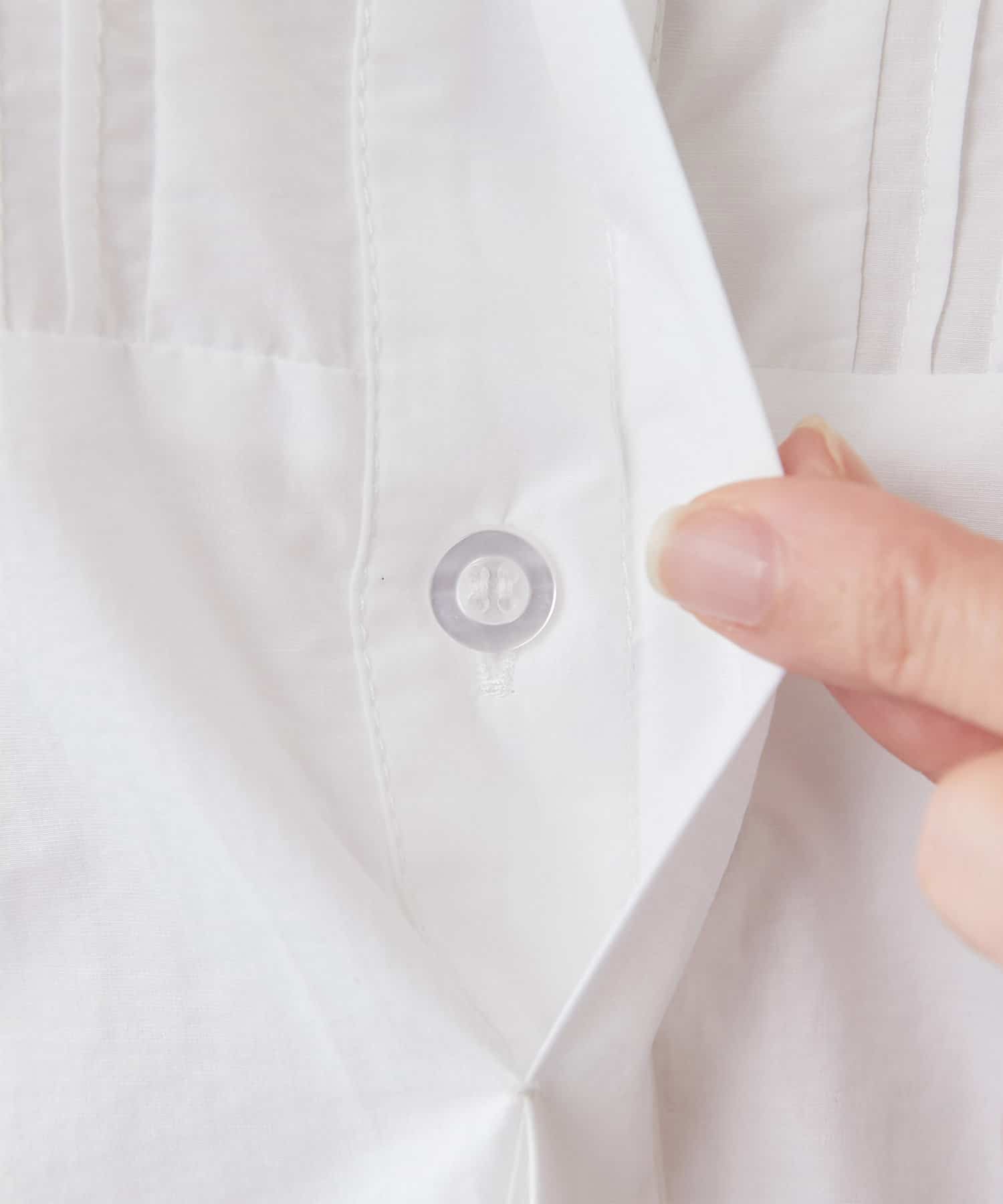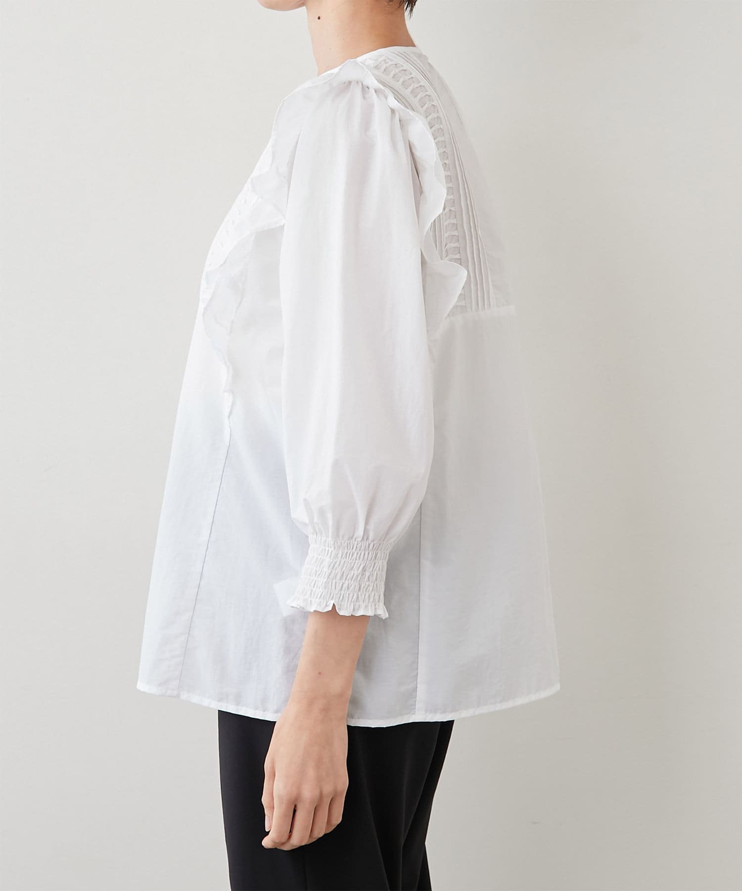 前後のピンタックと肩のフリルが目を惹くデザインブラウス。