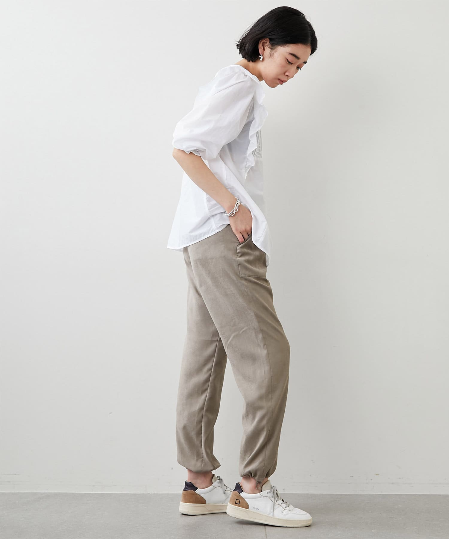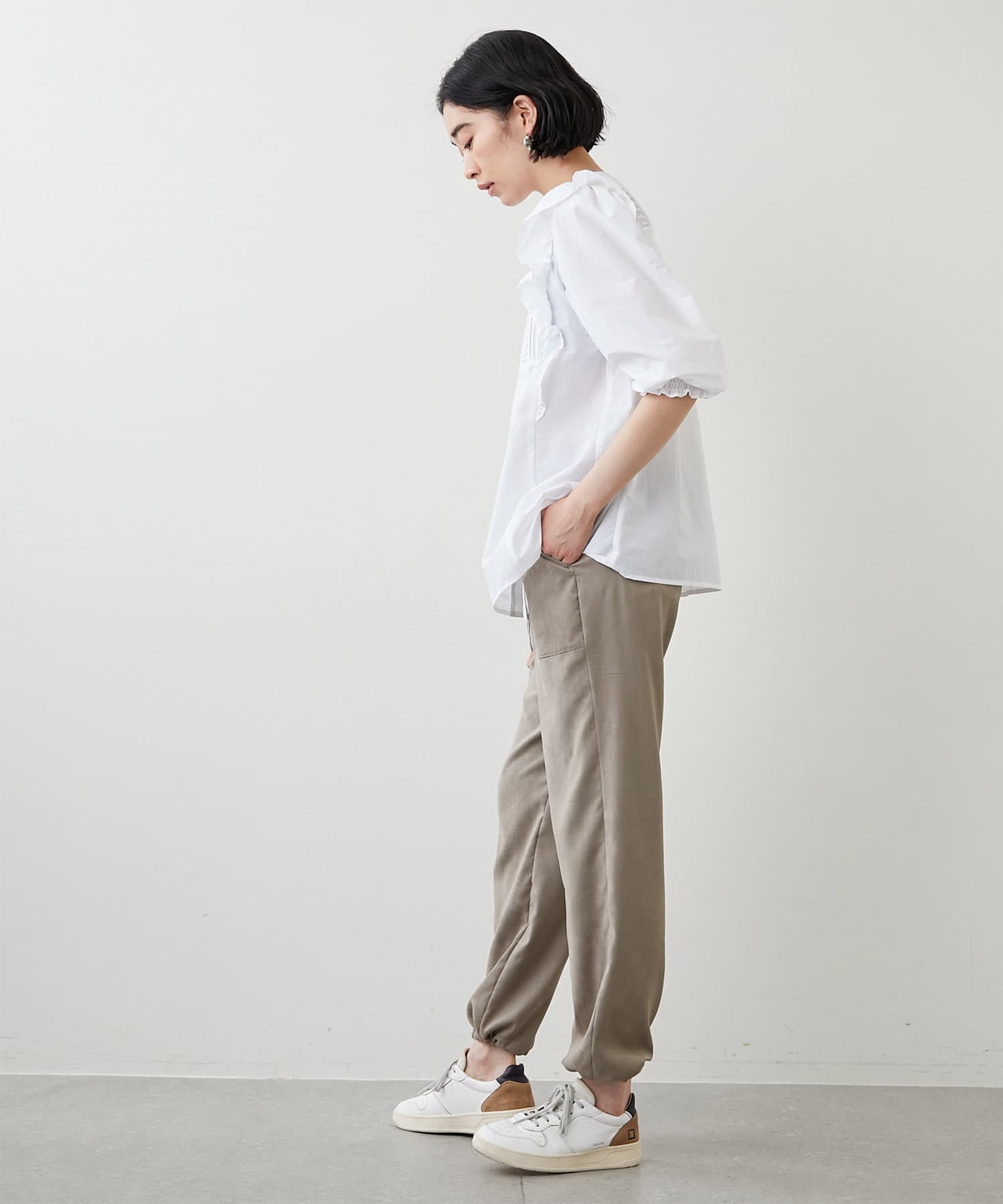 女性らしいAラインのシルエットや、ゴムシャーリングでふんわり感を出したパフスリーブが大人かわいい印象ながら、首元をすっきり見せるクルーネックやフライフロント仕立てで甘さを抑え、大人のスタイリングにもしっくりと馴染むデザイン。