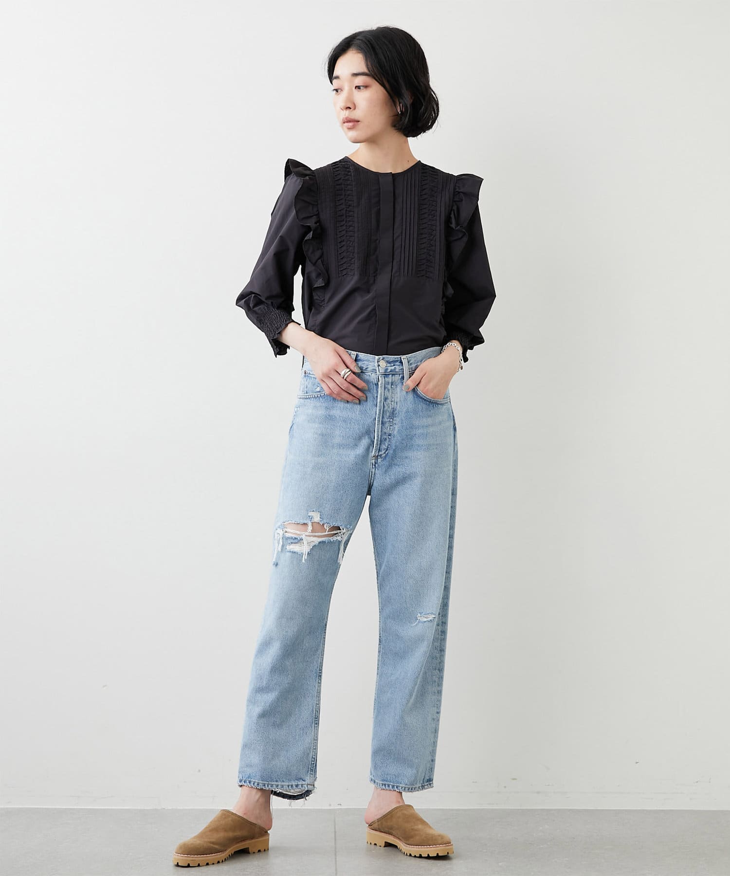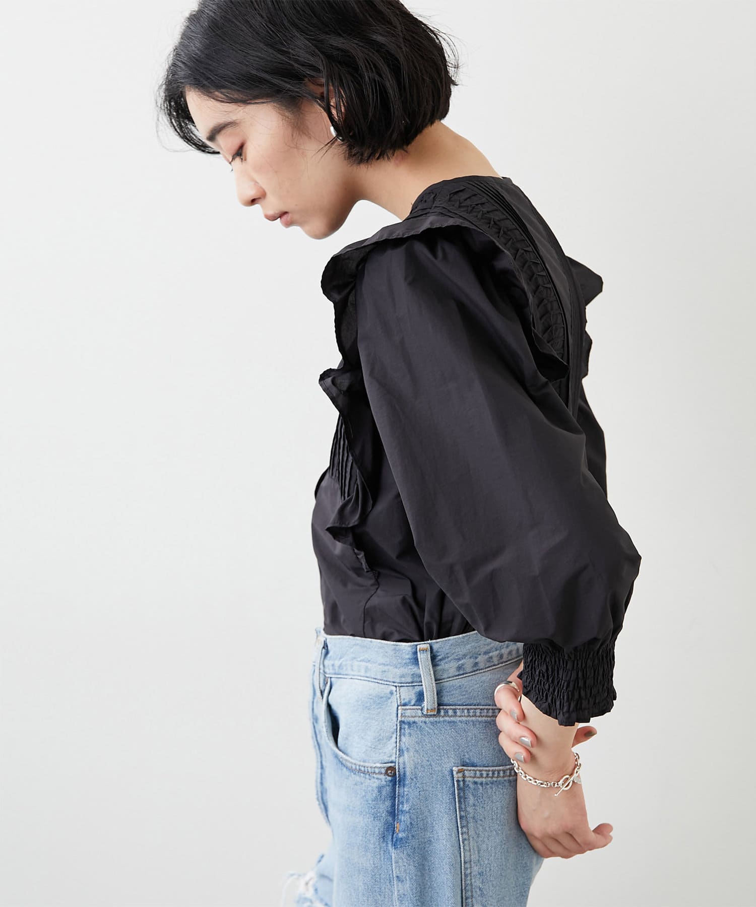 デザイン性のあるブラウスは一枚でも様になり、コーディネートにプラスするだけで一気に旬顔に決まるおすすめのアイテムです。