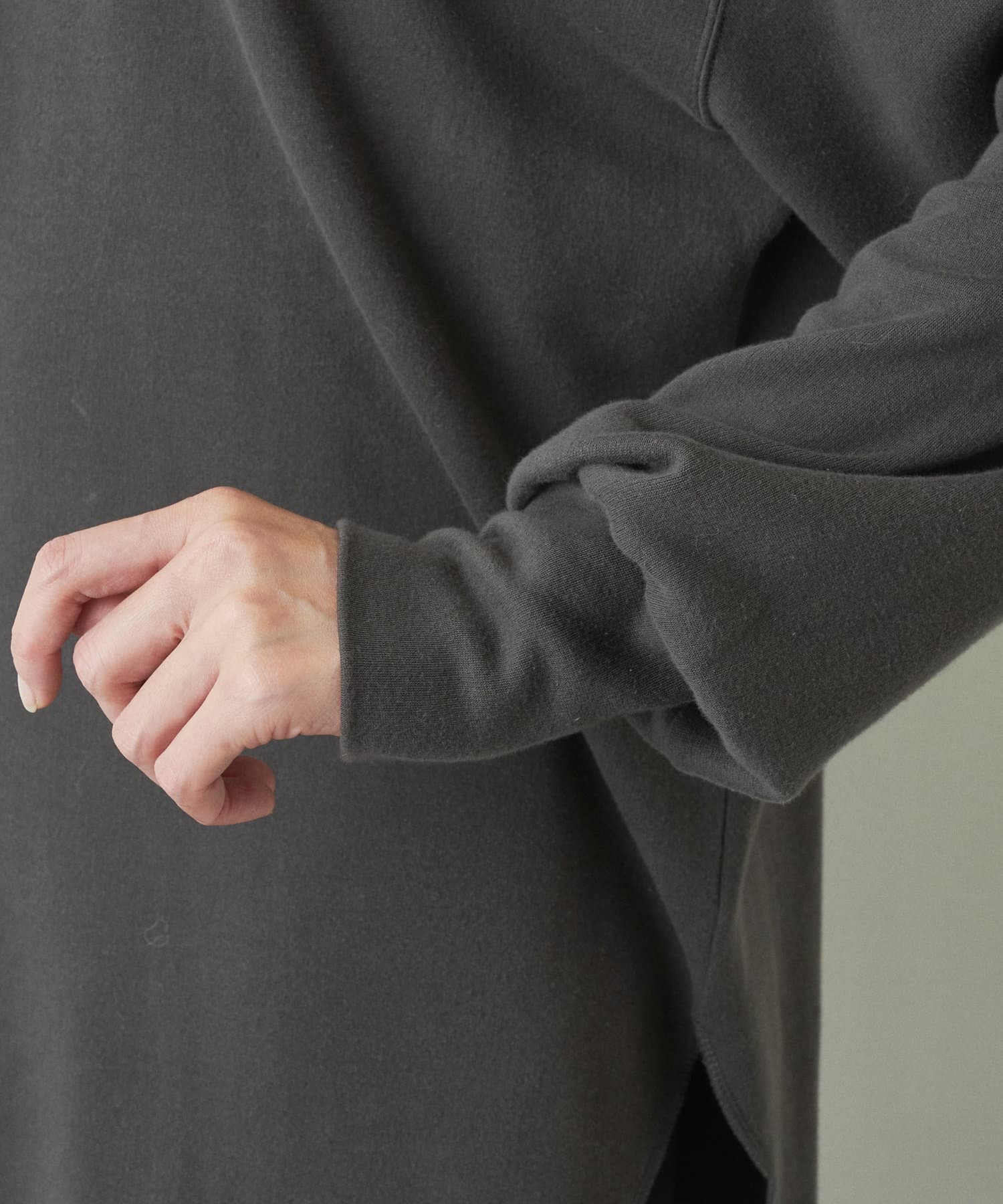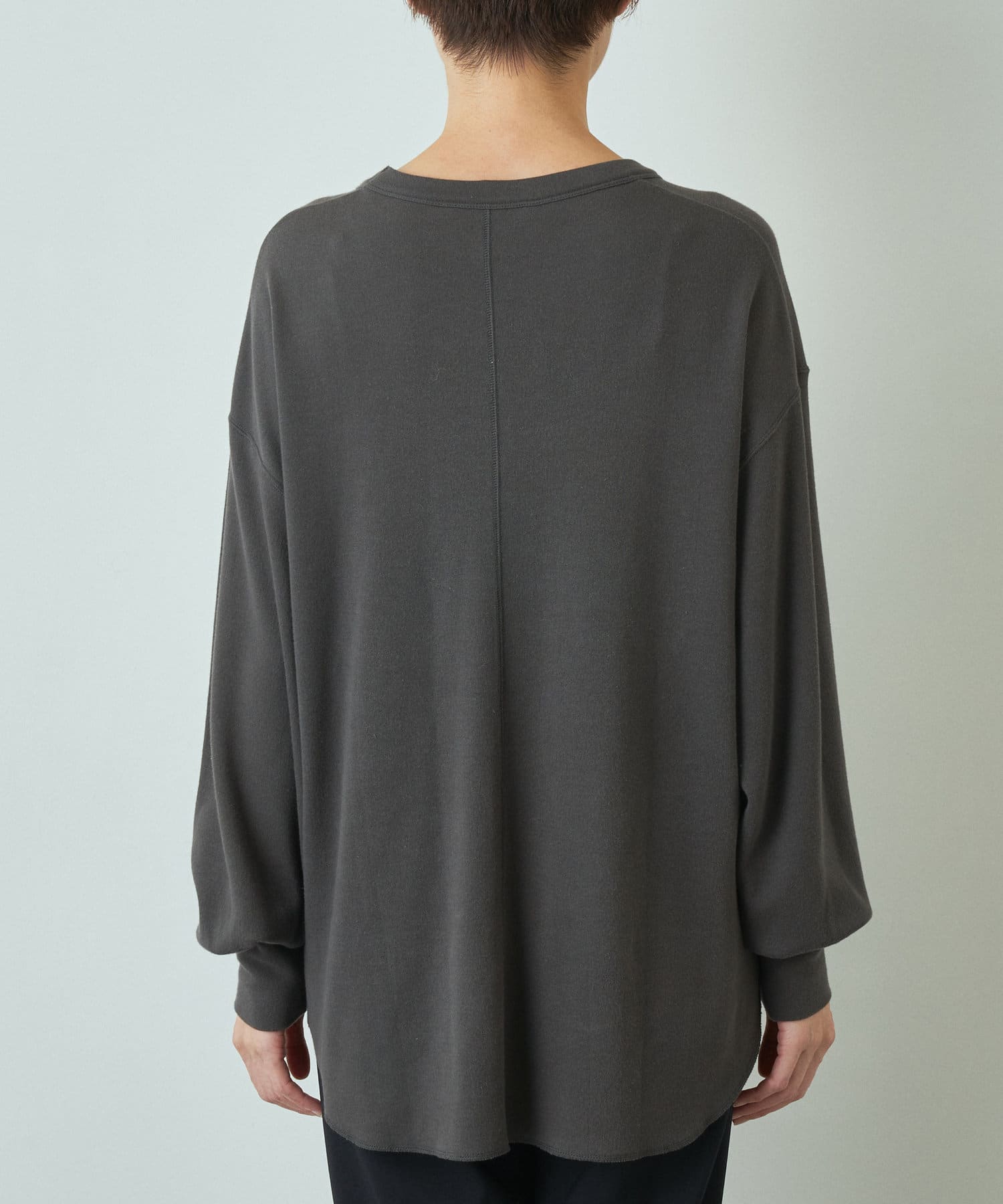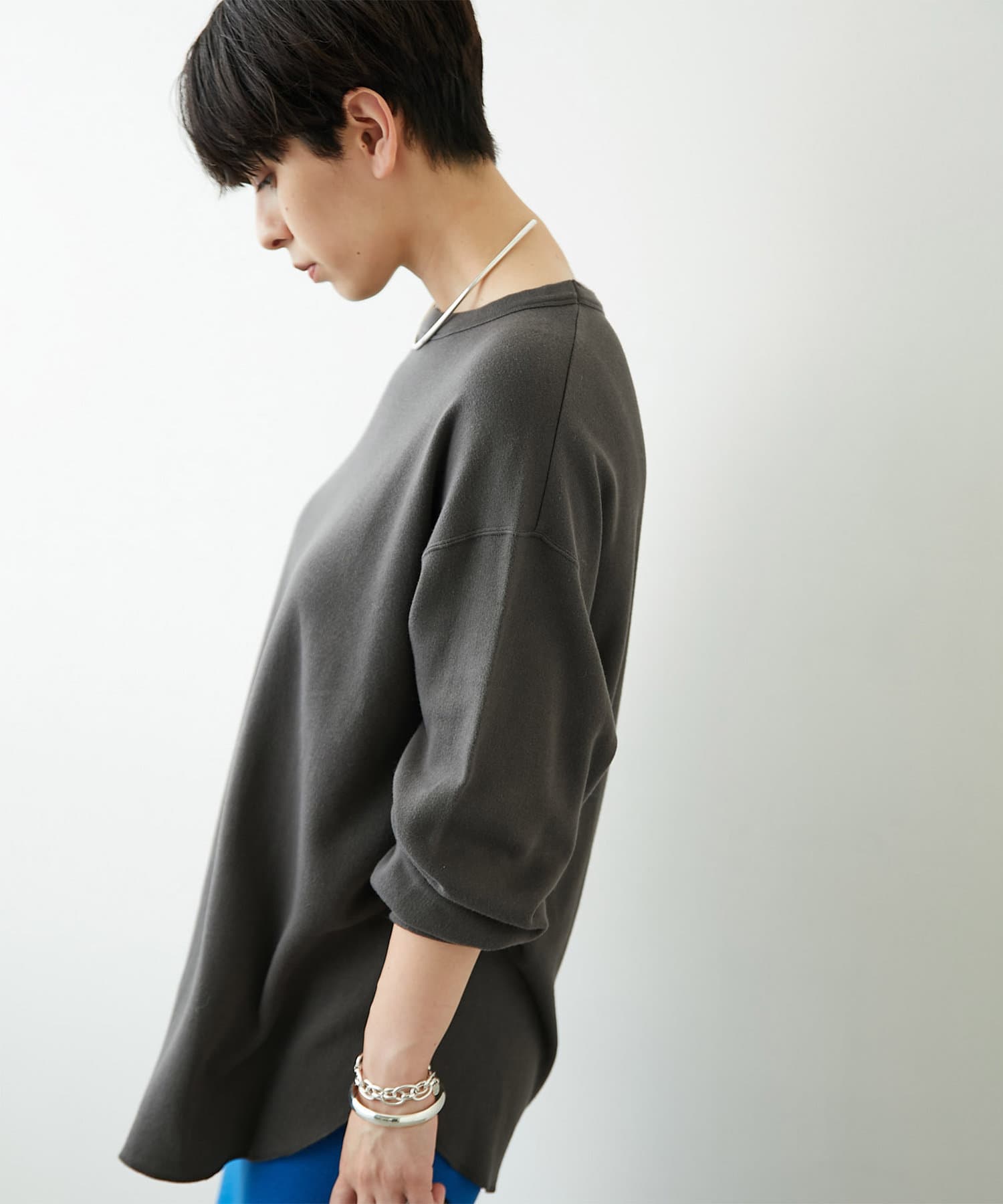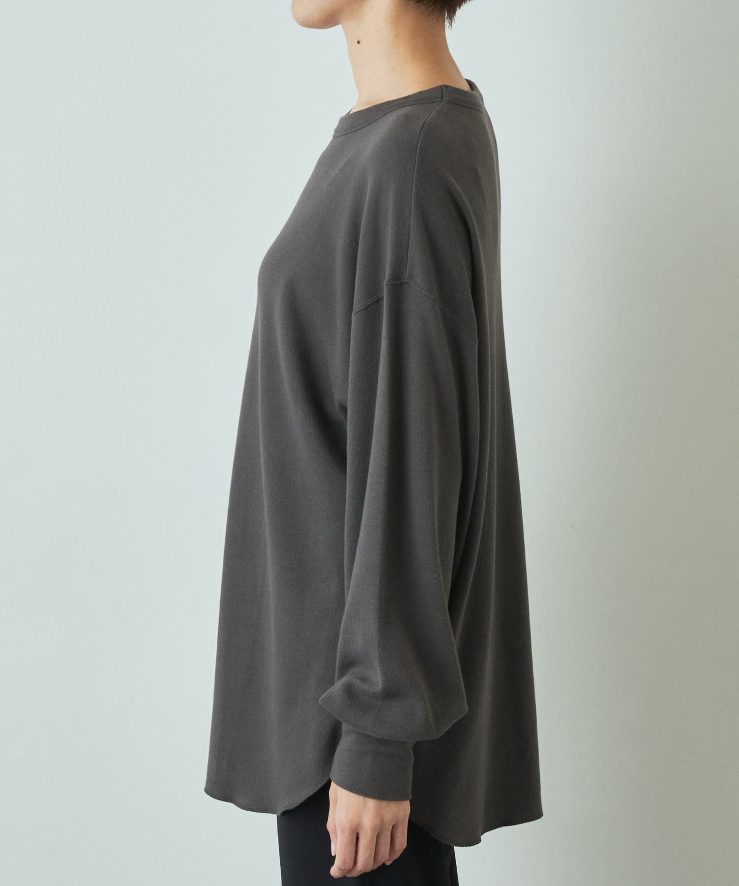 肩をたっぷりとドロップさせたゆとりのあるオーバーサイズがラフな雰囲気ながら、ヘムはラウンドにすることで女性らしいシルエットに仕上げました。