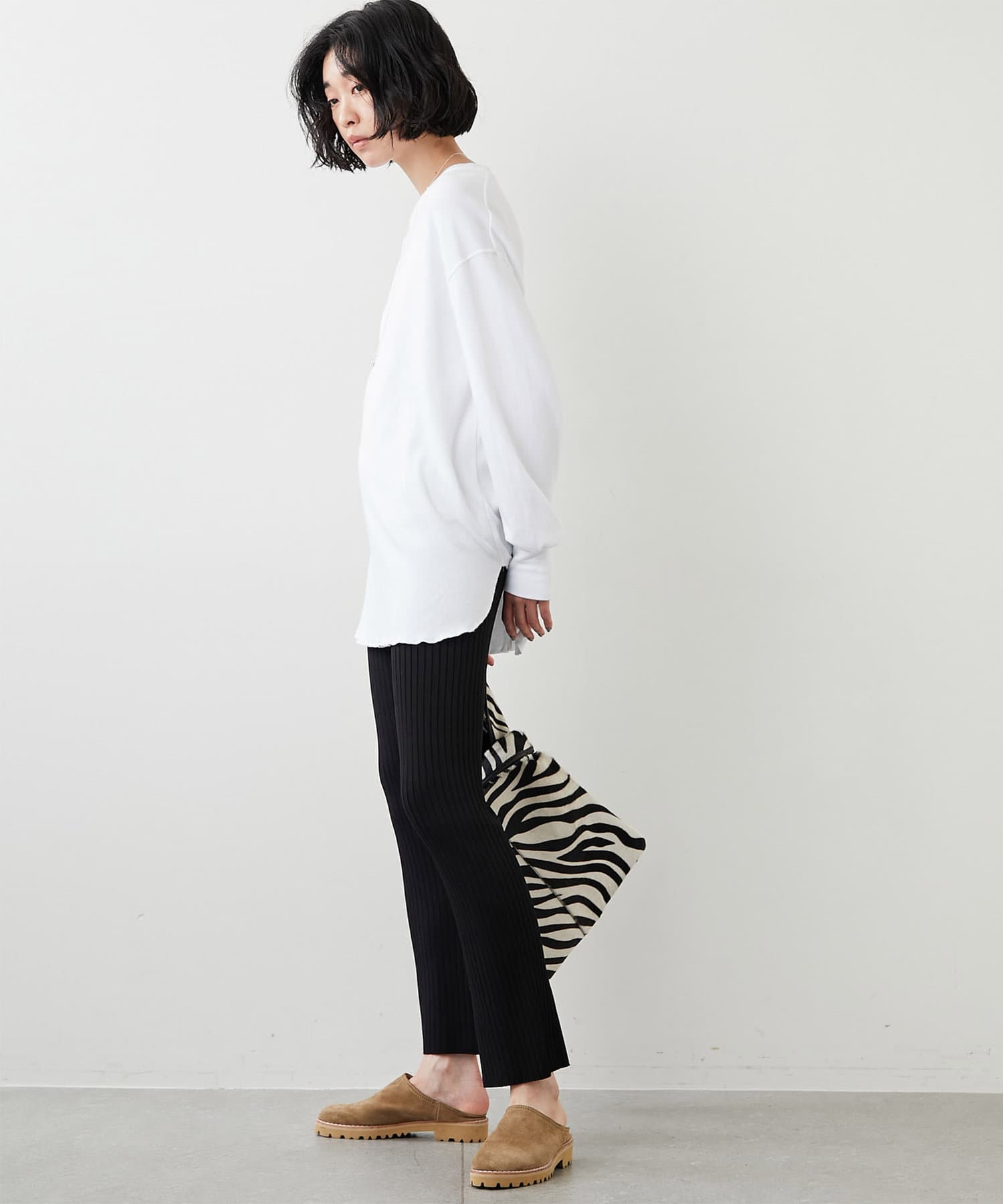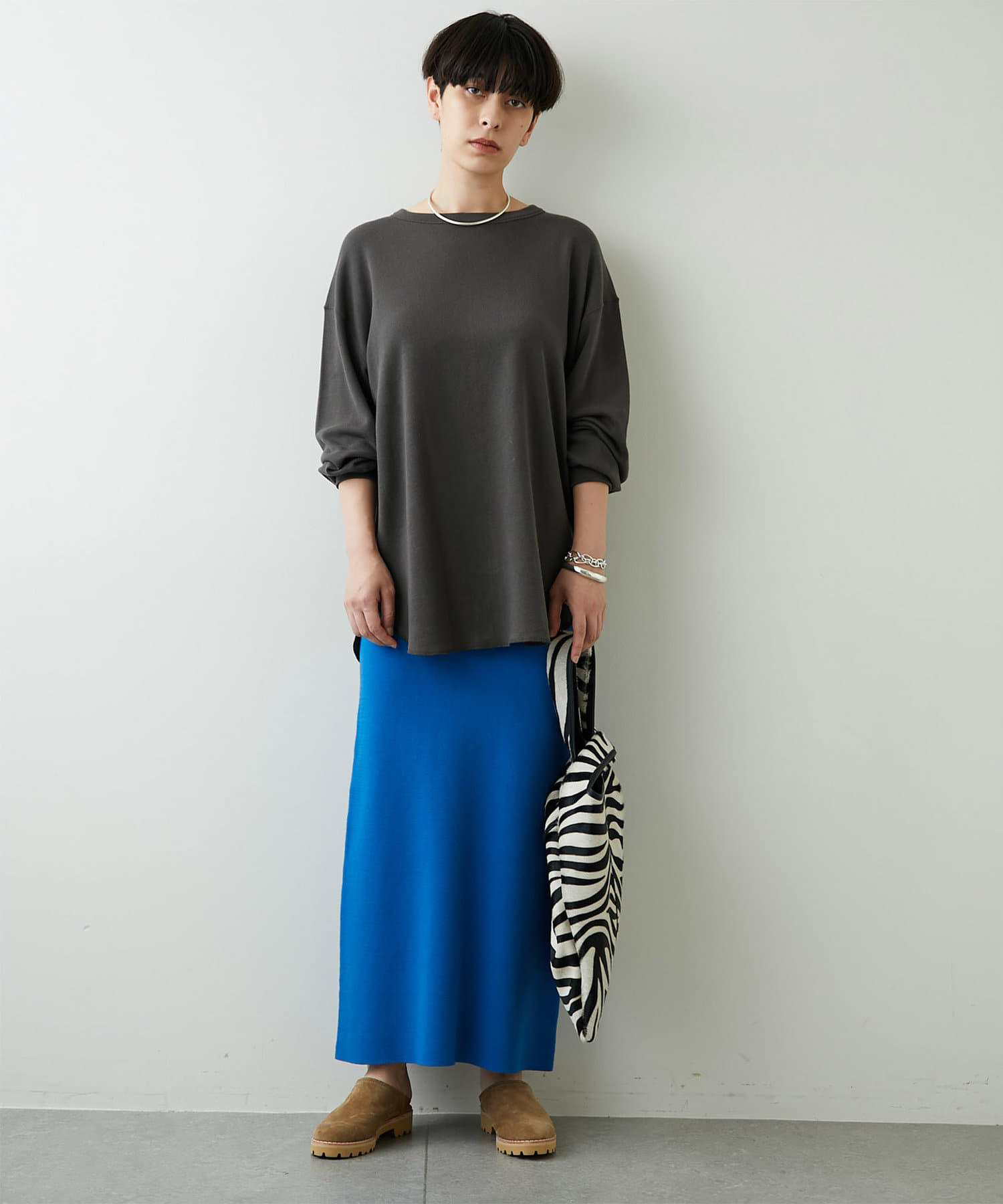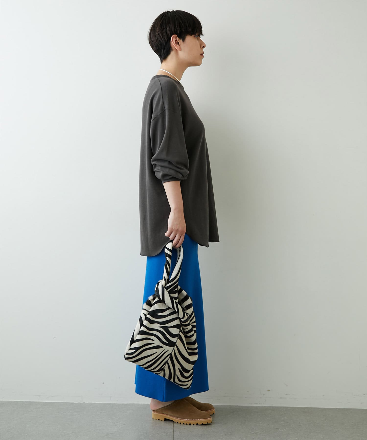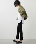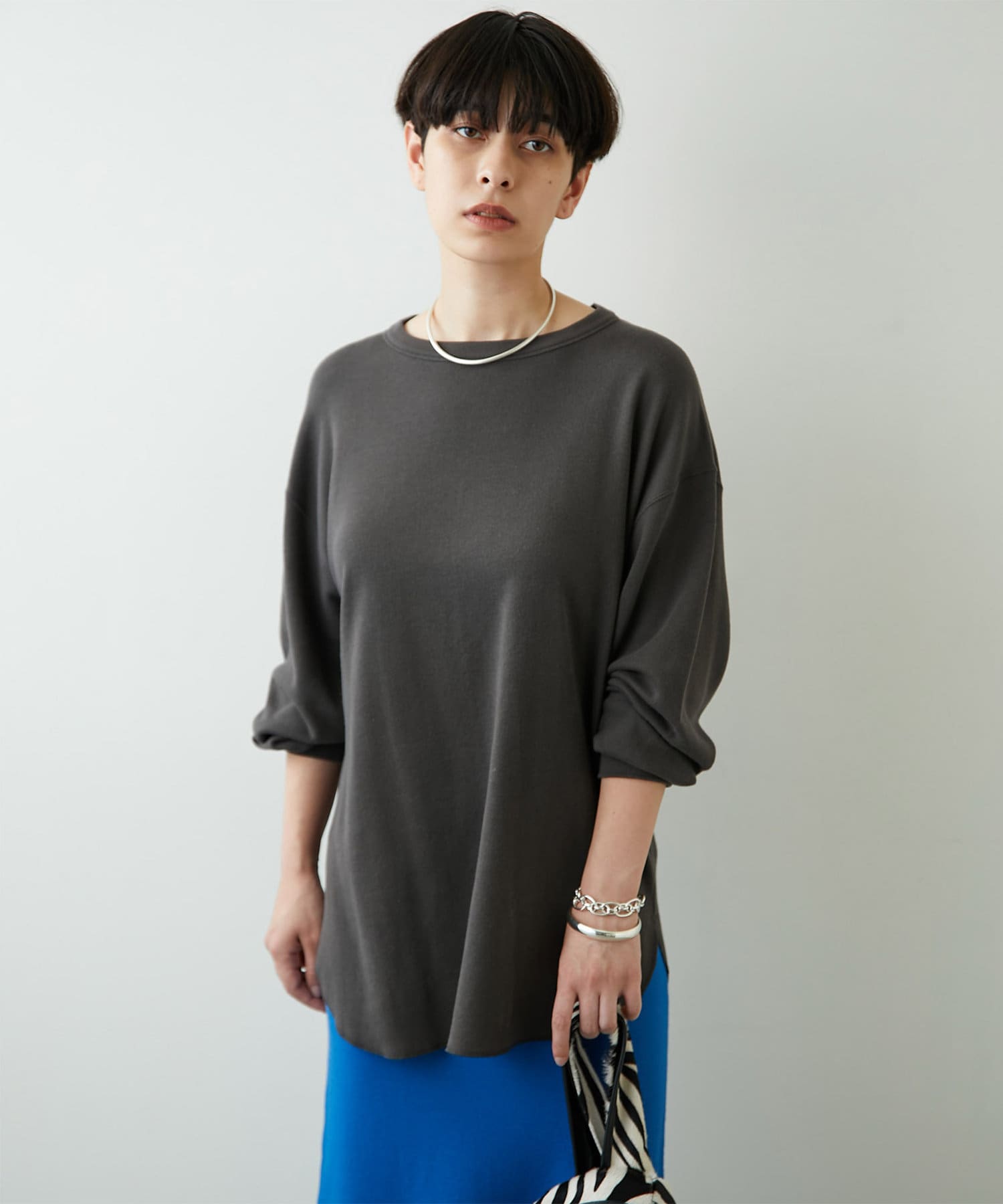 肩をたっぷりとドロップさせたゆとりのあるオーバーサイズがラフな雰囲気ながら、ヘムはラウンドにすることで女性らしいシルエットに仕上げました。