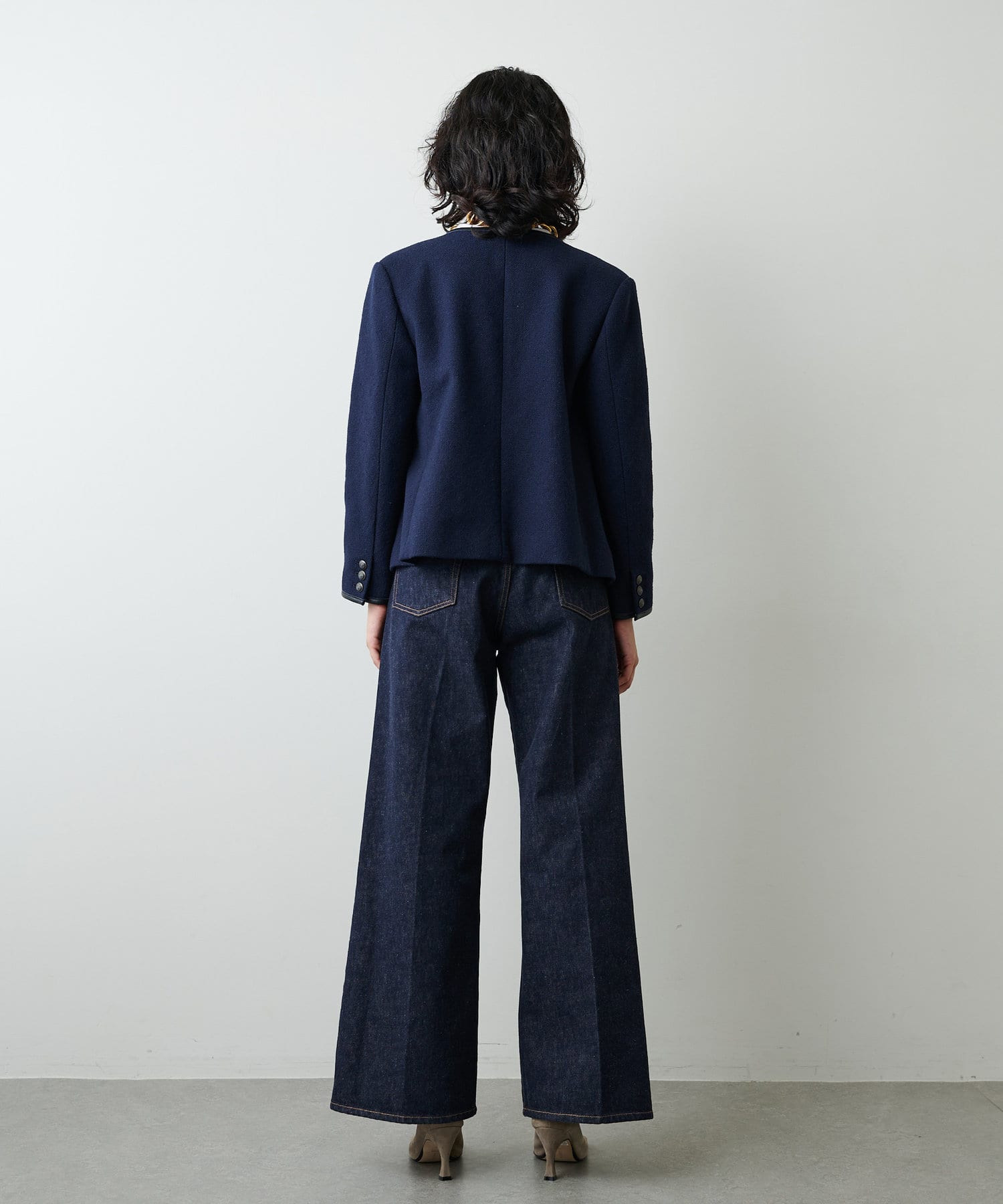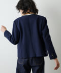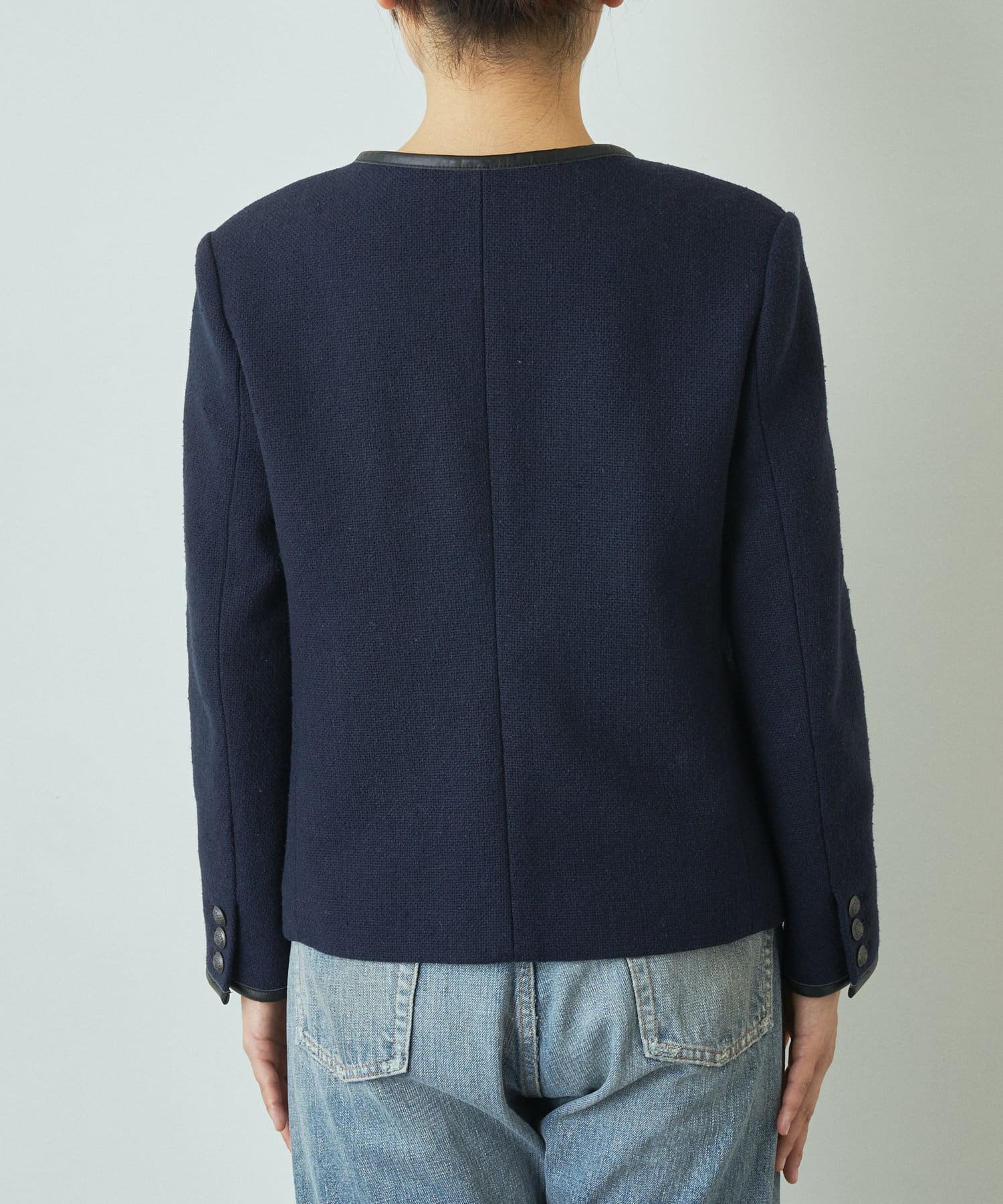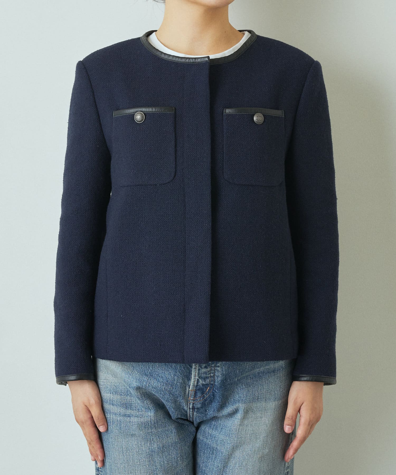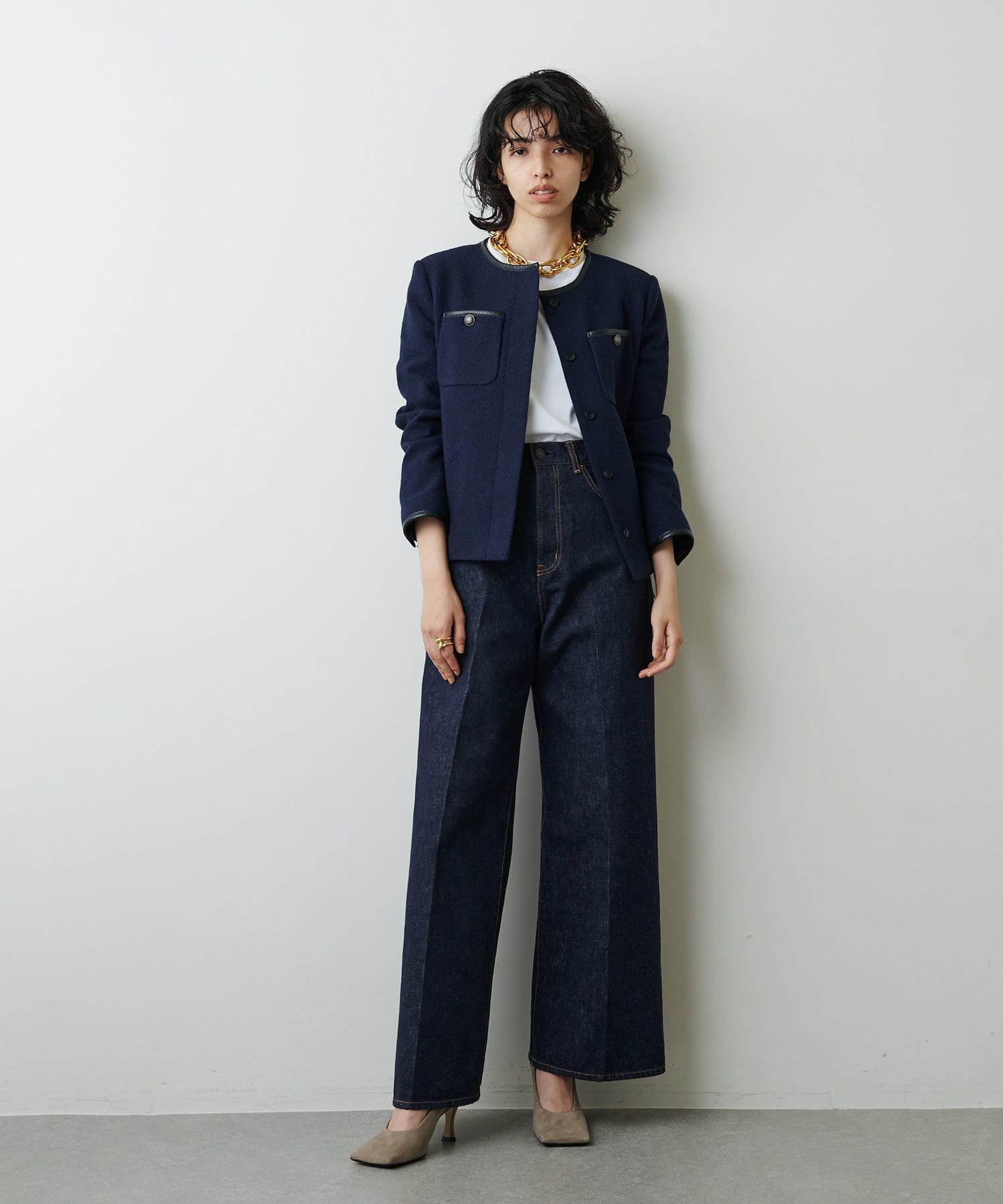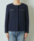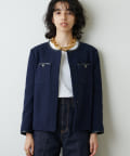 コンパクトなサイズ感やノーカラーのデザインがクラシカルなムードのジャケットは、デニムなどのカジュアルなボトムと合わせて抜け感を出すスタイリングがおすすめです。
