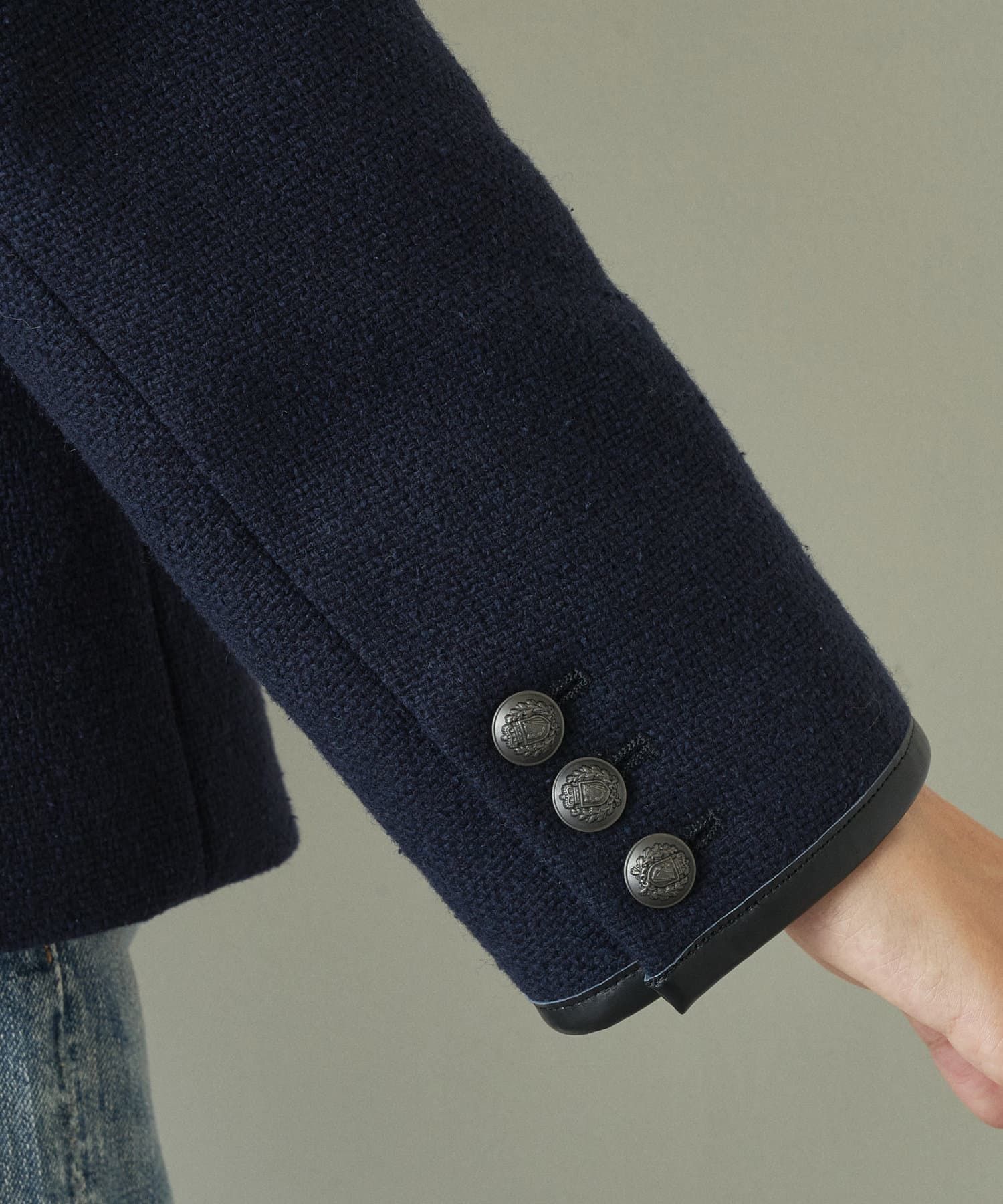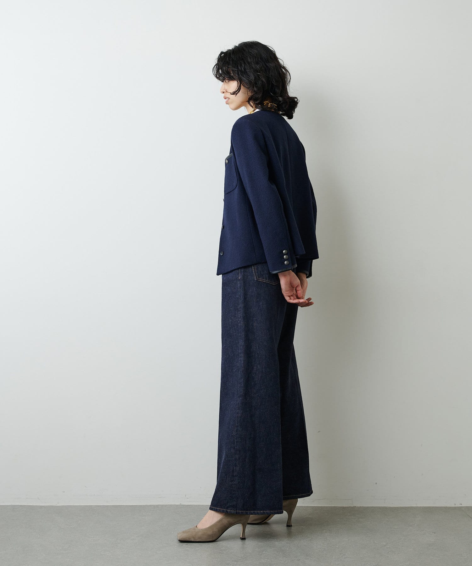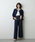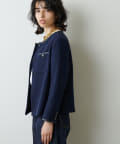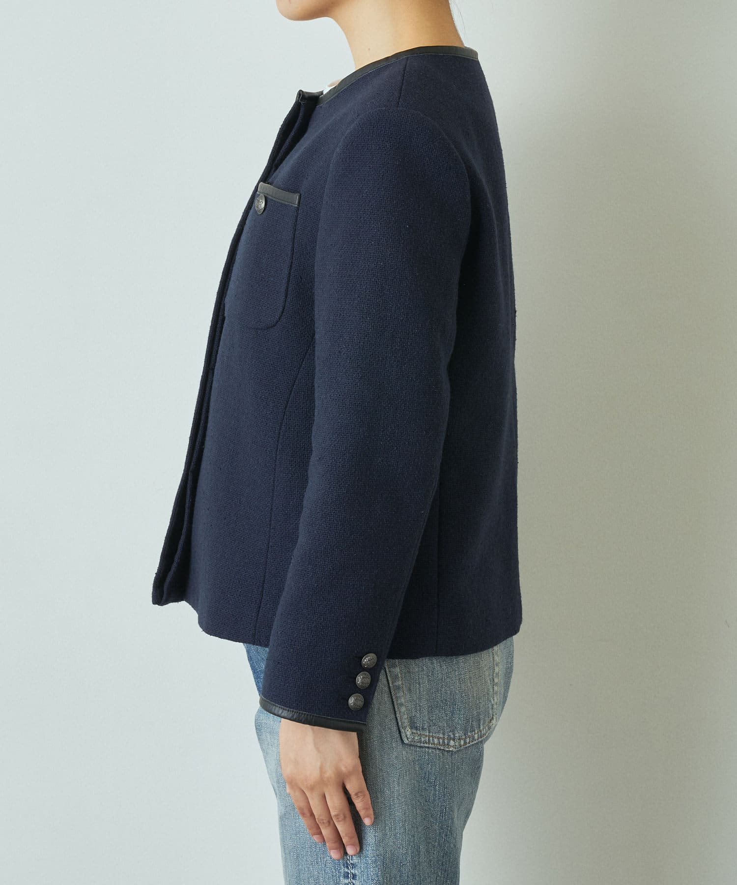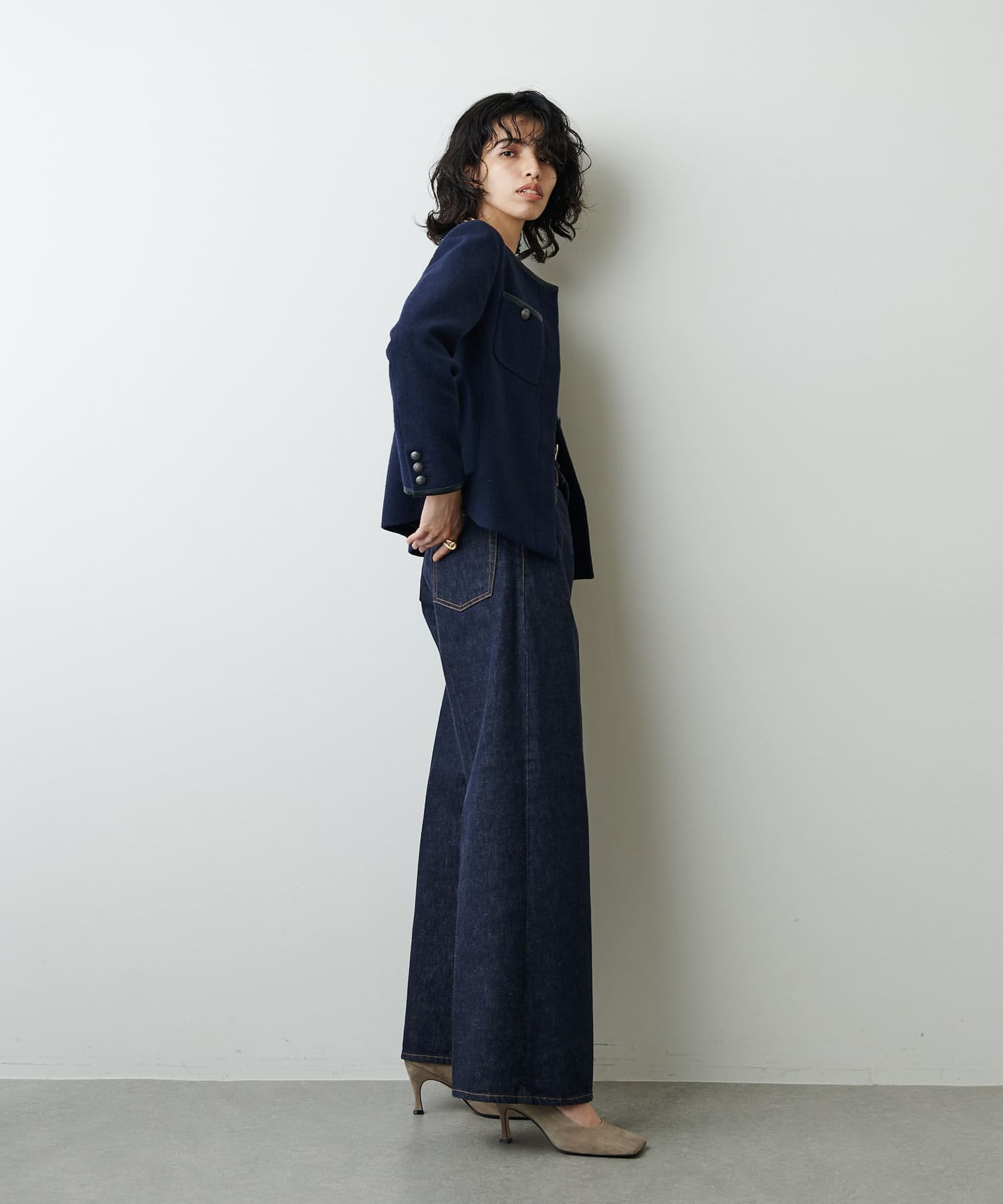 コンパクトなサイズ感やノーカラーのデザインがクラシカルなムードのジャケットは、デニムなどのカジュアルなボトムと合わせて抜け感を出すスタイリングがおすすめです。