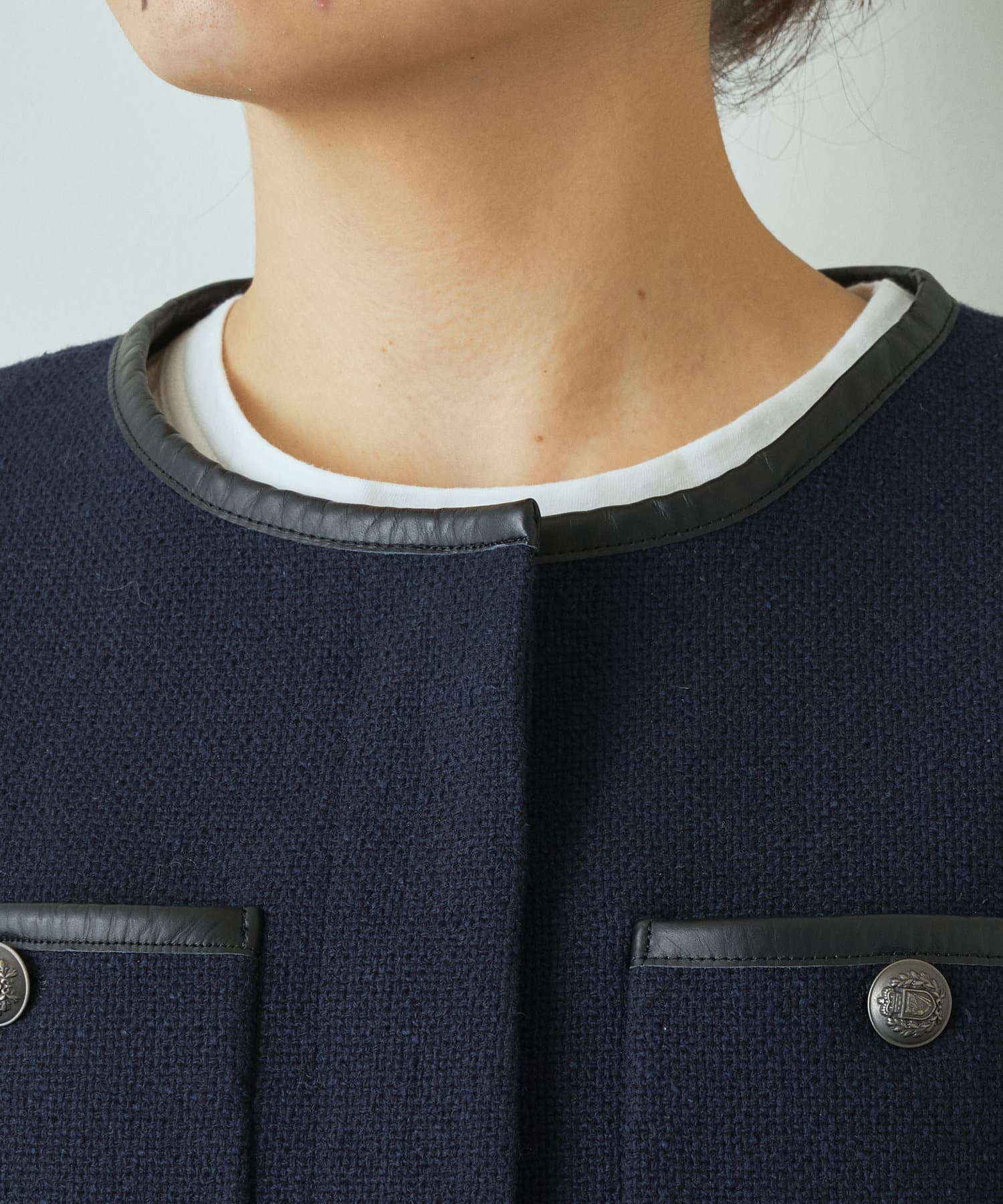 パイピングにはレザーをあしらい、パーツをブラックにまとめることで、ツイードの上品さにクールな表情がプラスされ、洗練された大人の雰囲気を感じさせます。
