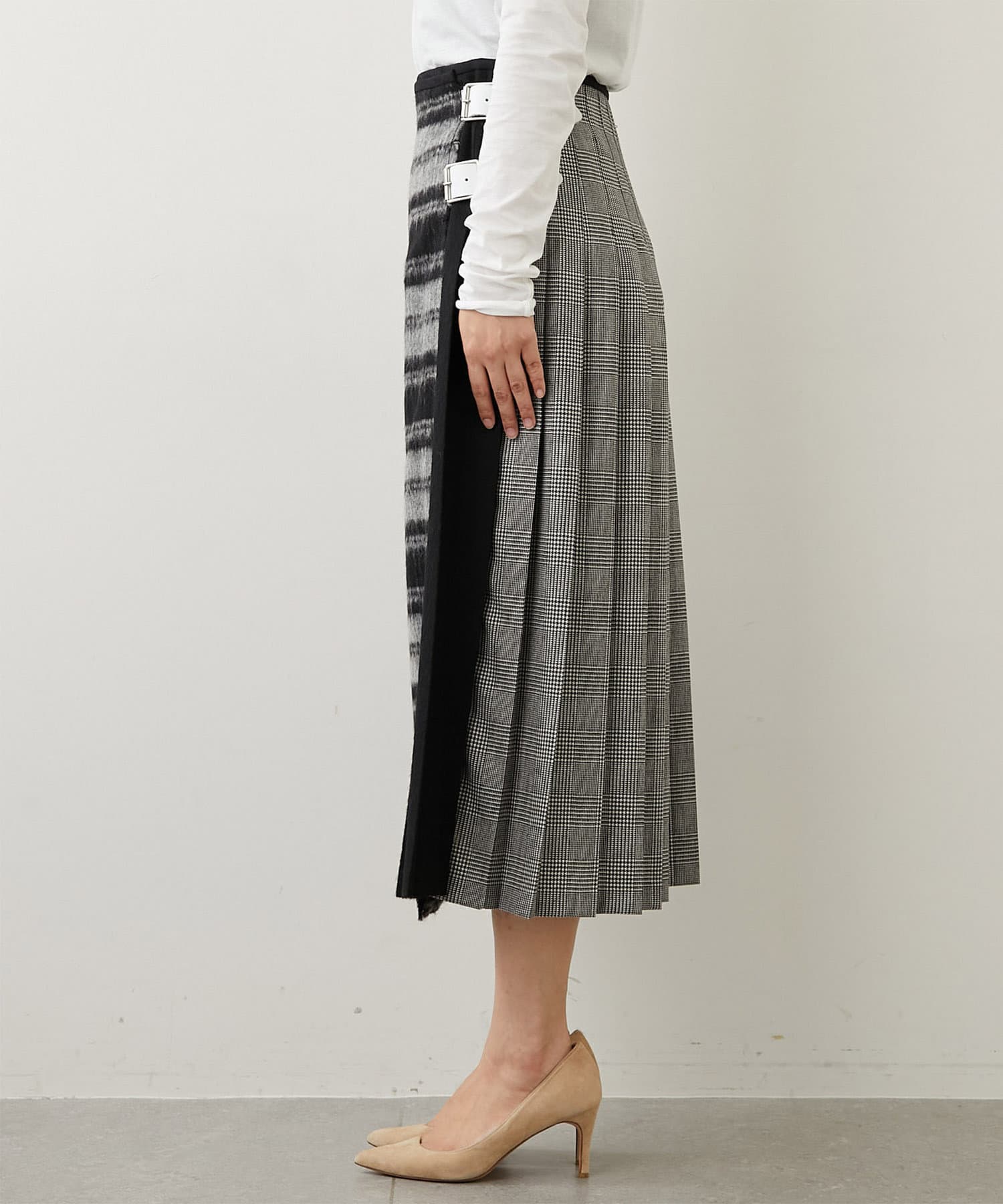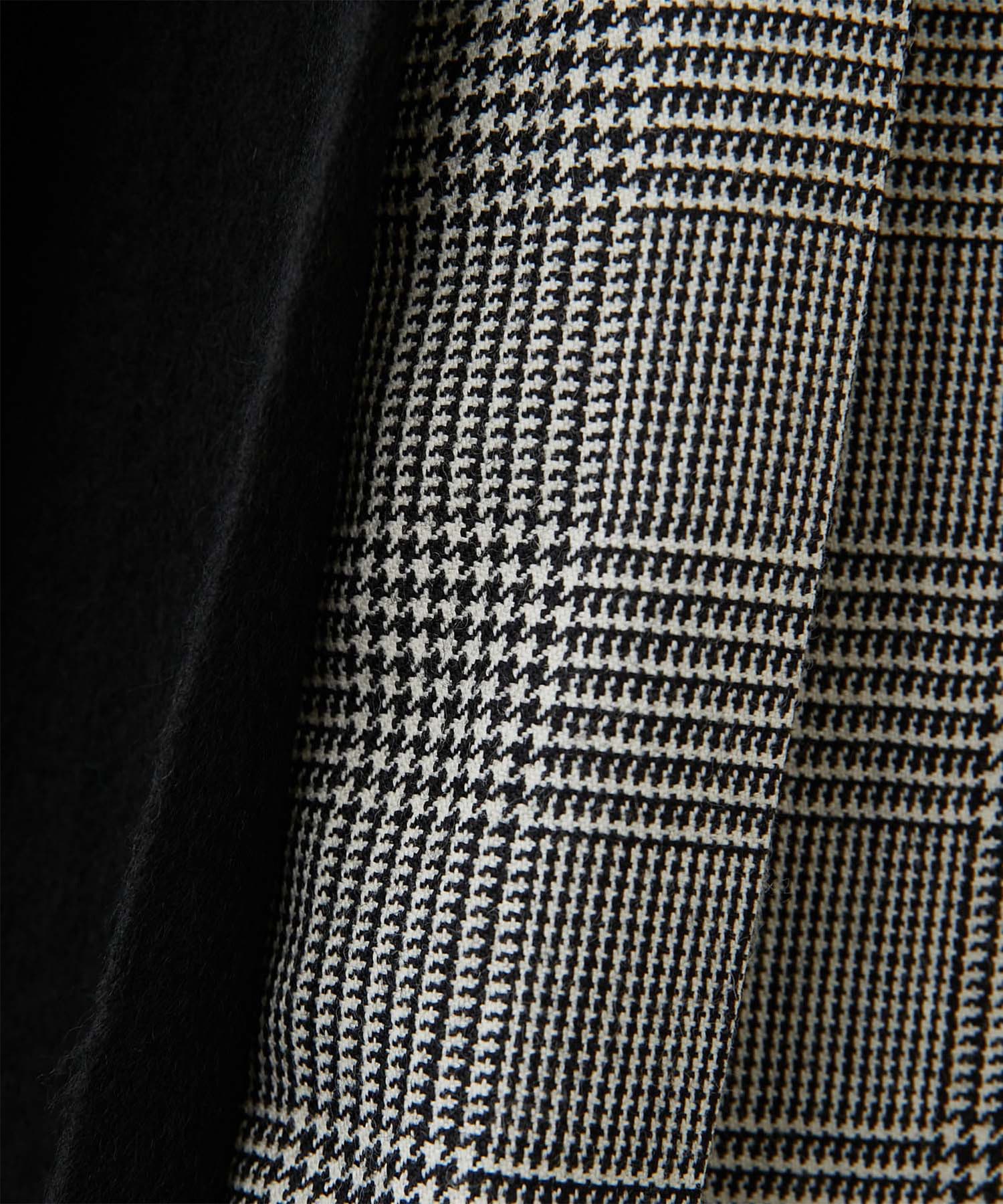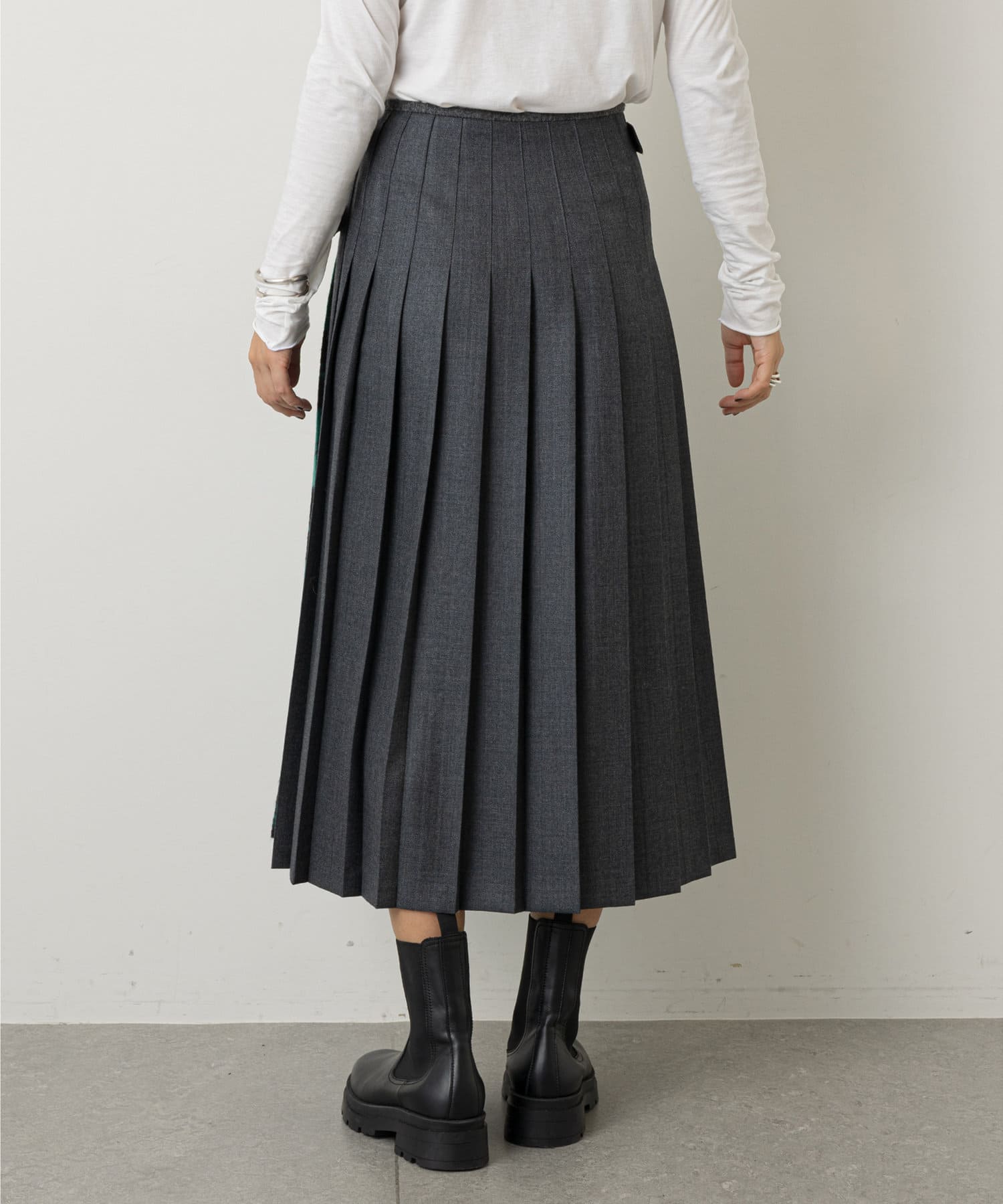 素材感も柄も異なる生地を使用し、フロントのラップ風のデザインや、サイドからバックにかけてのプリーツデザインなど前後のディテールにも変化をつけ、どこから見ても着映えるデザイン。