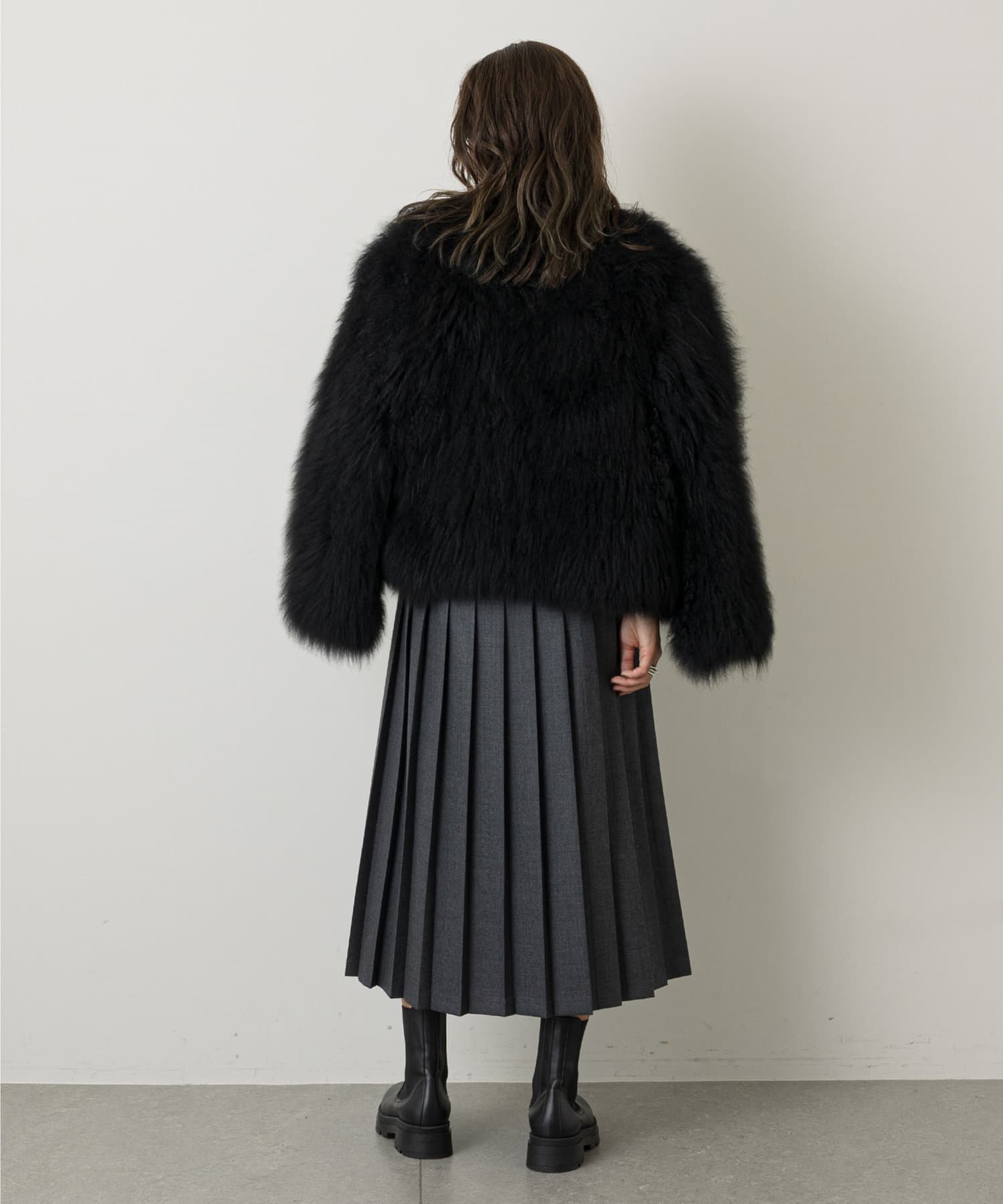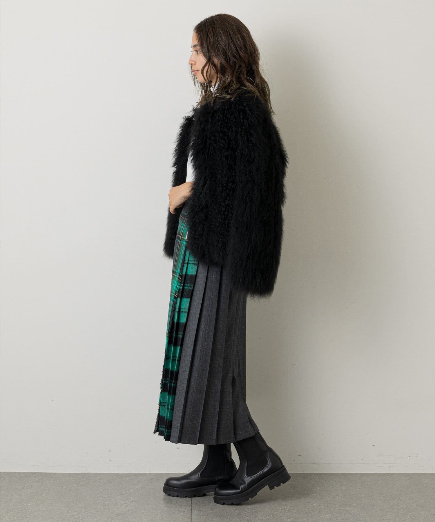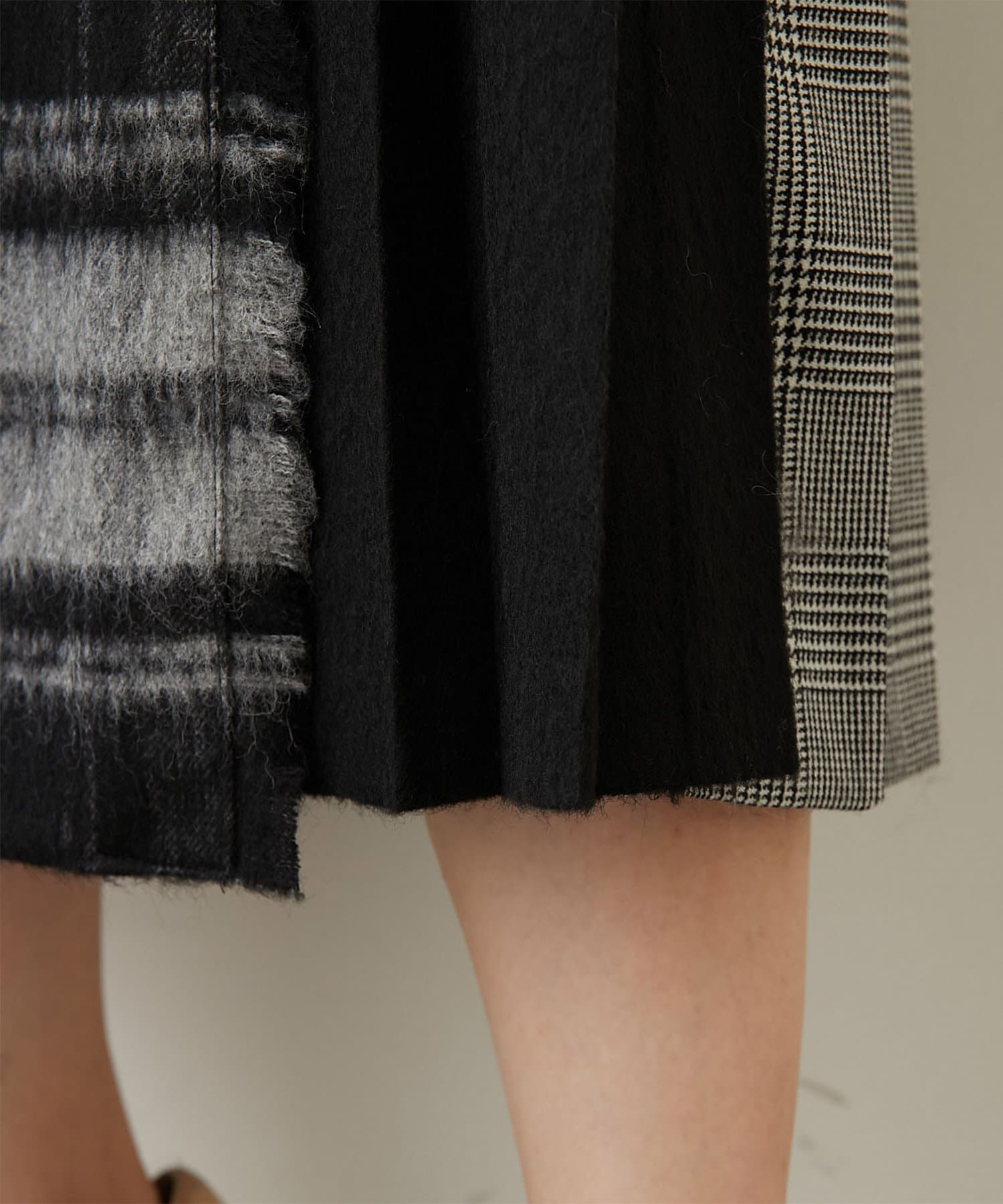 素材感も柄も異なる生地を使用し、フロントのラップ風のデザインや、サイドからバックにかけてのプリーツデザインなど前後のディテールにも変化をつけ、どこから見ても着映えるデザイン。