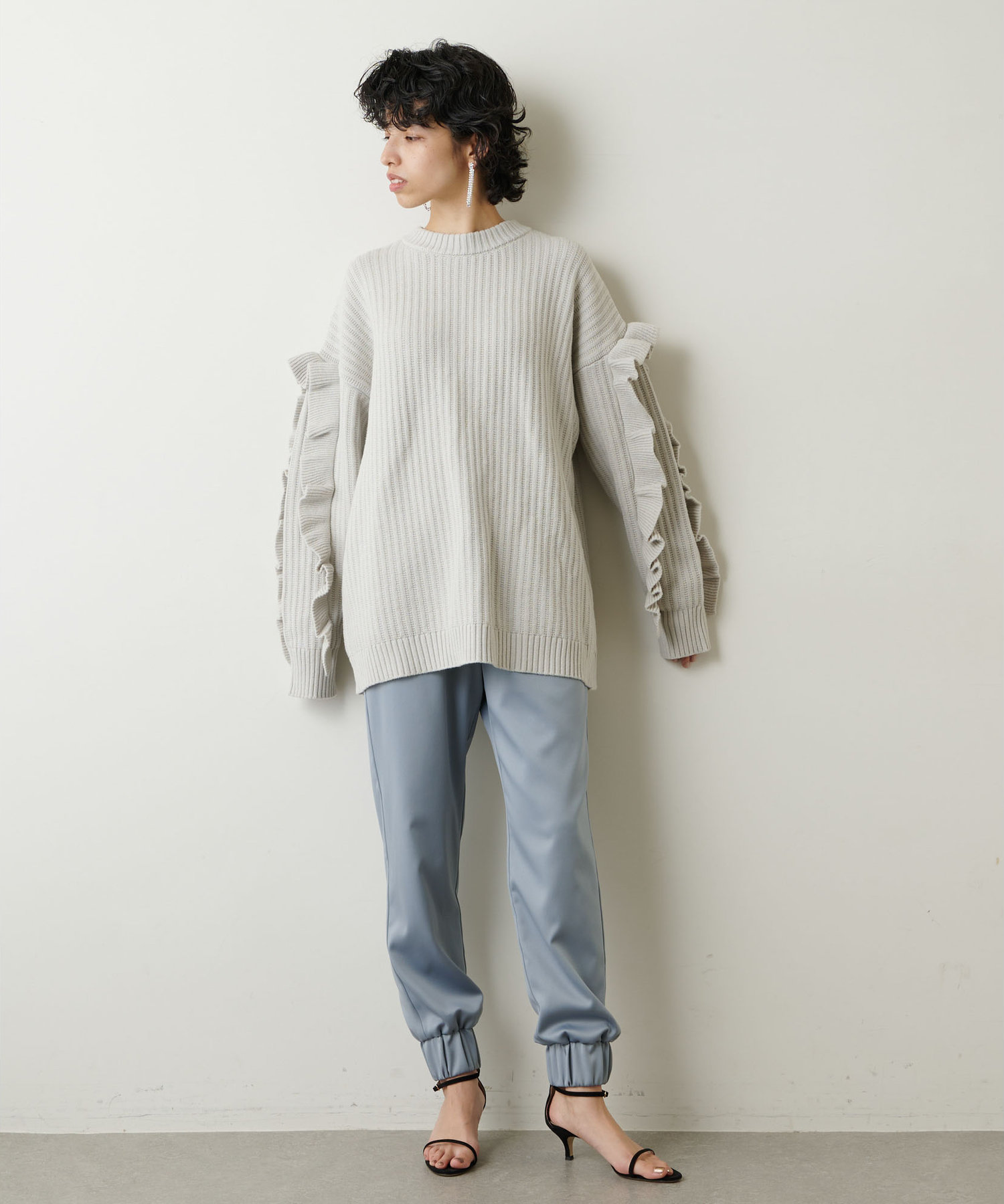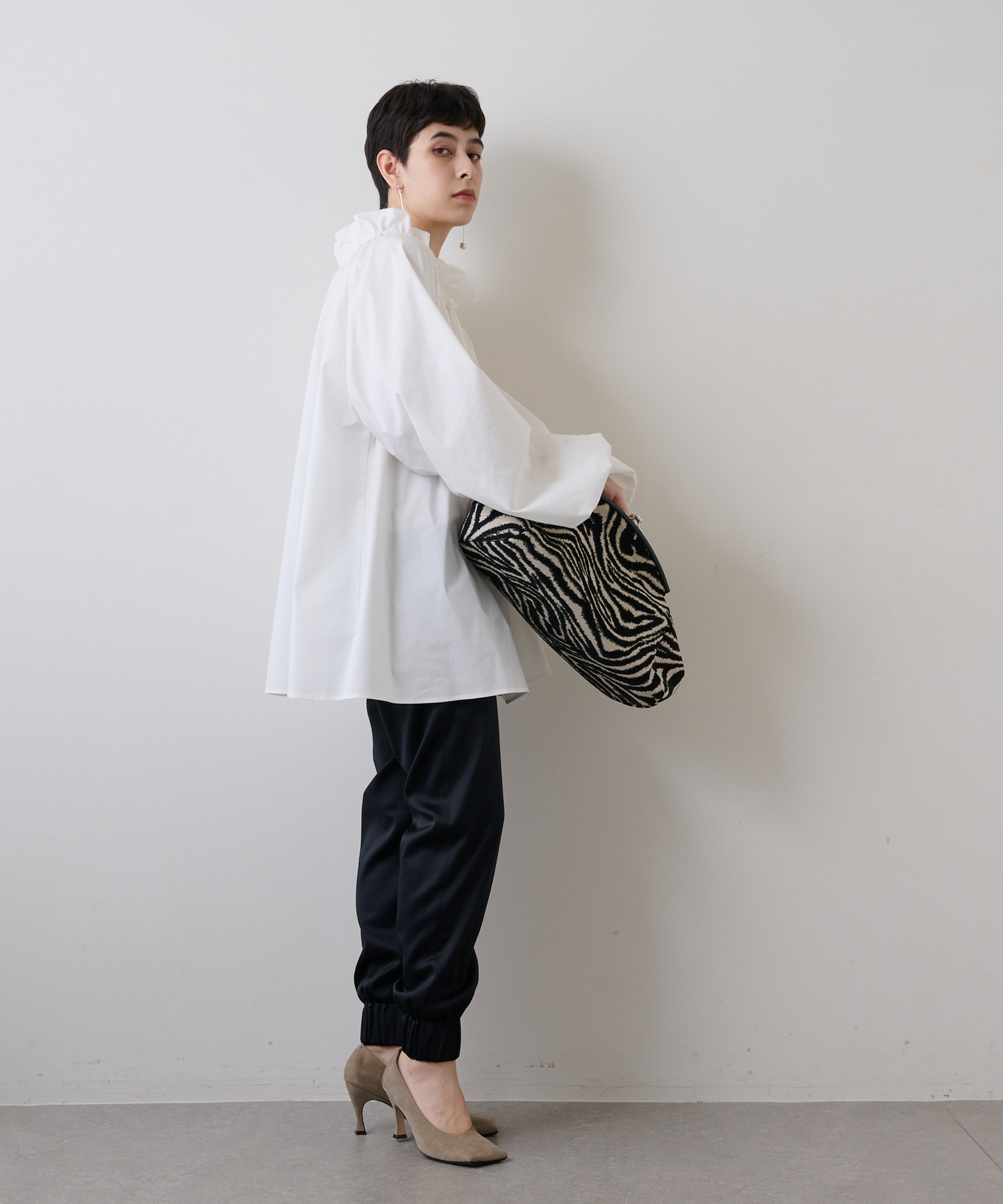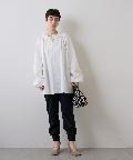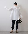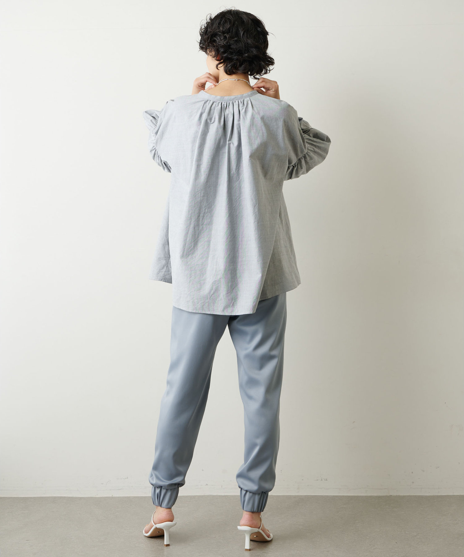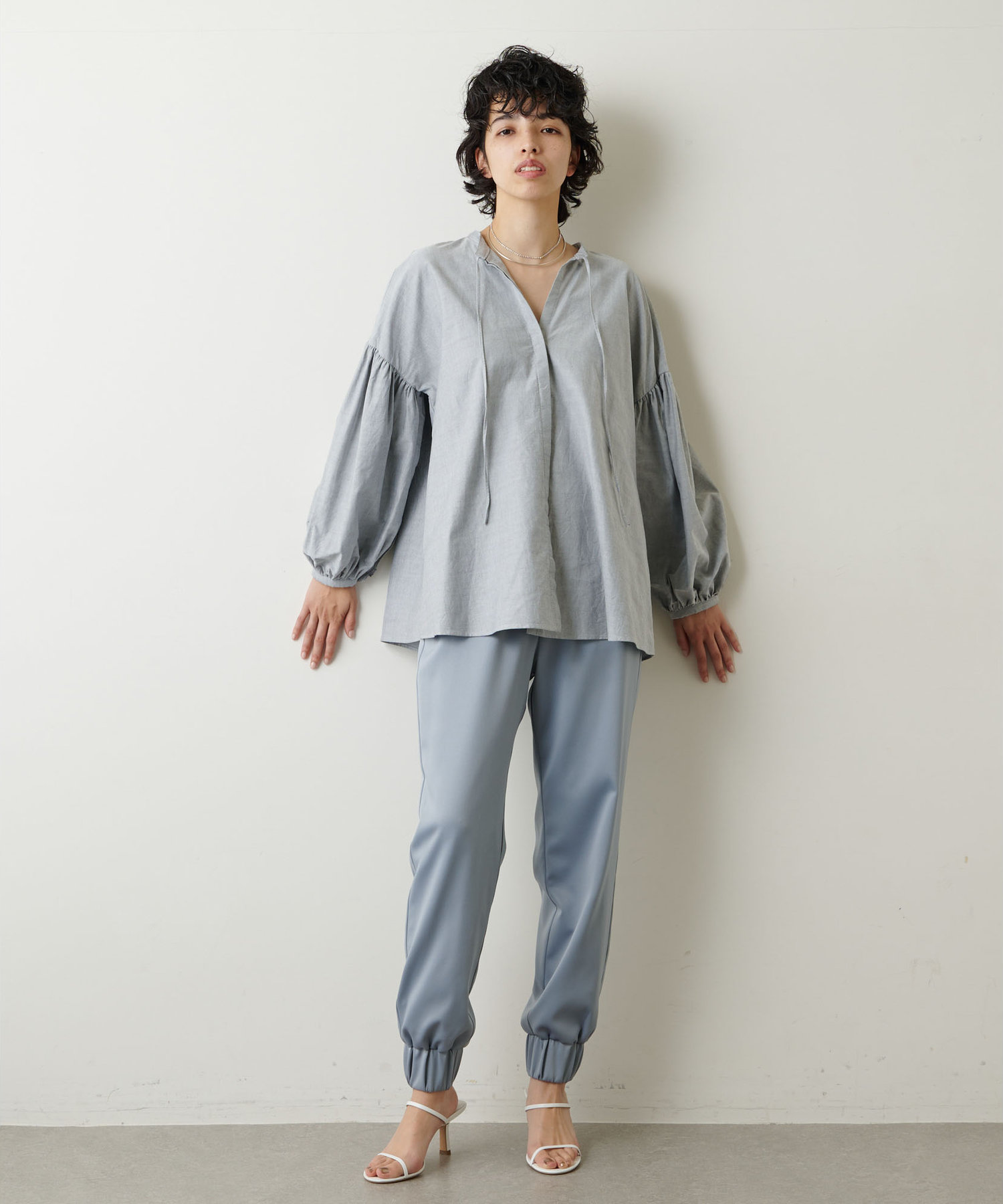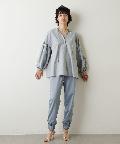 ゆるく見えすぎないシルエットが程よいリラクシー感をプラスしつつ、裾のシャーリングゴムを太めに入れることですっきりと女性らしい表情に。