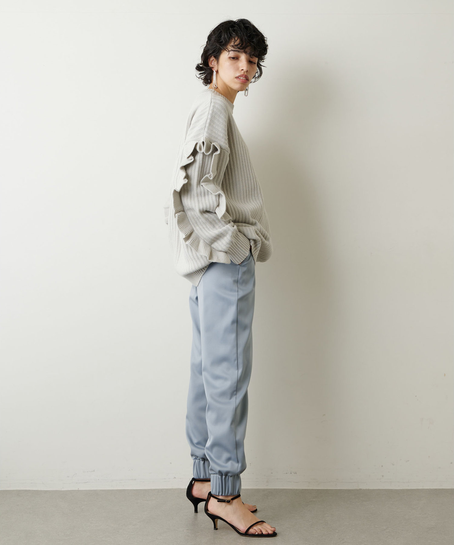 控えめな光沢感が上品なサテン生地のジョガーパンツ。