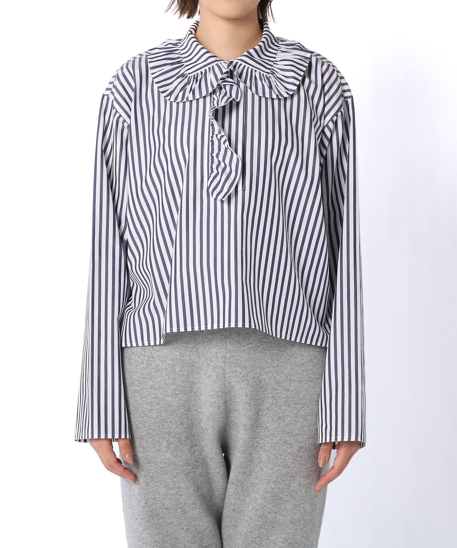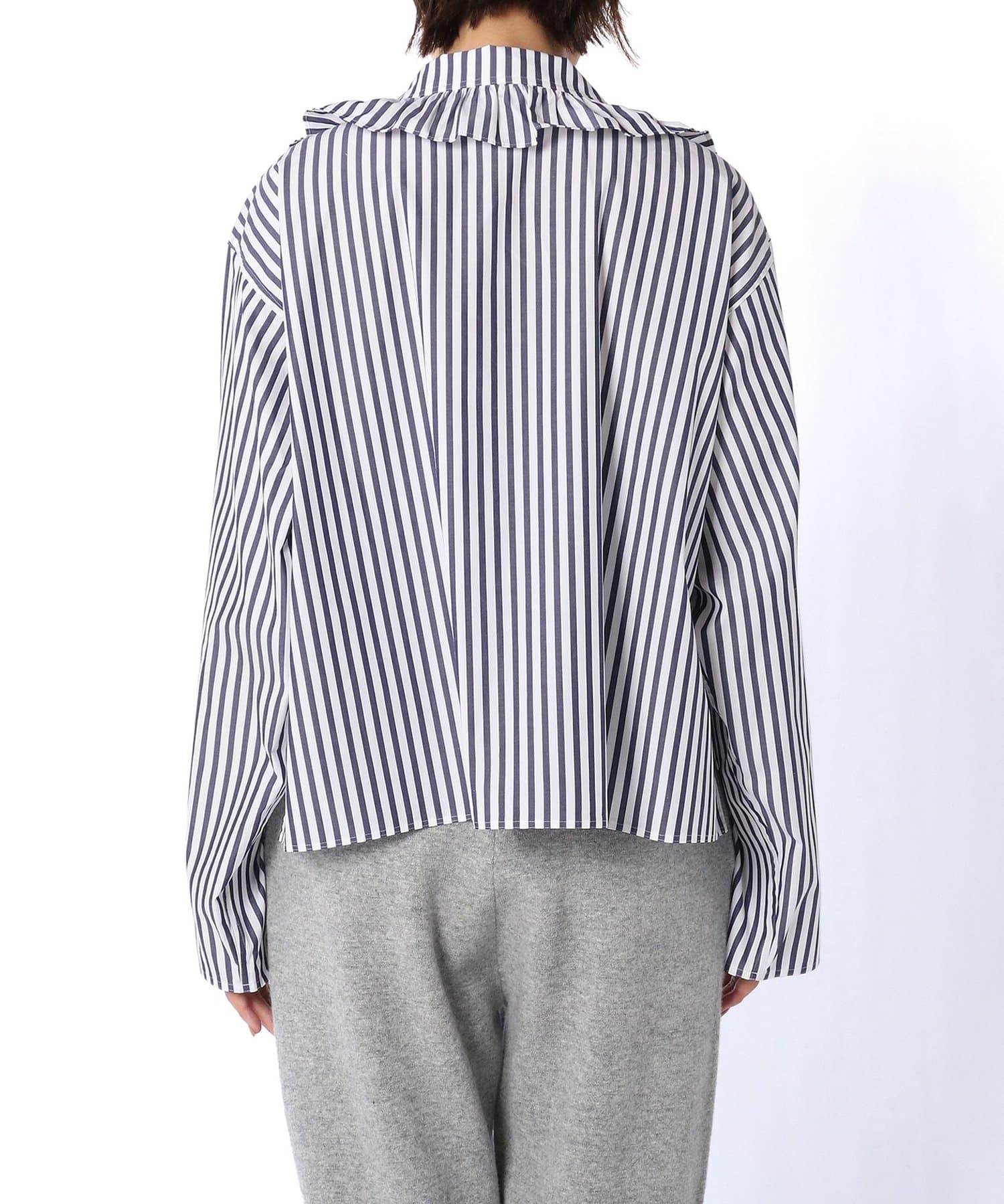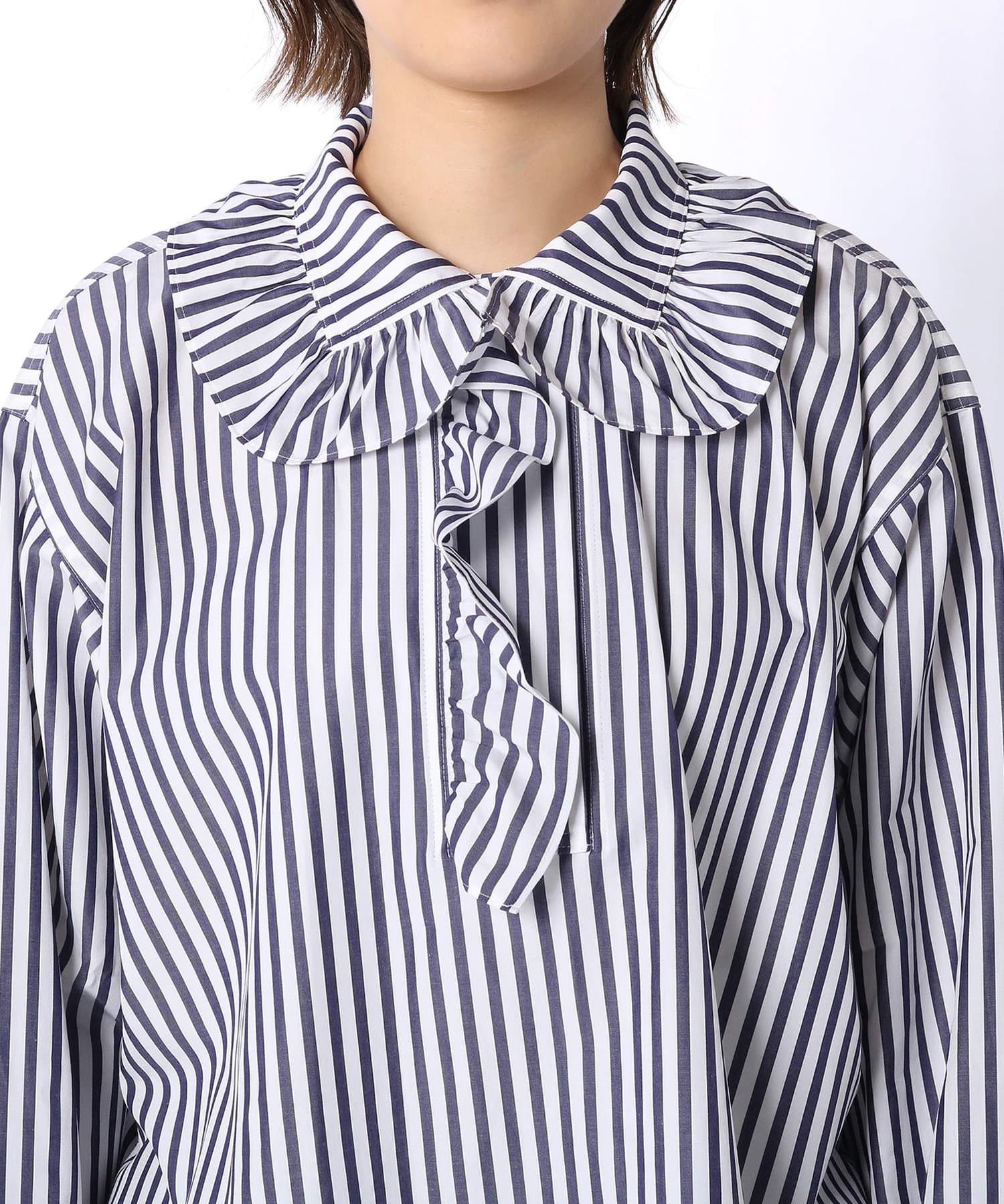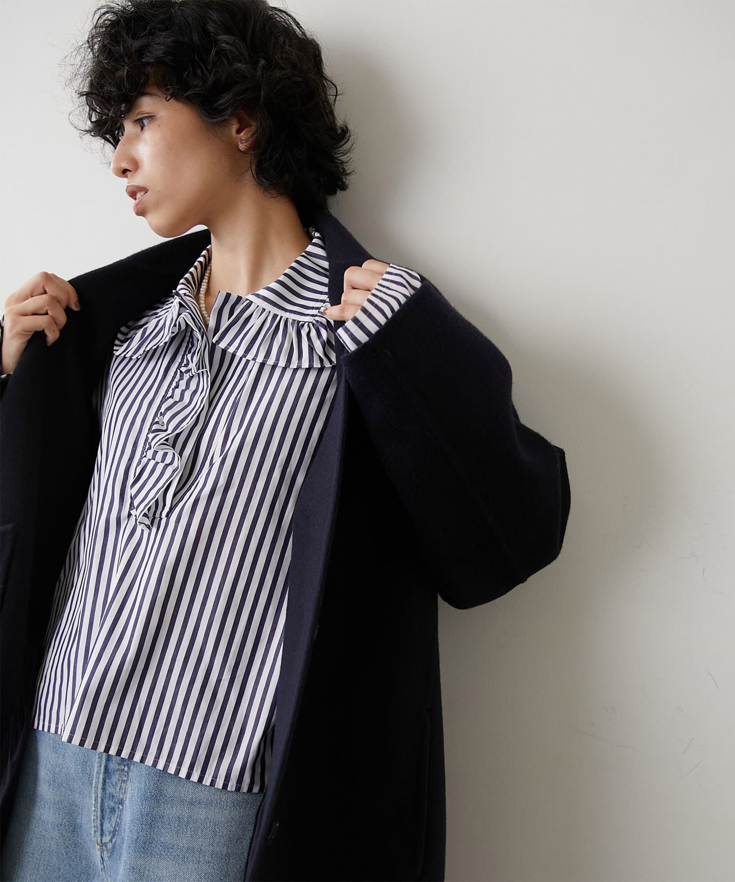 ネイビーカラーのストライプとハリ感のあるシャツ地が、フリルディテールの甘さを抑え大人のバランスに。