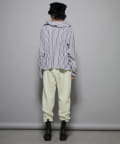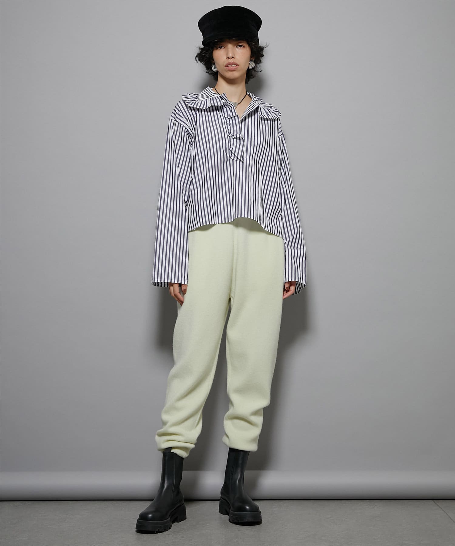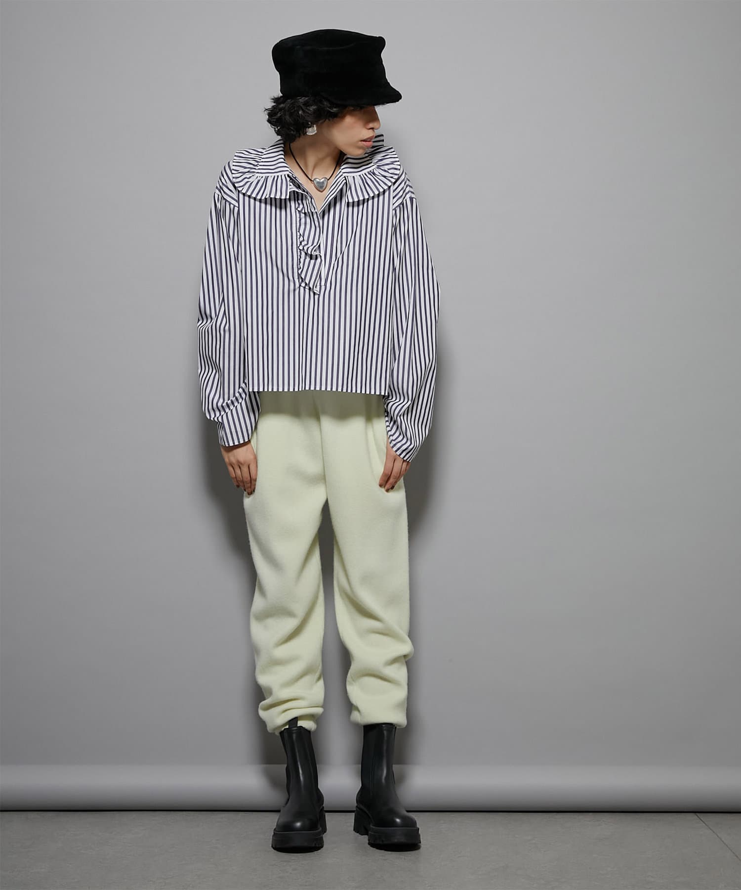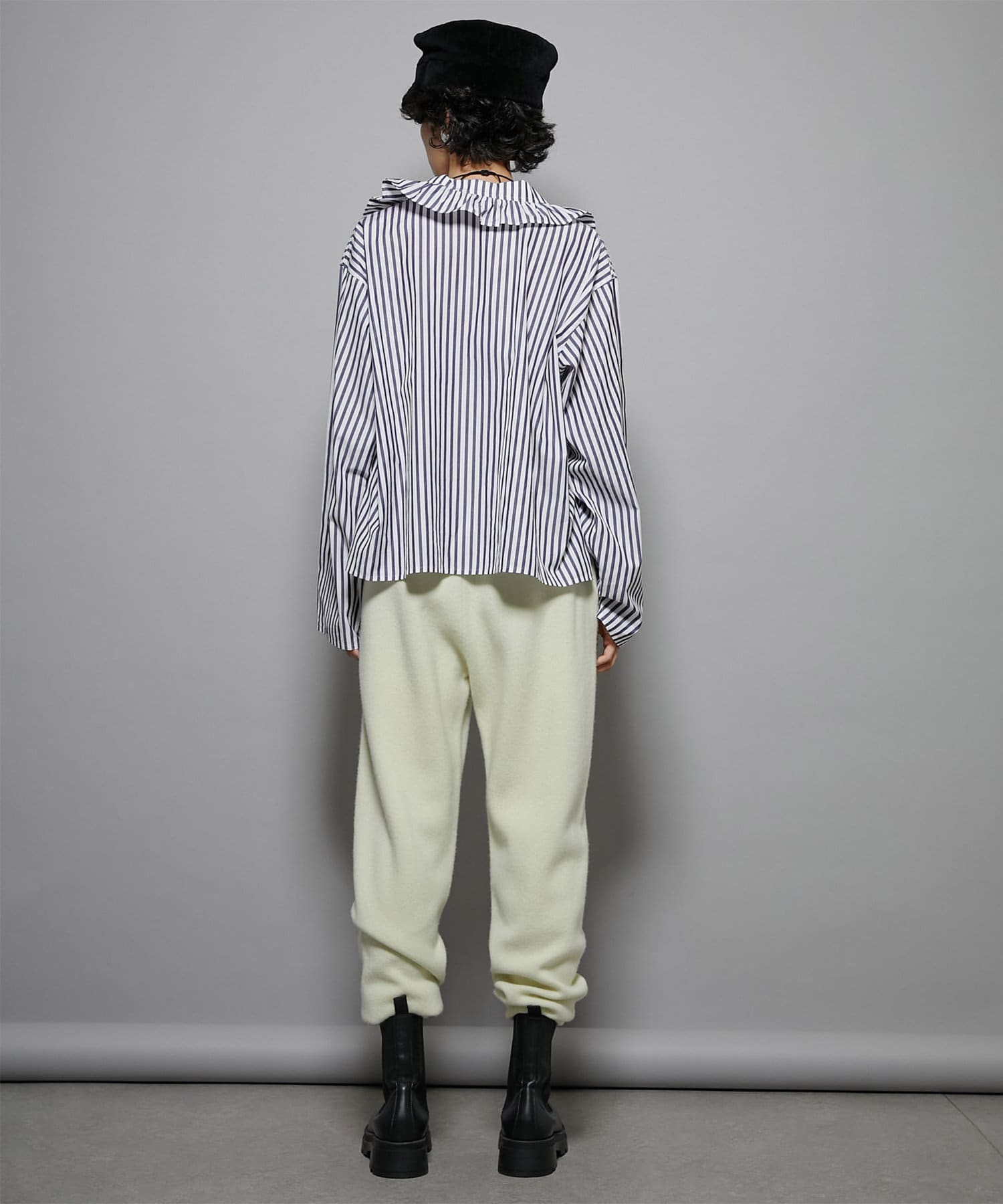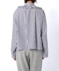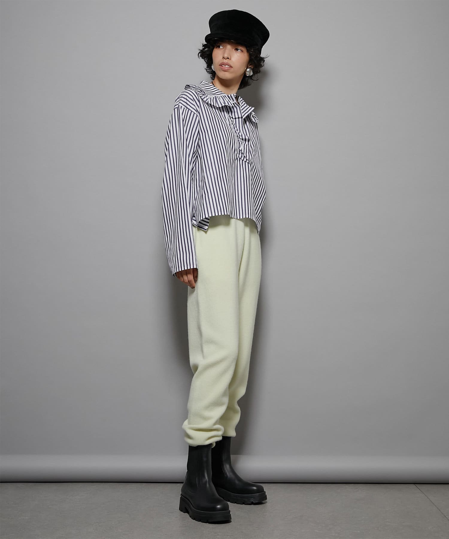 ネイビーカラーのストライプとハリ感のあるシャツ地が、フリルディテールの甘さを抑え大人のバランスに。