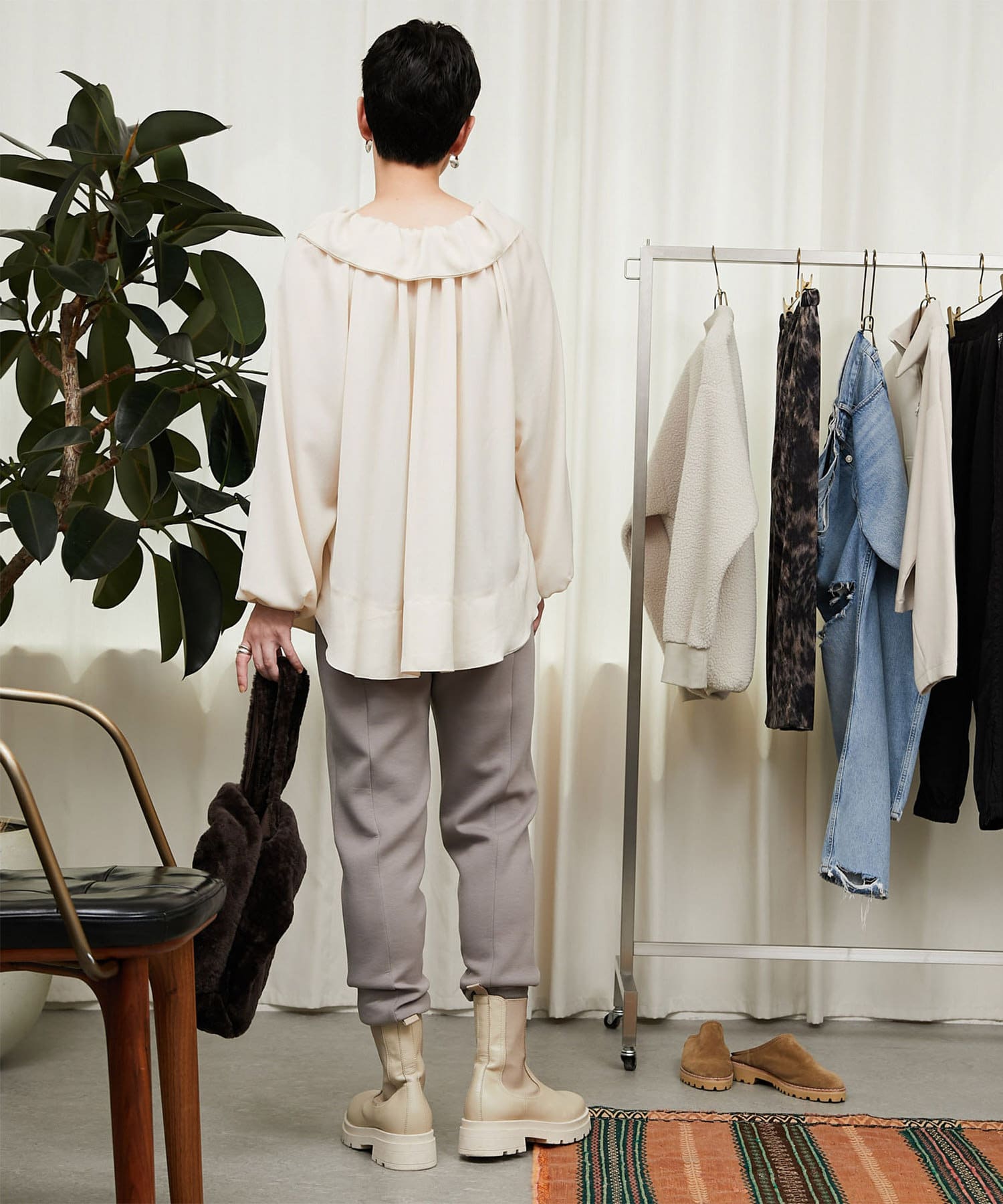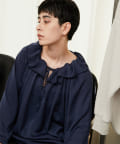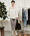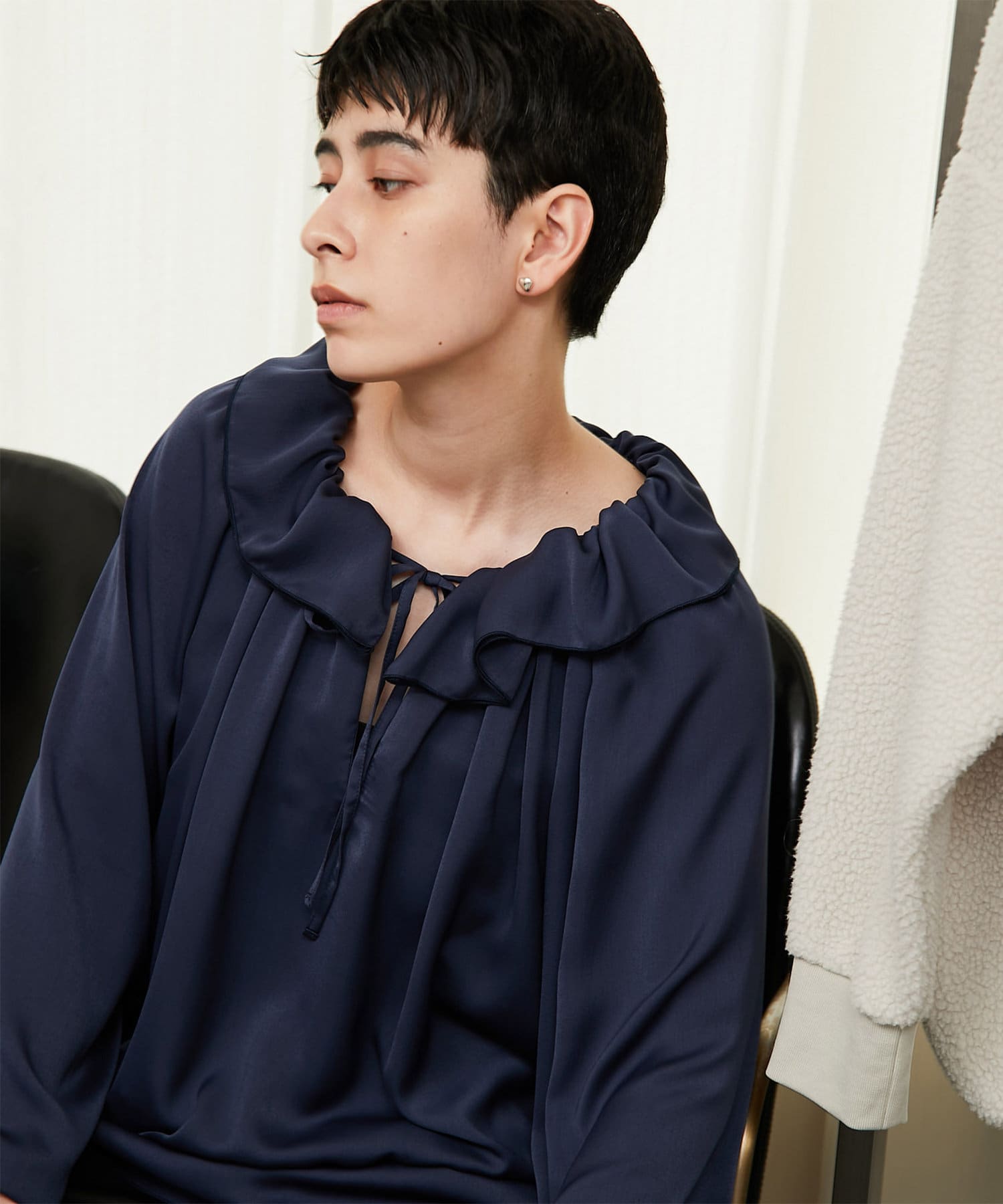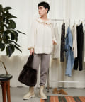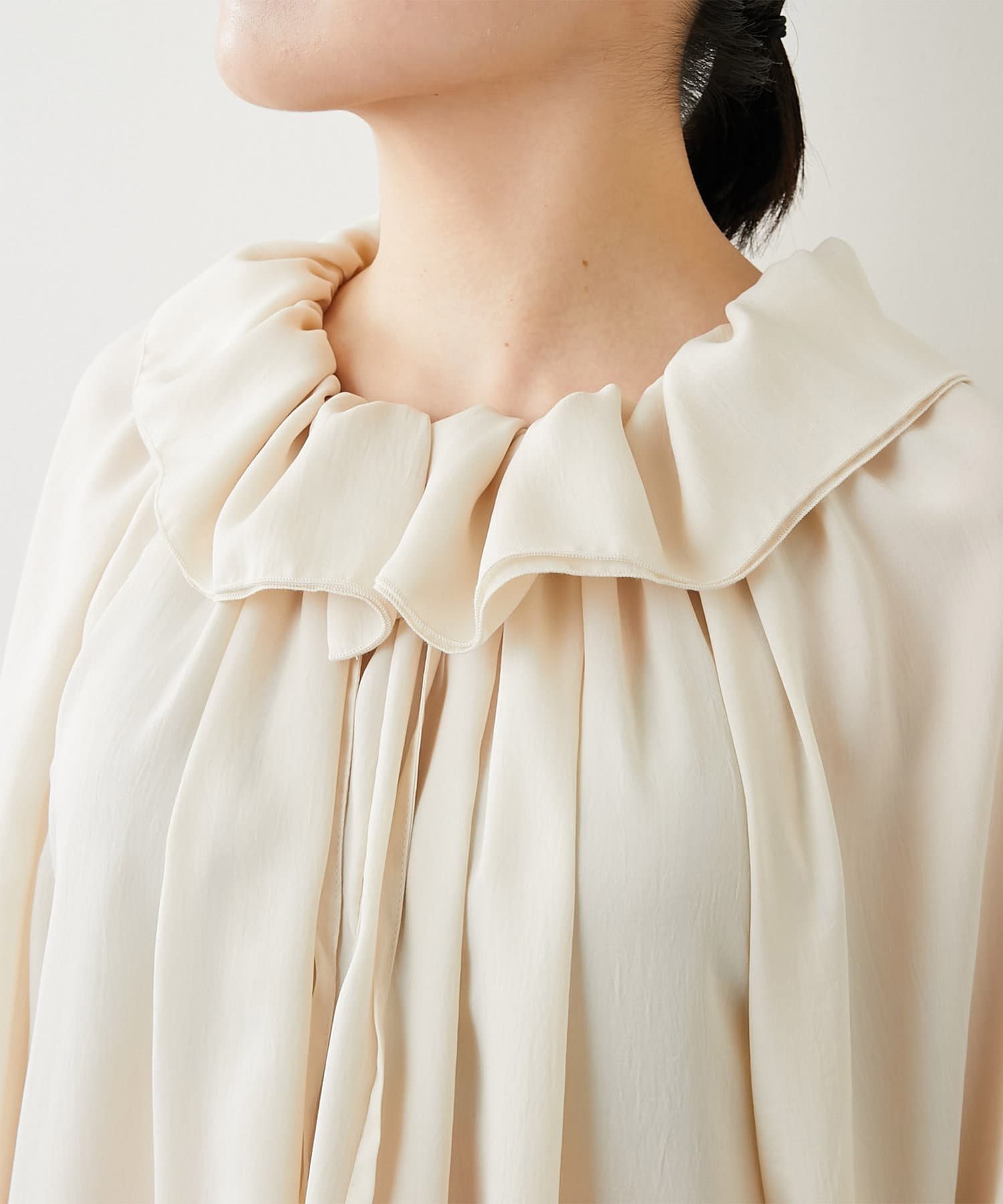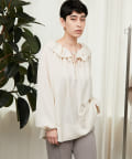 トレンドライクな着こなしを叶えてくれるフリルカラーは、衿ぐりに施されたゴムでシルエットが固定されるので、着崩れることなく首元を華やかに演出してくれます。