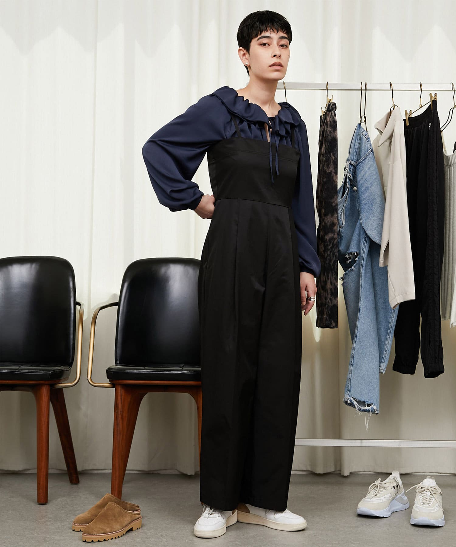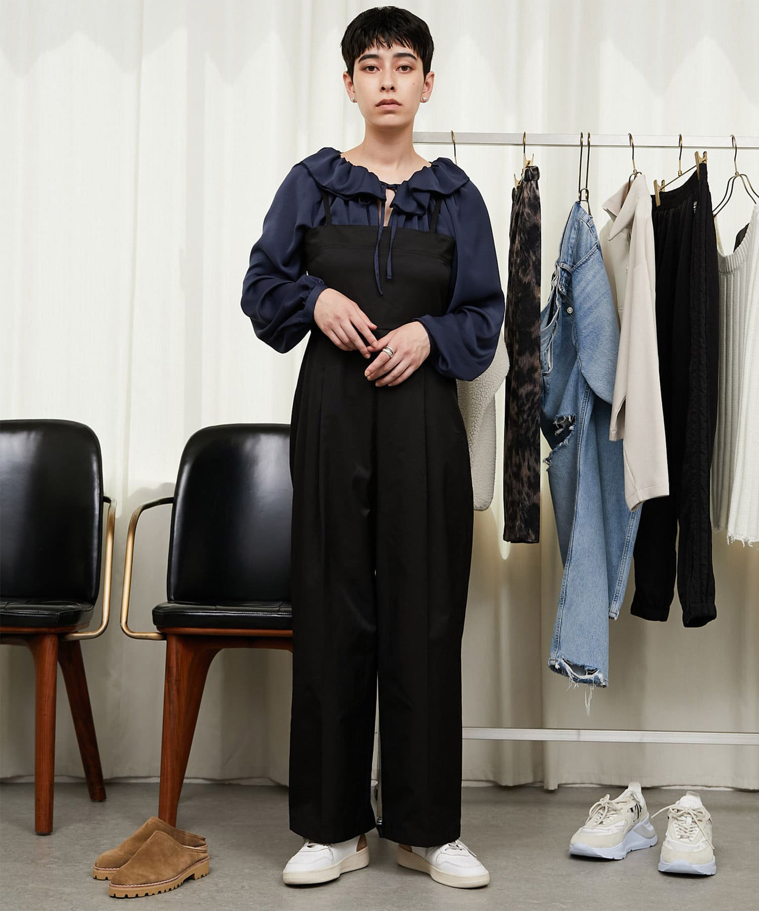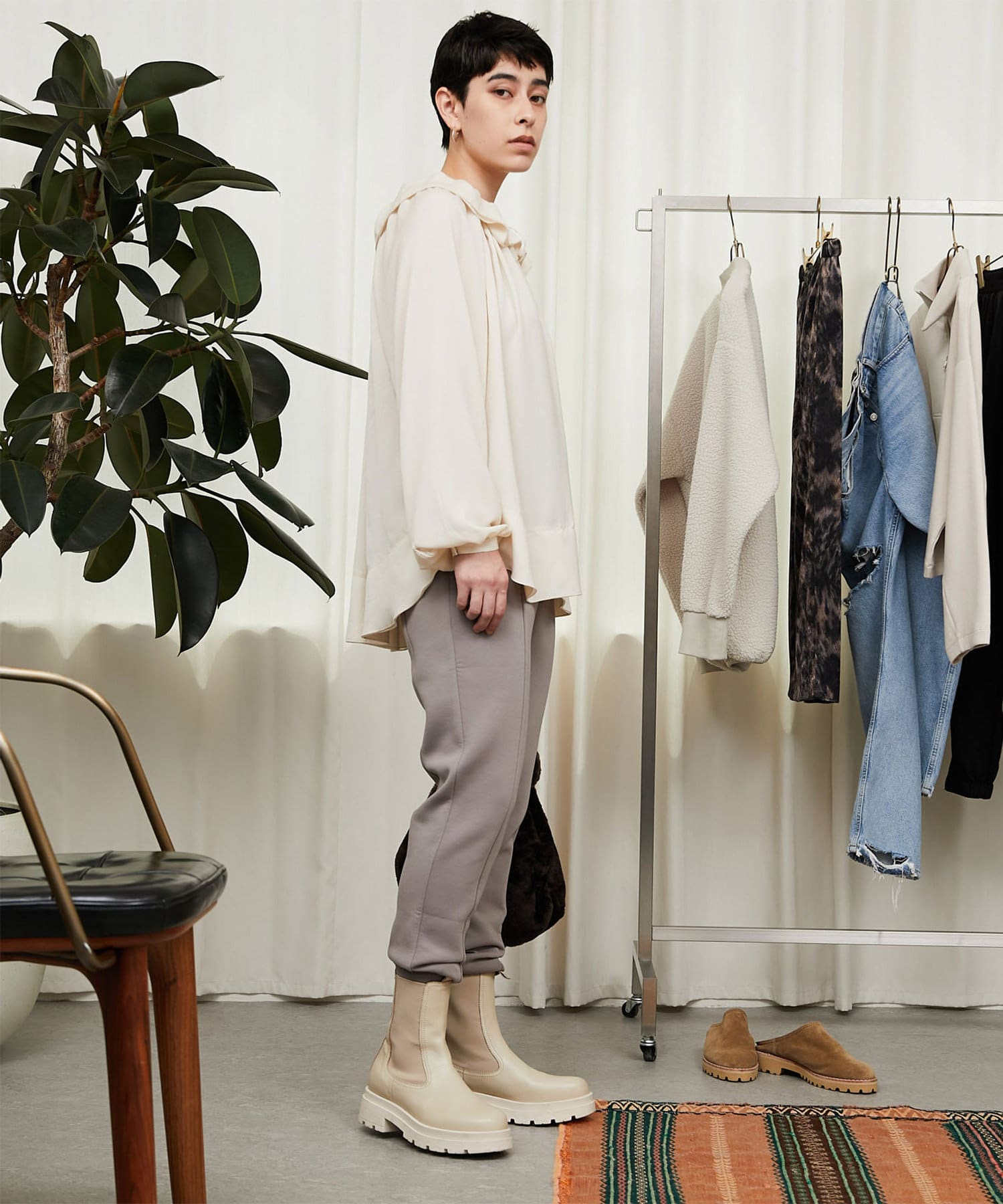 色のグラデーション、ヴィンテージ感漂うワークアイテム・・・ ギャラリーのようなクローゼットの中から 組み合わせをデザインするようにファッションを楽しむ。
