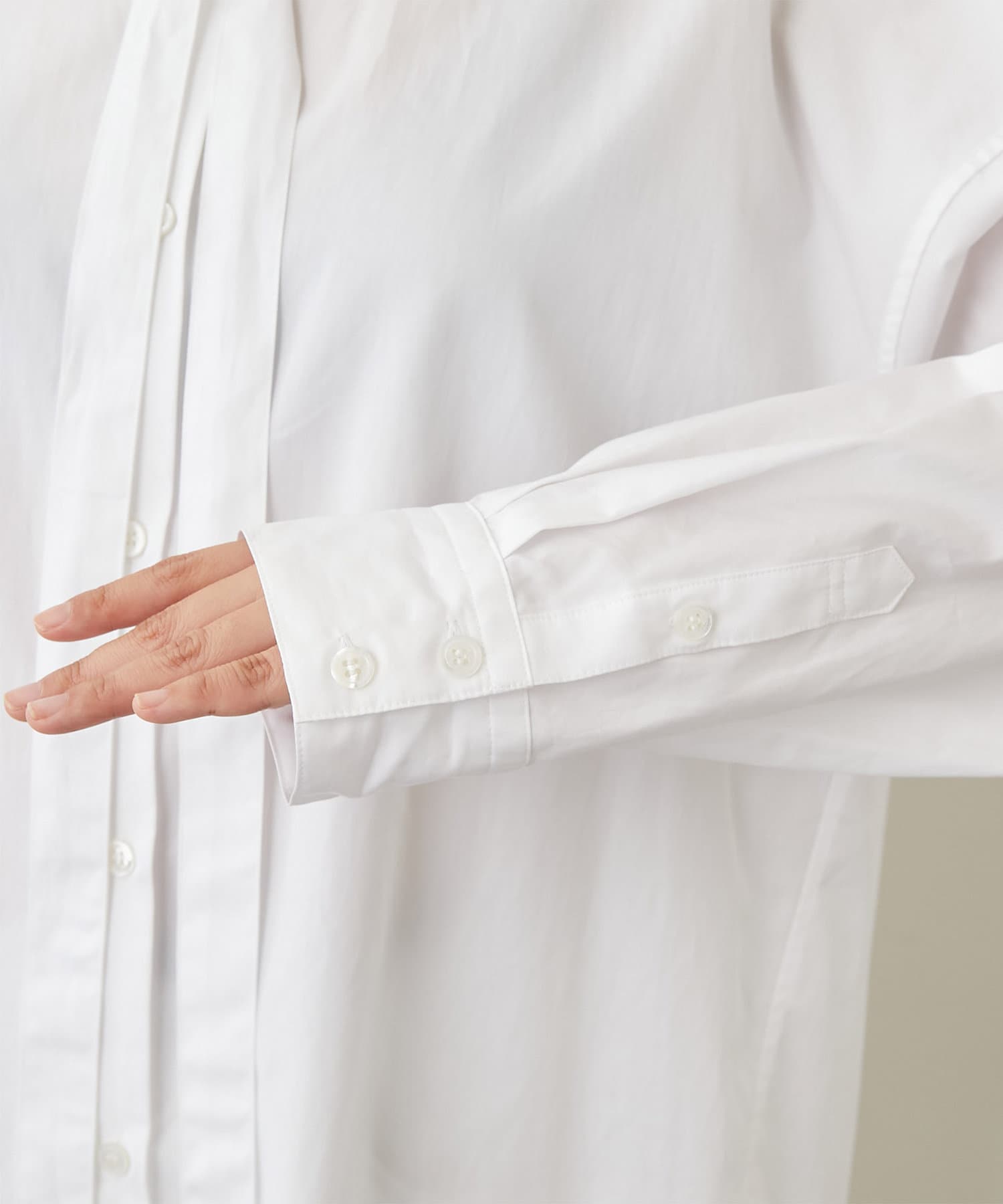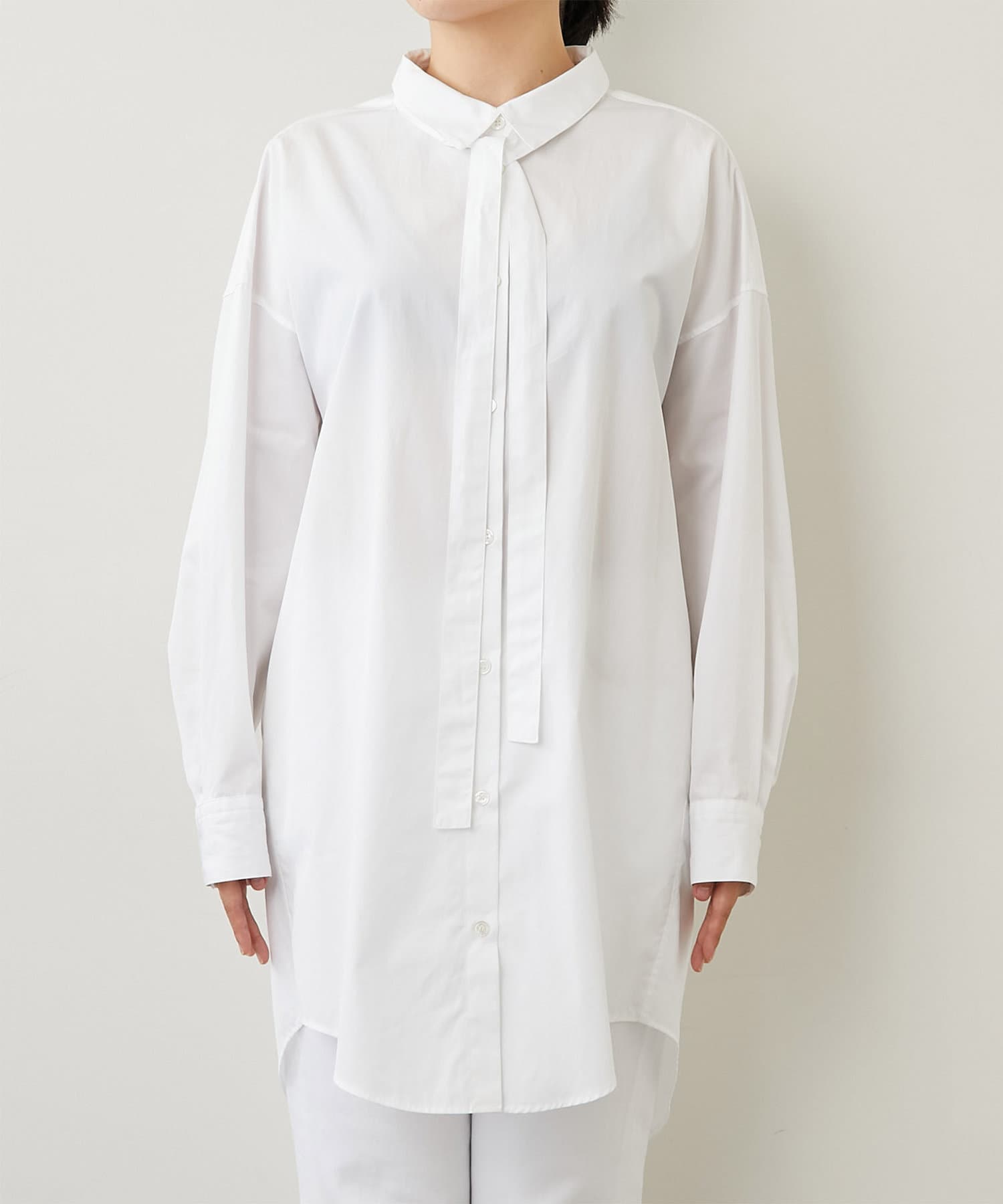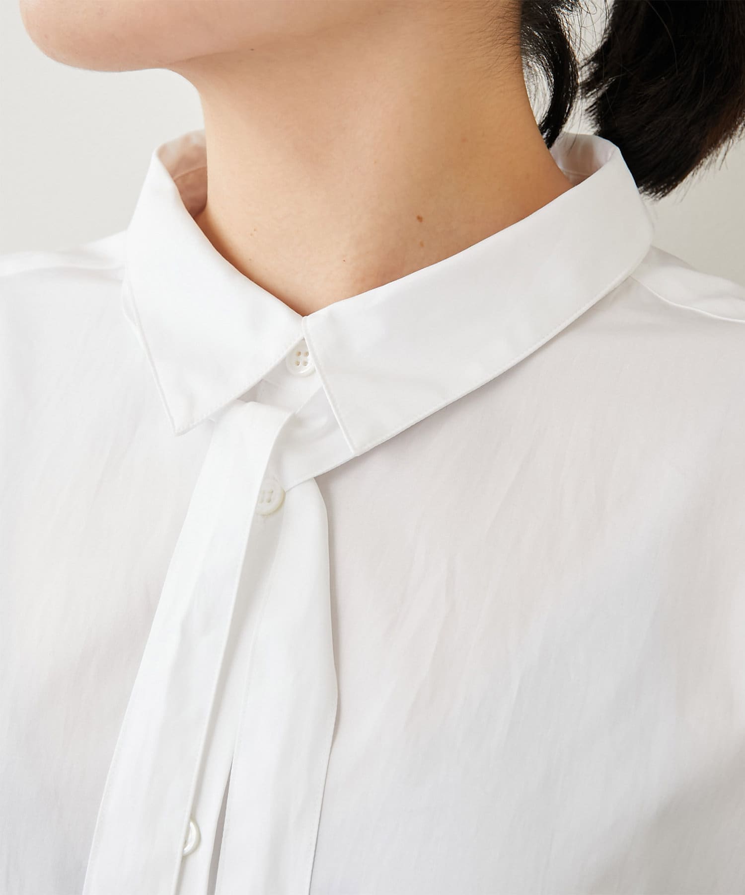 バッグスタイルにタックを入れ、華奢な襟はボタンを外してラフに着ても適度に襟周りが立ち、取り外し可能なタイのデザインがマスキュリンな雰囲気を際立てます。
