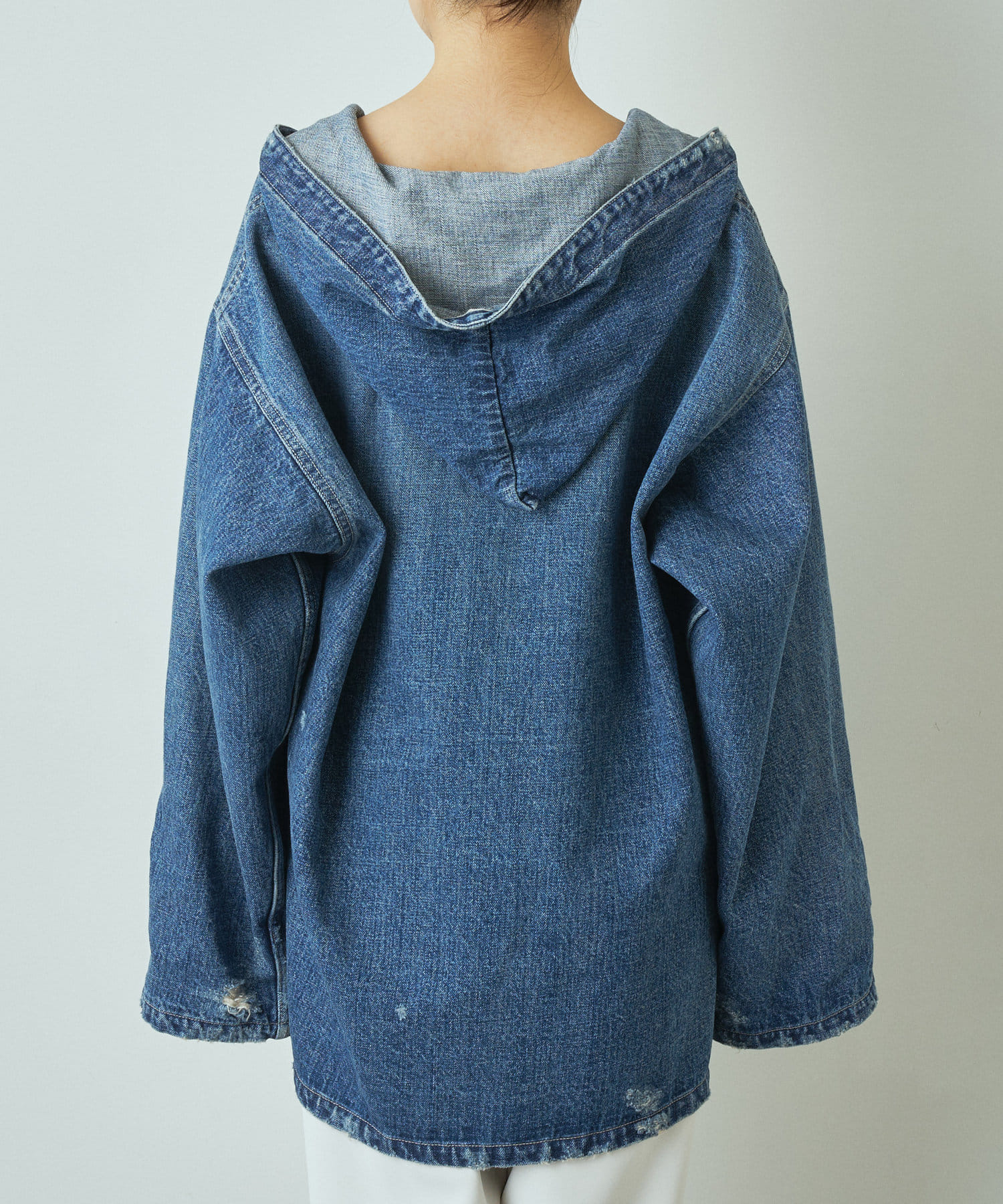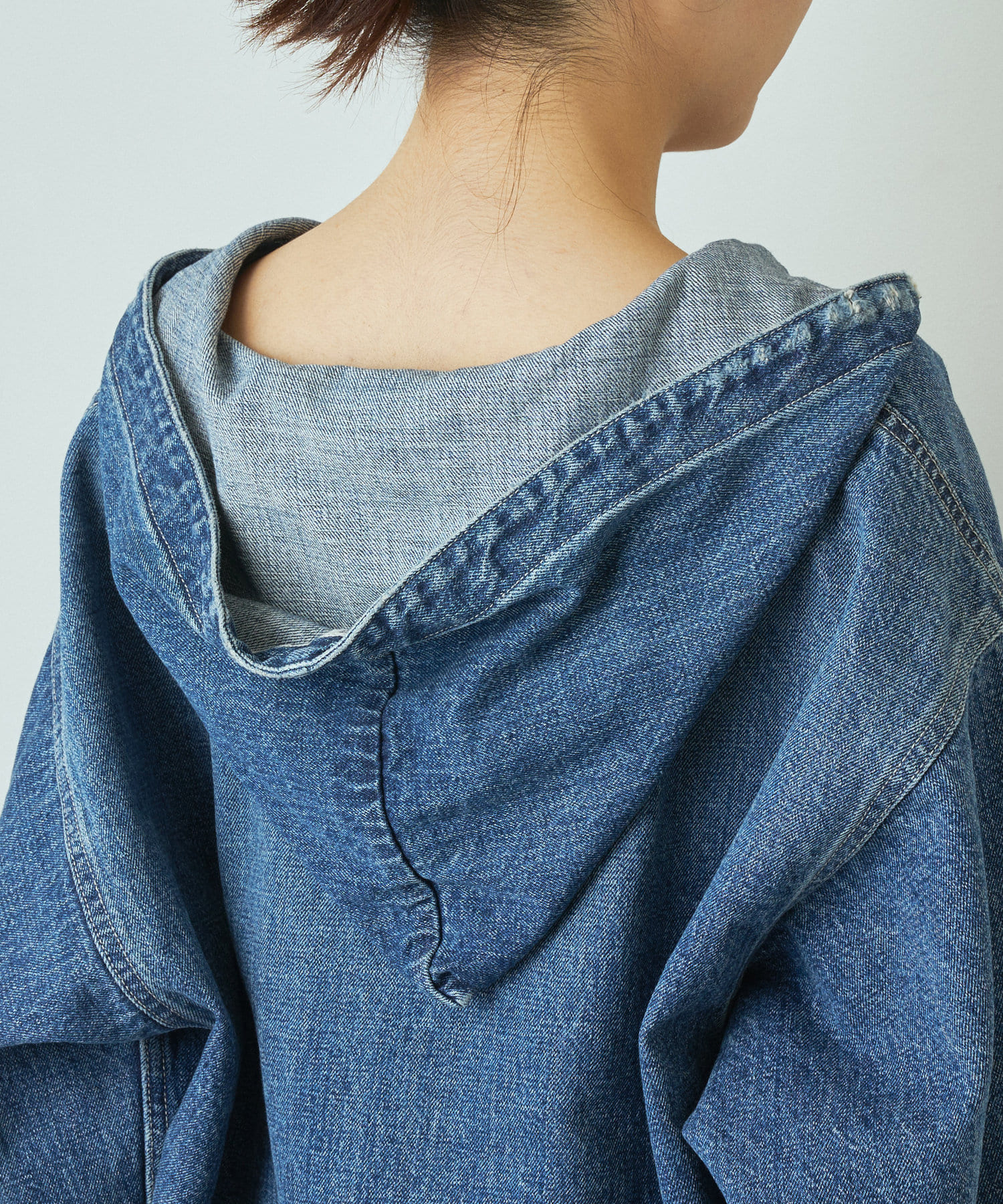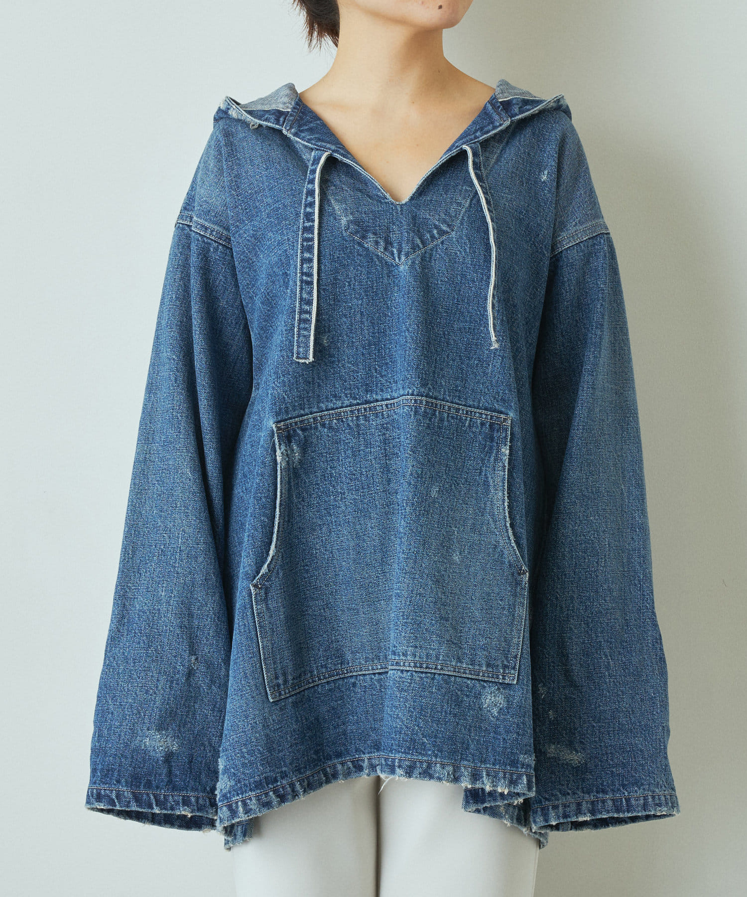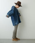 ありそうでなかったデニム素材のメキシカンパーカーは、一枚で様になる個性的なアイテムでありながら、馴染みのある素材感が合わせるボトムを選びにくく、大人の女性にもトライしていただきやすいアイテムです。