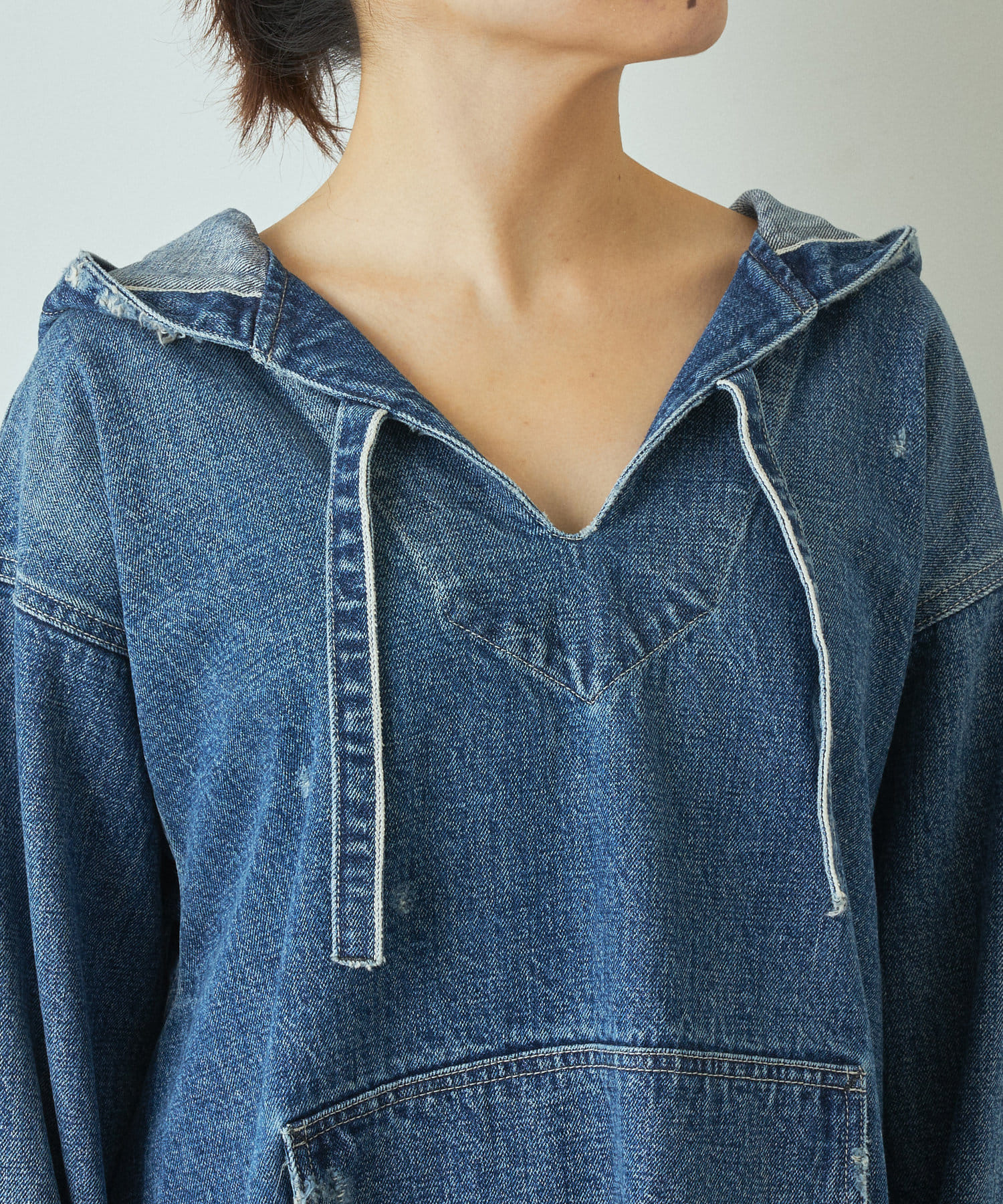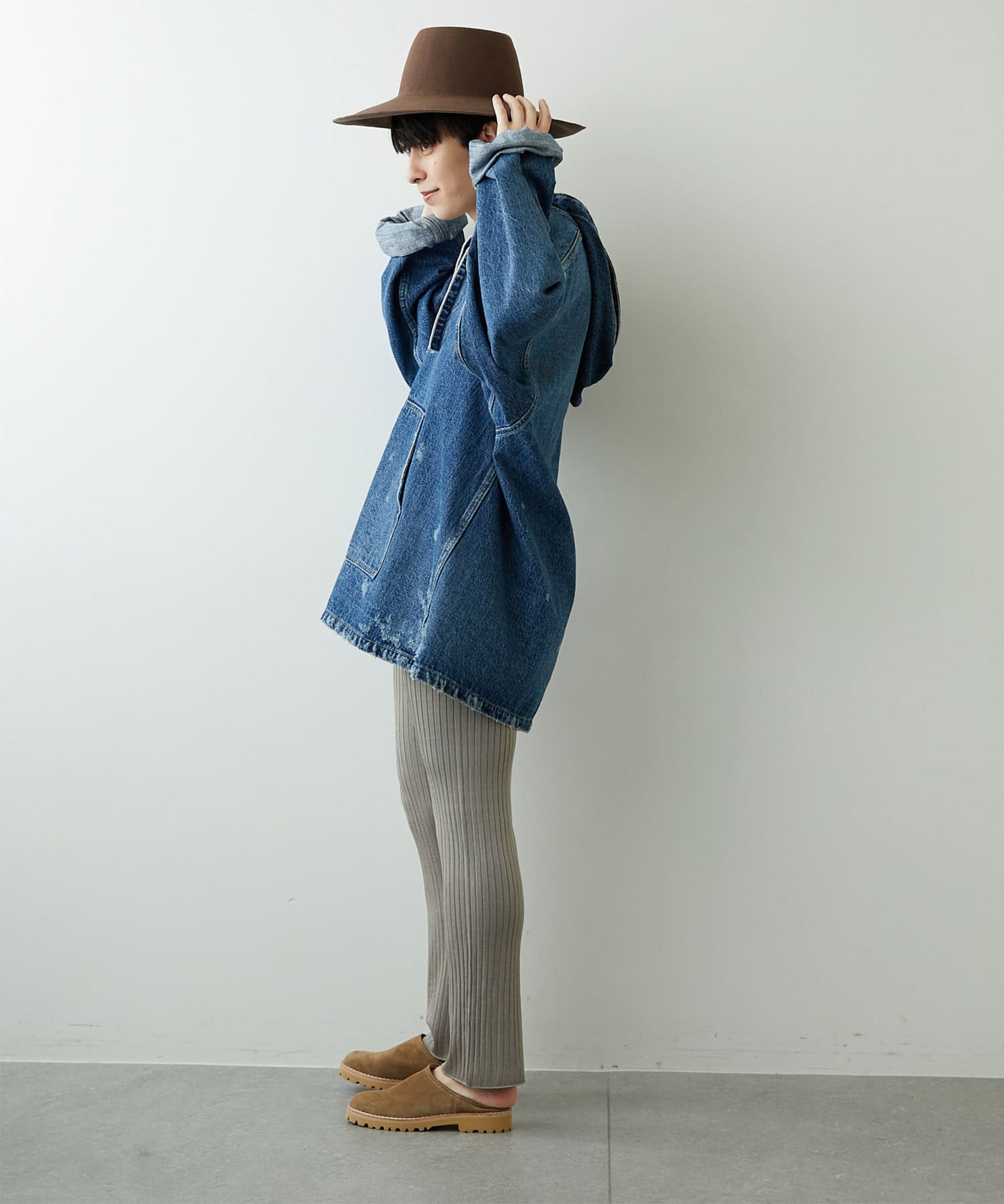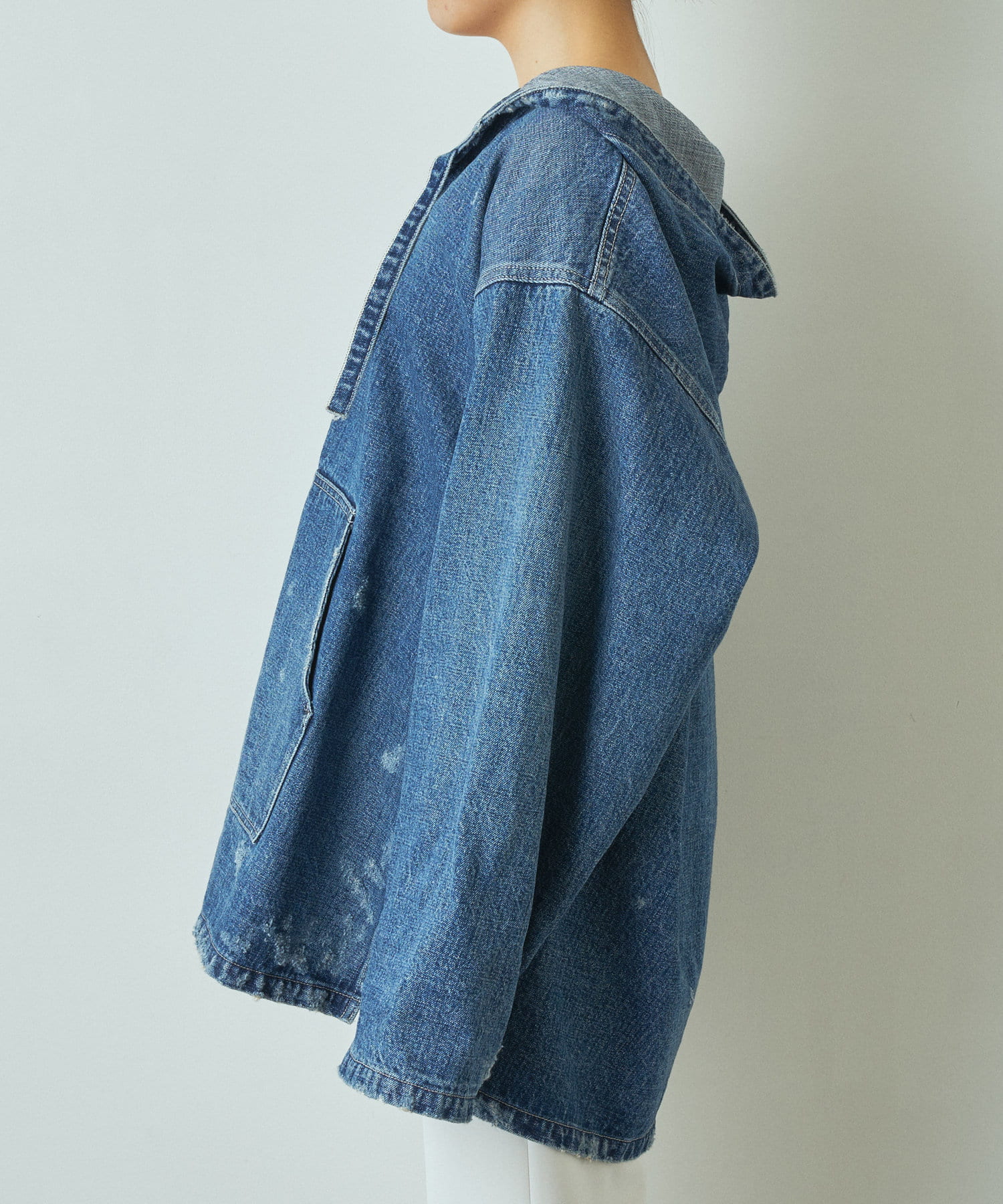 ありそうでなかったデニム素材のメキシカンパーカーは、一枚で様になる個性的なアイテムでありながら、馴染みのある素材感が合わせるボトムを選びにくく、大人の女性にもトライしていただきやすいアイテムです。