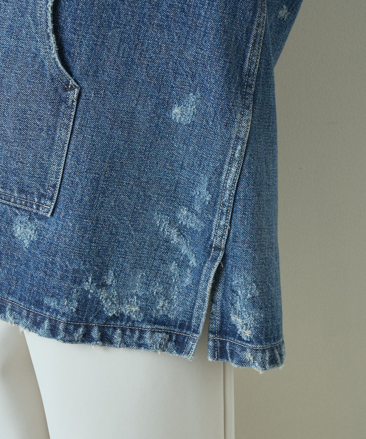 ウォッシュ処理、ダメージ加工を施し、ヴィンテージ感の漂う風合いにこだわった手間暇の掛けられた一着。